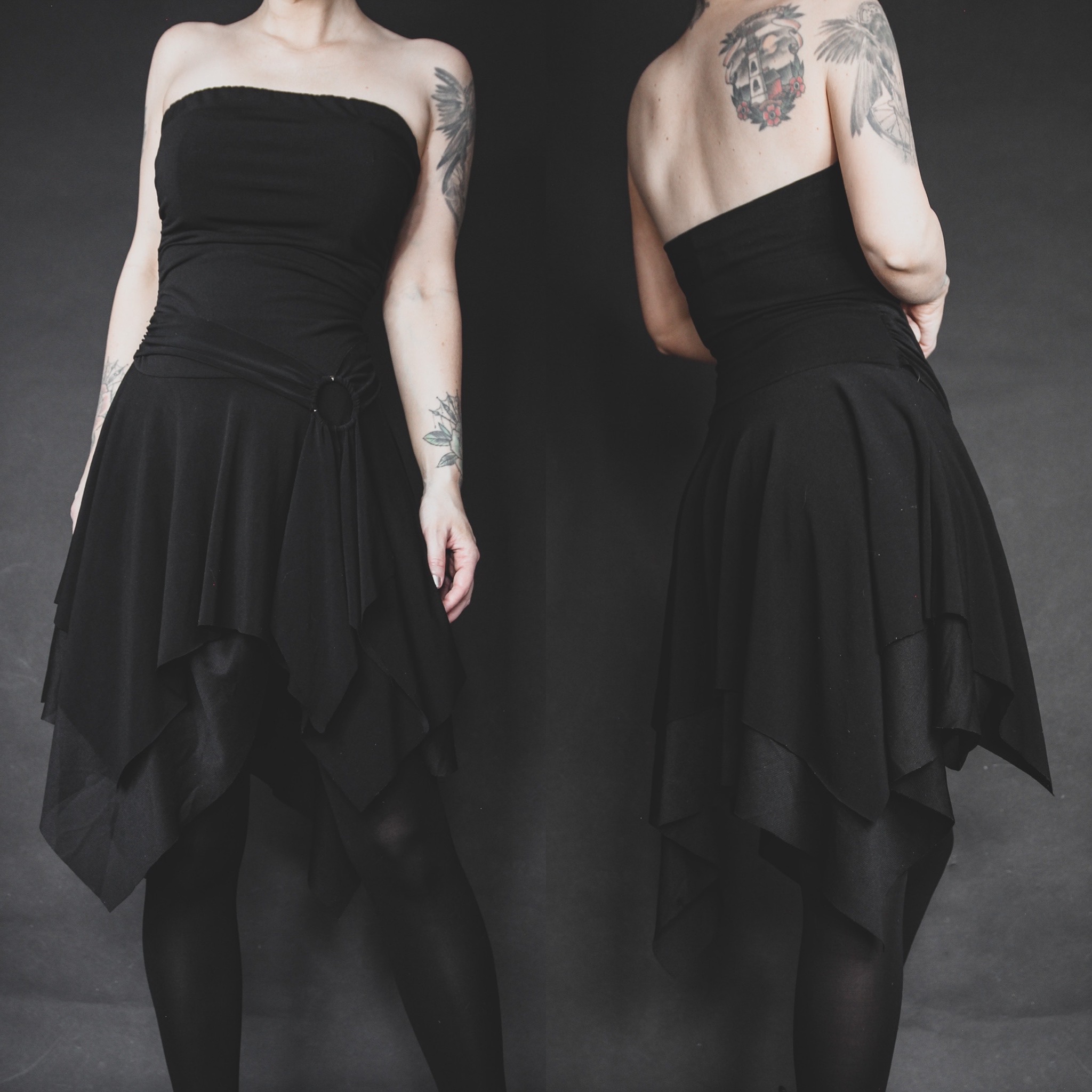 Vintage 90s midi dress. Fairycore vibes! Super soft, slinky opaque poly-spandex fabric with plenty of stretch all over. Asymmetrical hemline with layers of mesh. Drop waist with silver O-ring wrap detail. Strapless cut with super flattering ruching and a hidden elastic band to help keep it up. If you’re handy with a needle and thread, you can easy add any kind of elastic or ribbon straps!