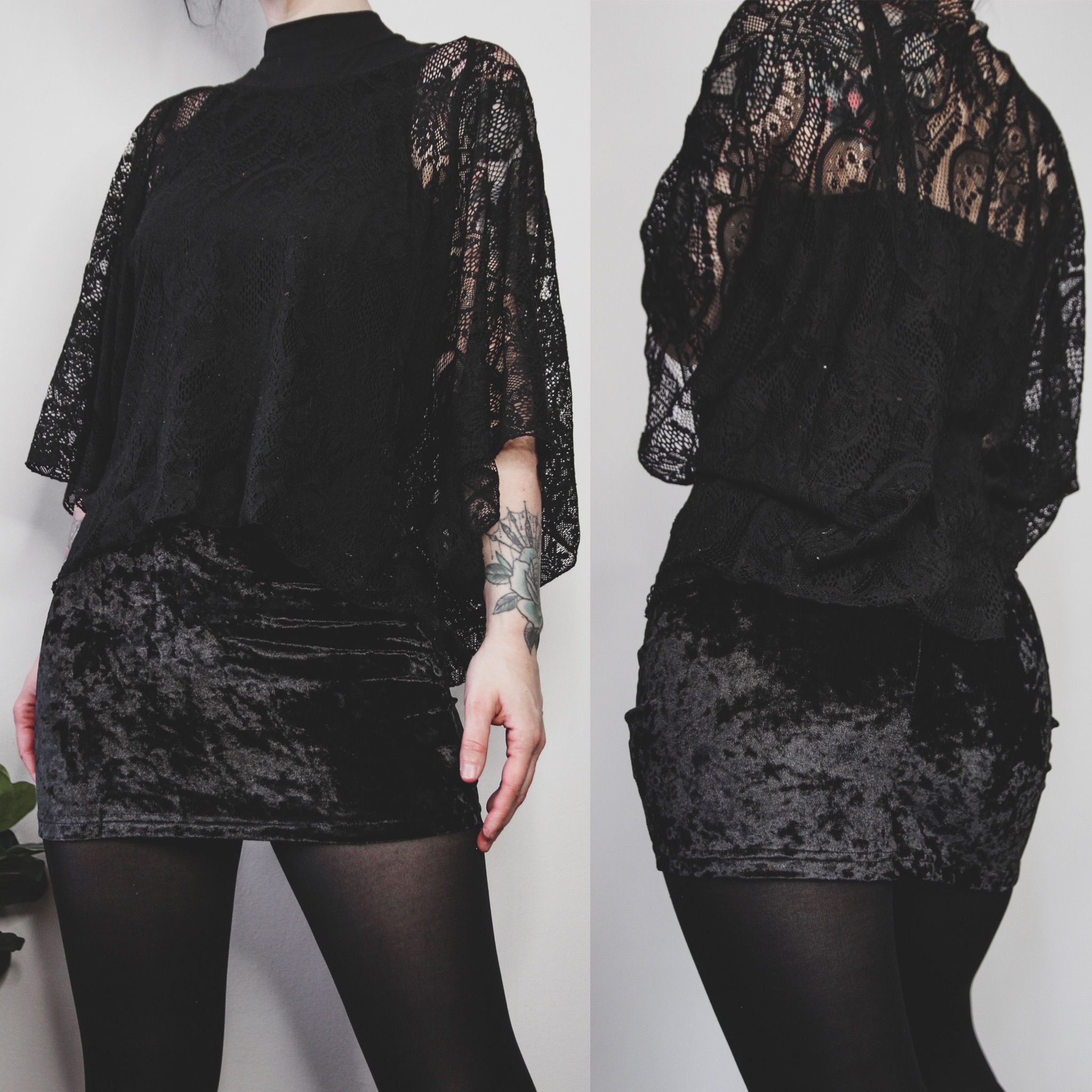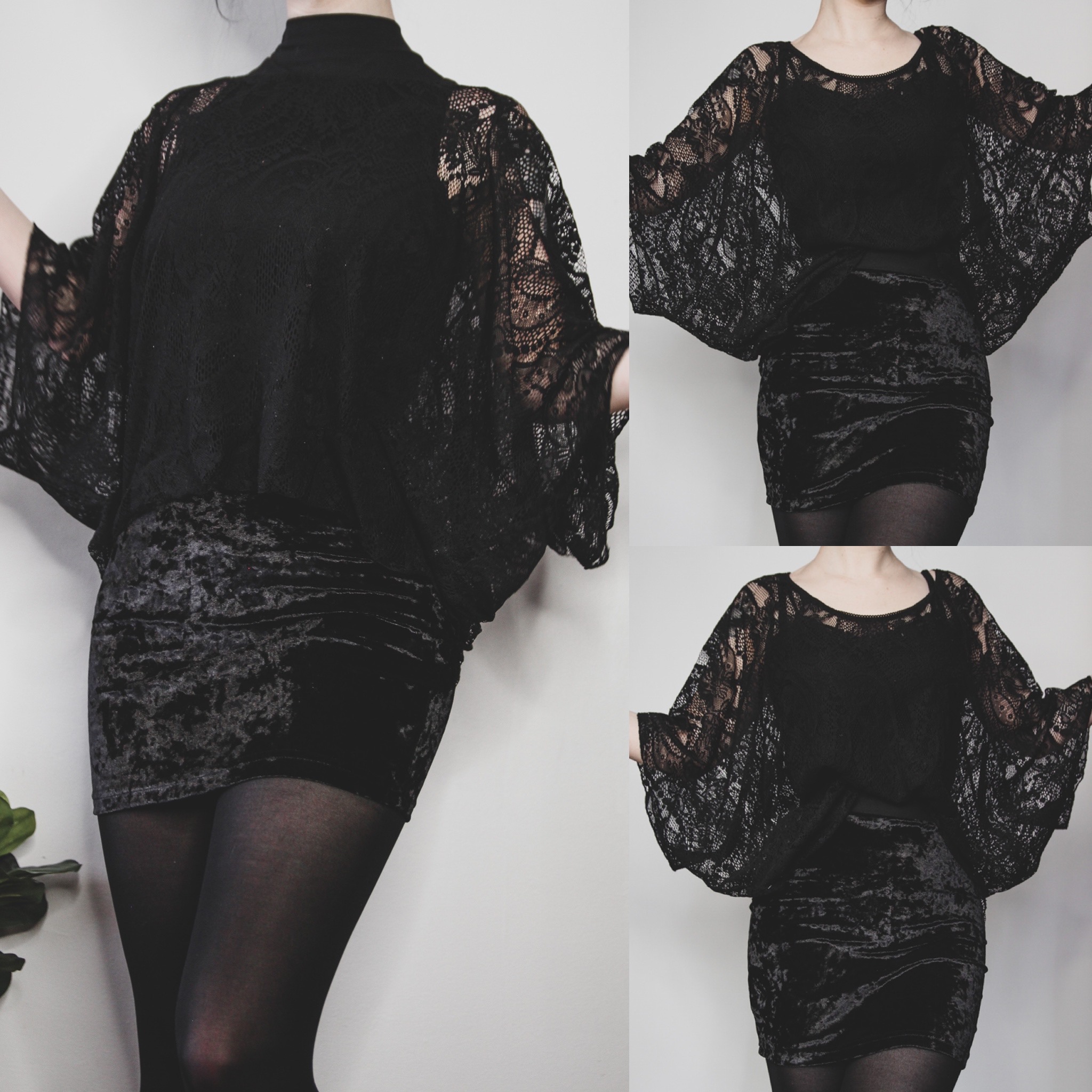 Vero Moda semi-sheer black lace batwing top Hidden arm holes and a flowy, loose fit. Lightweight, soft poly blend lace (no itch factor) Pull-on style, no stretch unlined.