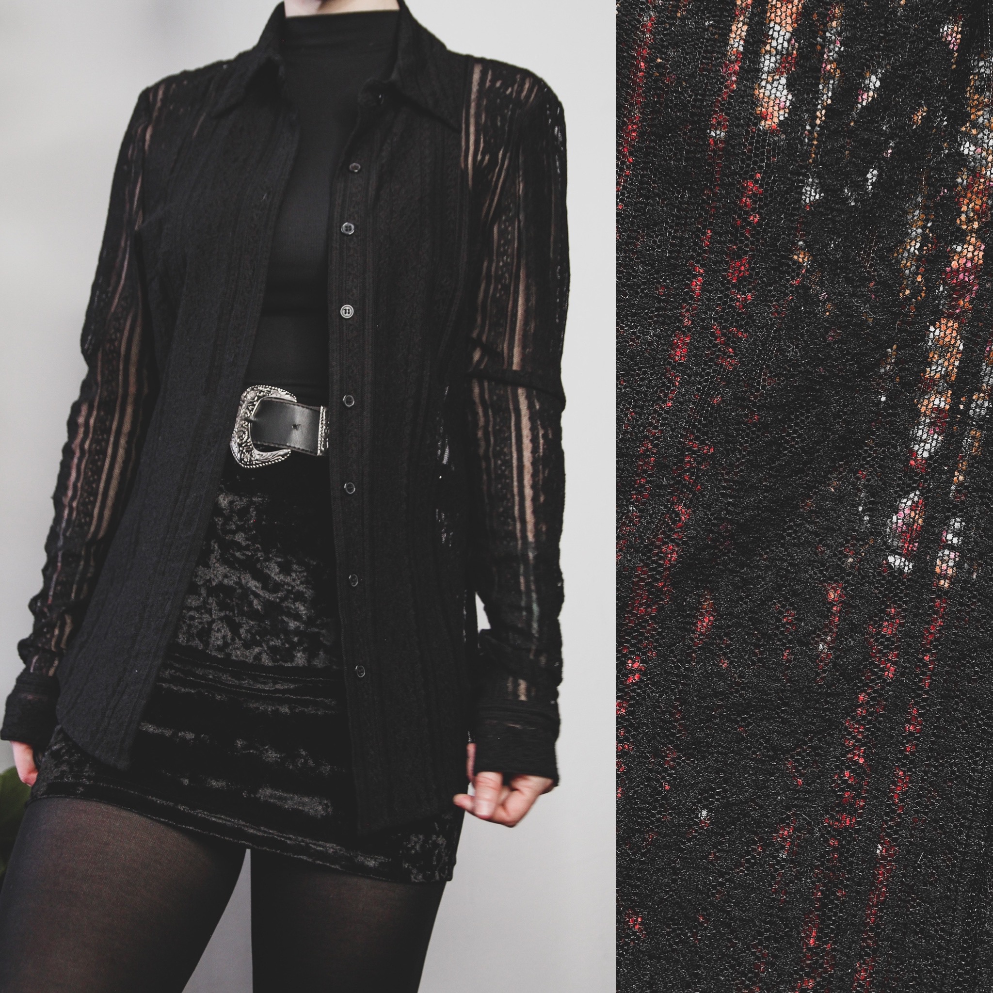 Vintage 90s sheer lace blouse. Striped lace fabric with a bit of stretch. Functional buttons down the front, slim fitted cut. Standard length, not cropped or longline. Soft poly spandex blend fabric with minimal itch factor unless you’re extremely sensitive. Unlined, tank underneath is not included.