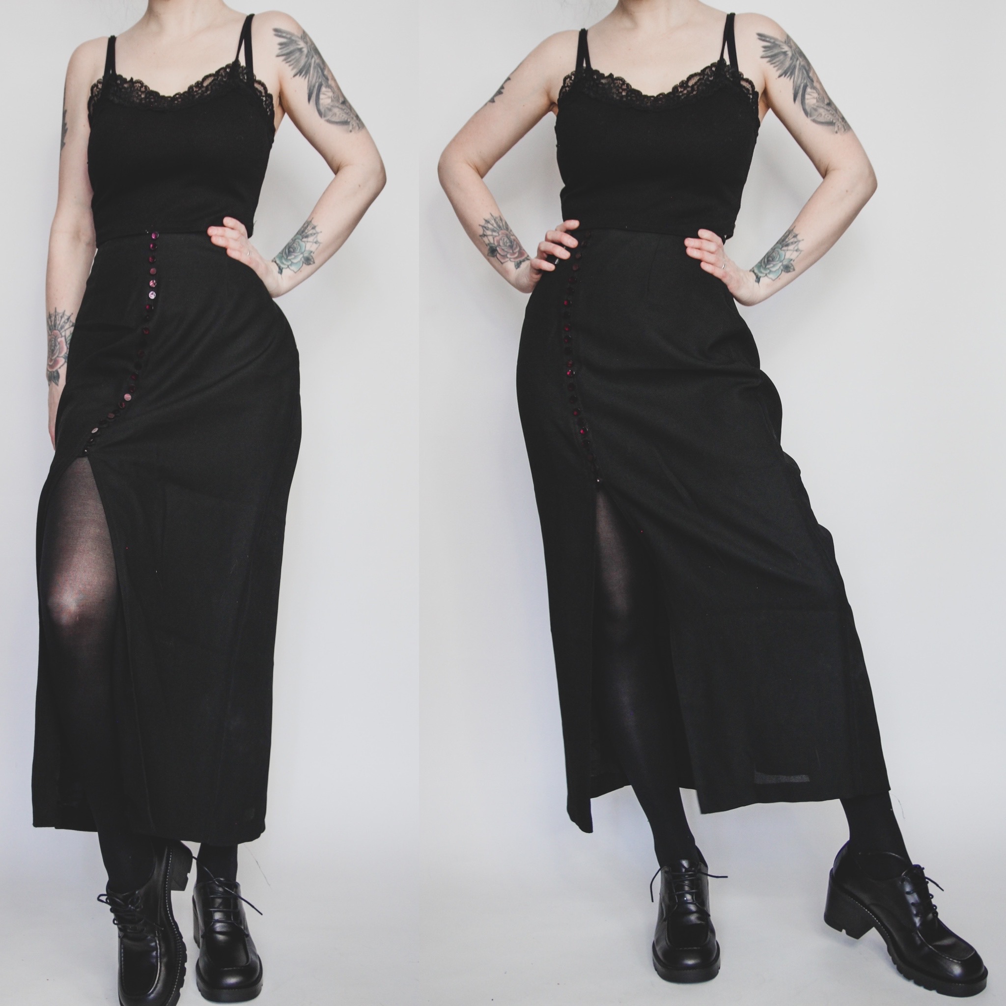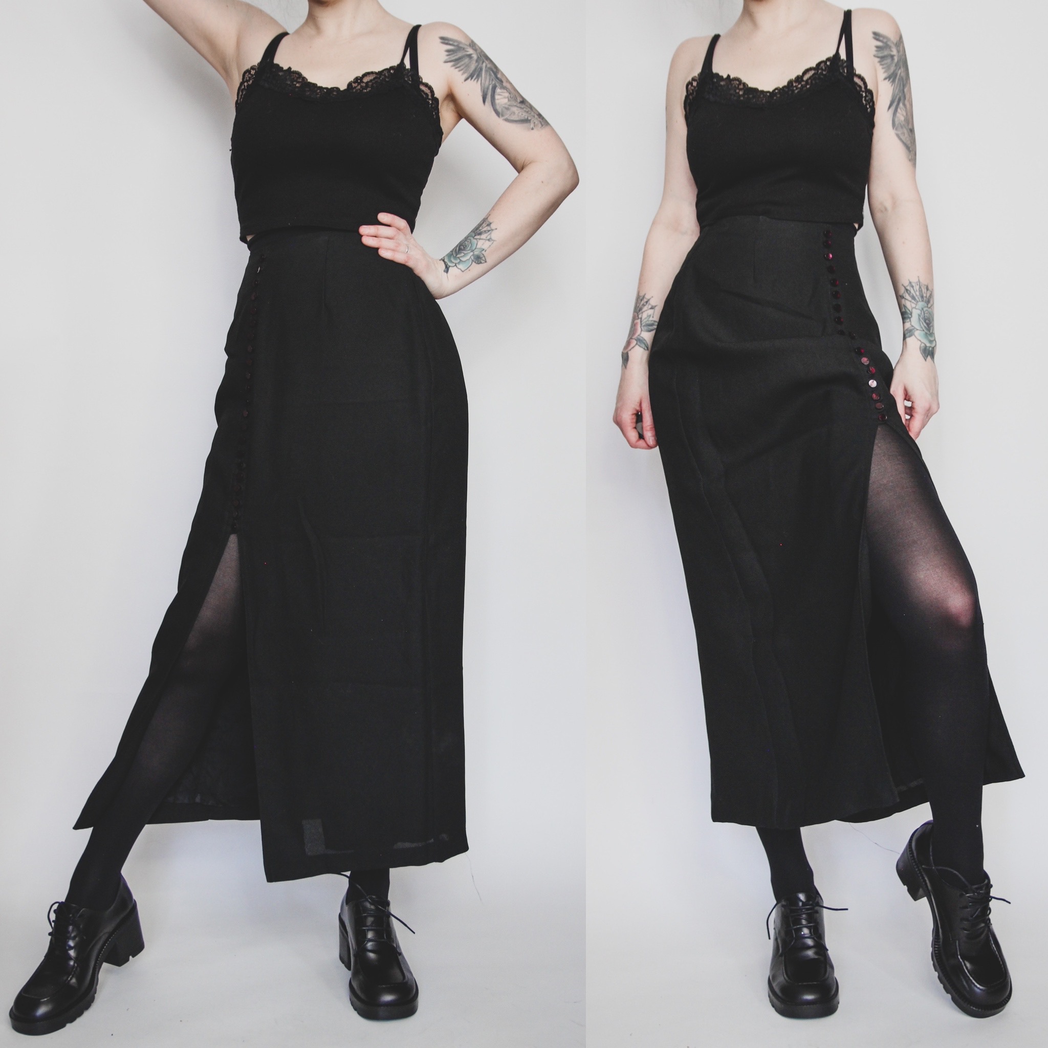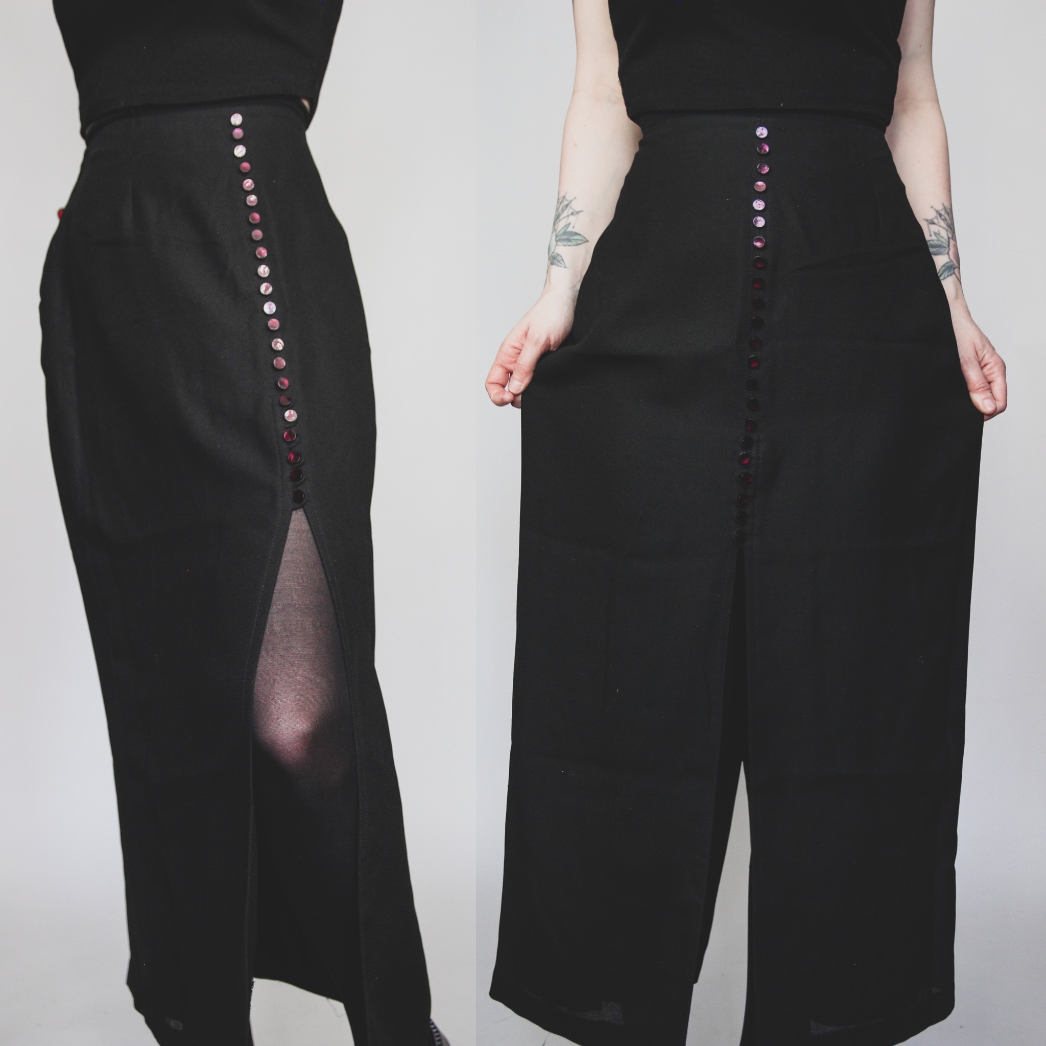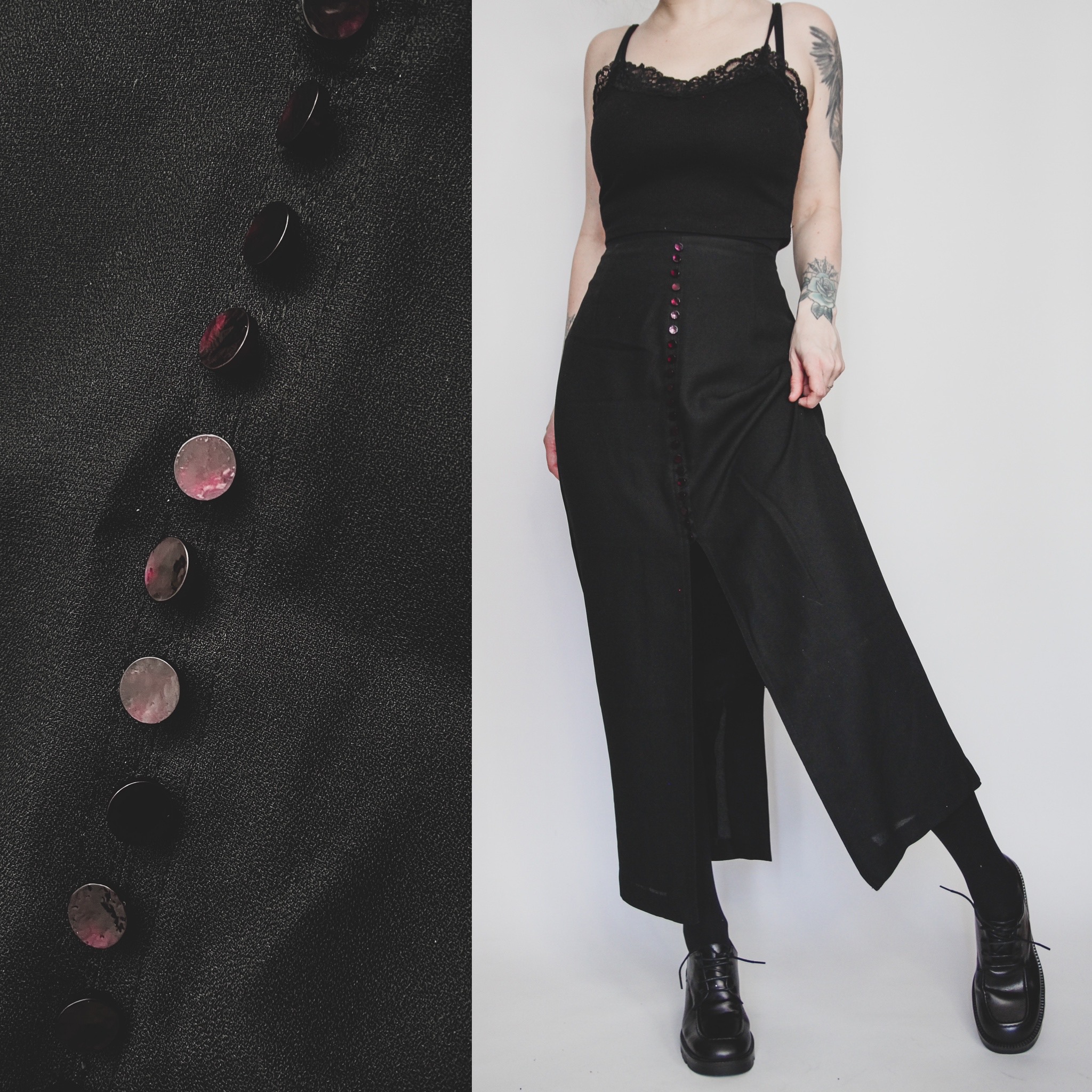 Vintage 80s/90s 42nd Street made in Quebec skirt. Functional purple buttons down the front and super high slits in front and back. This is a fun versatile find and can be styled with the buttons in the front, side or off-center, depending on where you want the slit! Back zip. No stretch. Flowy, lightweight semi-sheer polyester, fully lined in black poly satin.