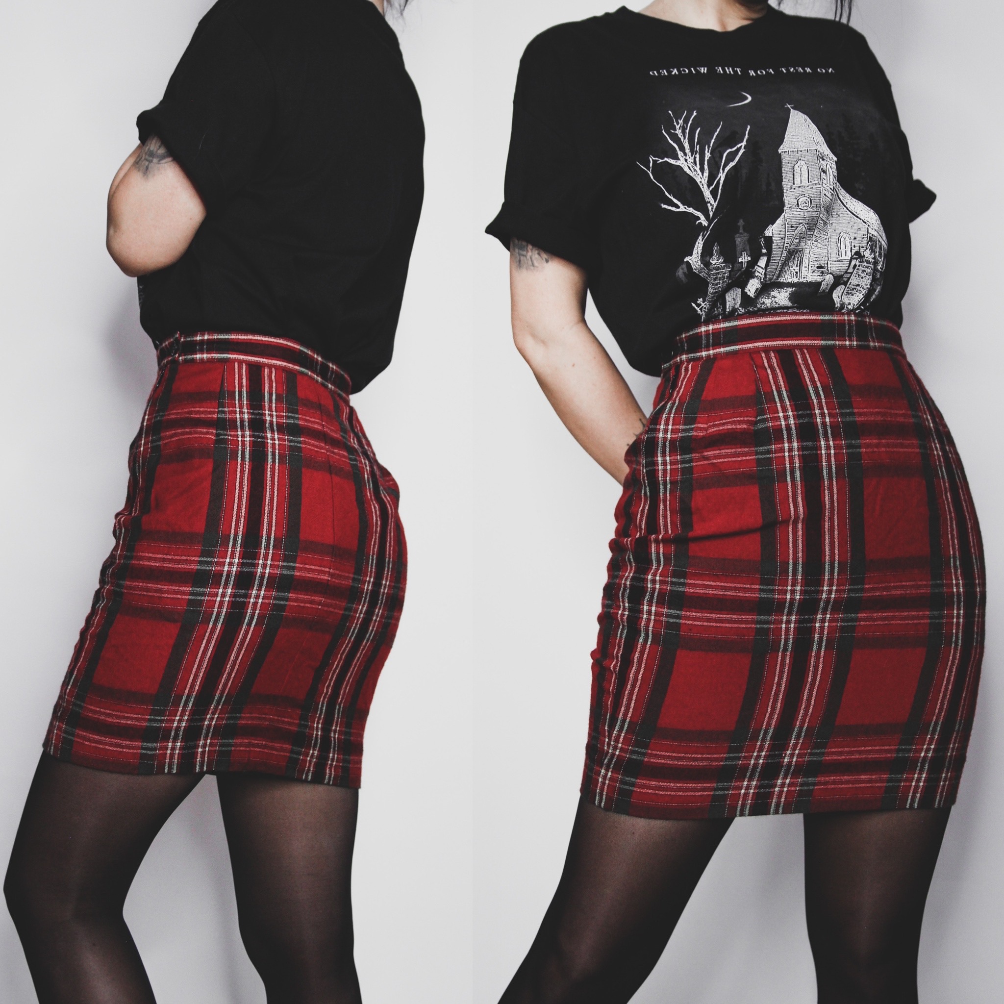 Vintage 90s Et Vous red plaid pencil skirt. Red, cream, black and forest green plaid. Side zip with button closure at the top. 100% wool but it is very lightweight fabric, unlined with no stretch. Super flattering high-waist hourglass cut.