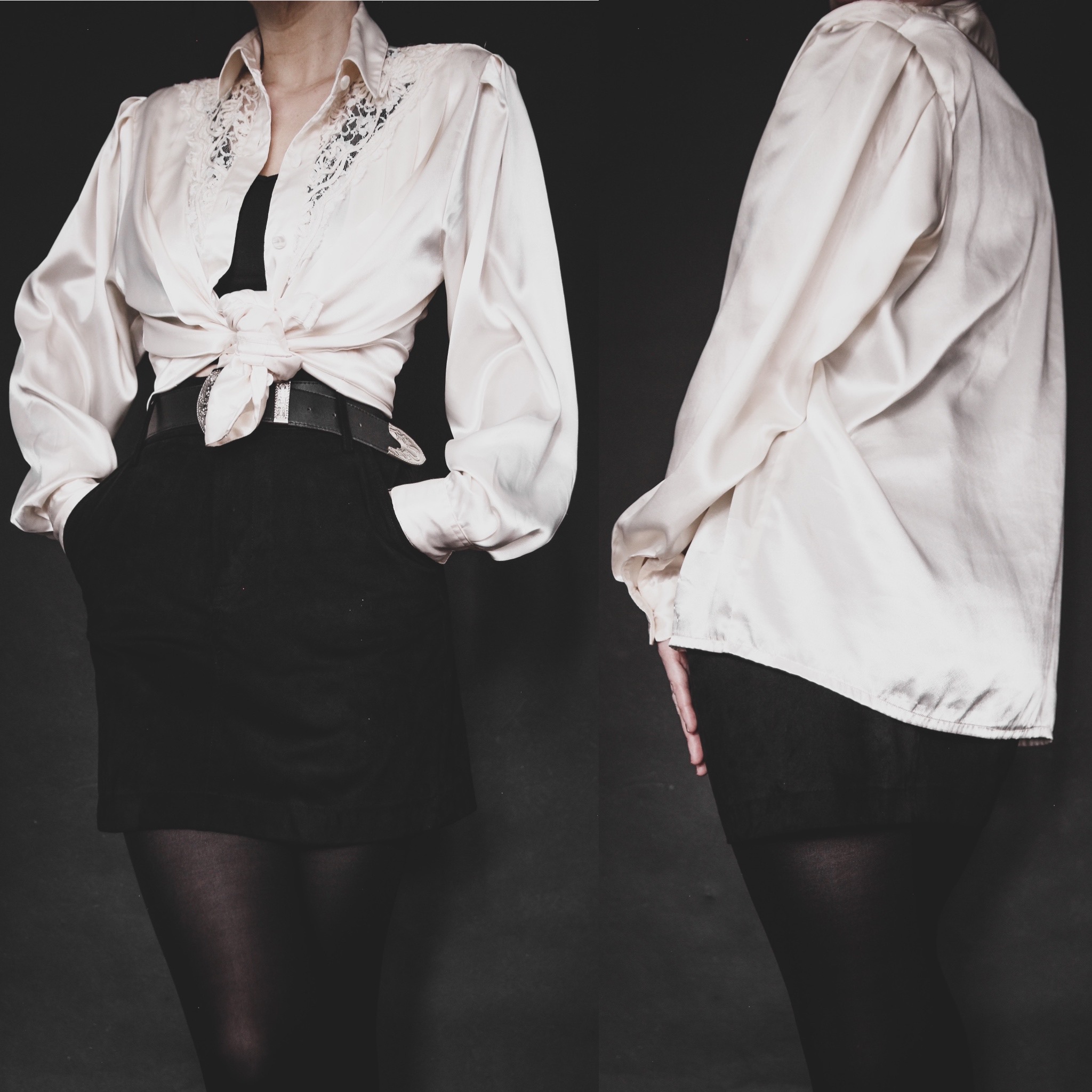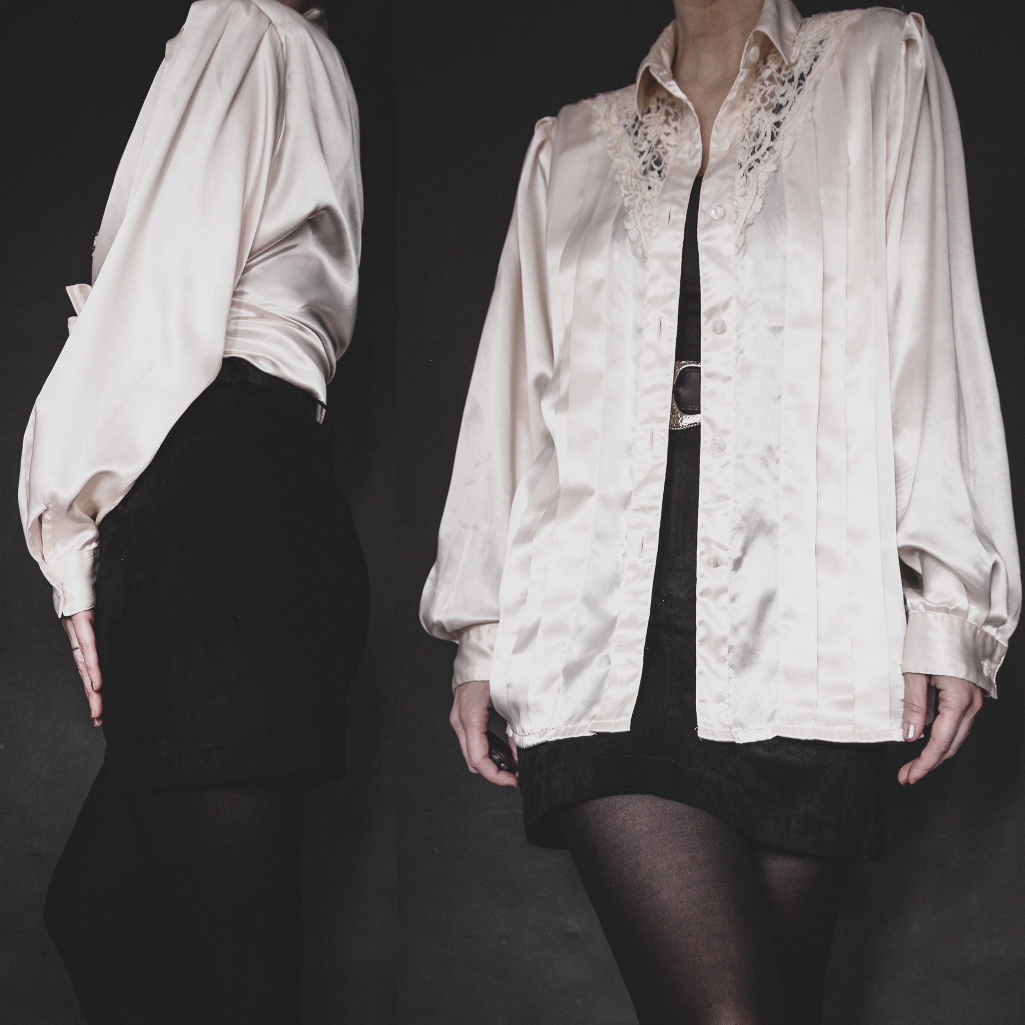 Vintage 80s Serge Nancel Paris cream satin blouse. Lestat meets Fran Drescher vibes! Warm ivory color, definitely closer to beige than white. Gorgeous lace detailing at the bust, pleated tuxedo front, and flowy sleeves with buttoned cuffs. Front buttons are functional. Boxy cut, standard length, no stretch, unlined. Original shoulder pads are intact but they can be easily removed if they're not your thing.