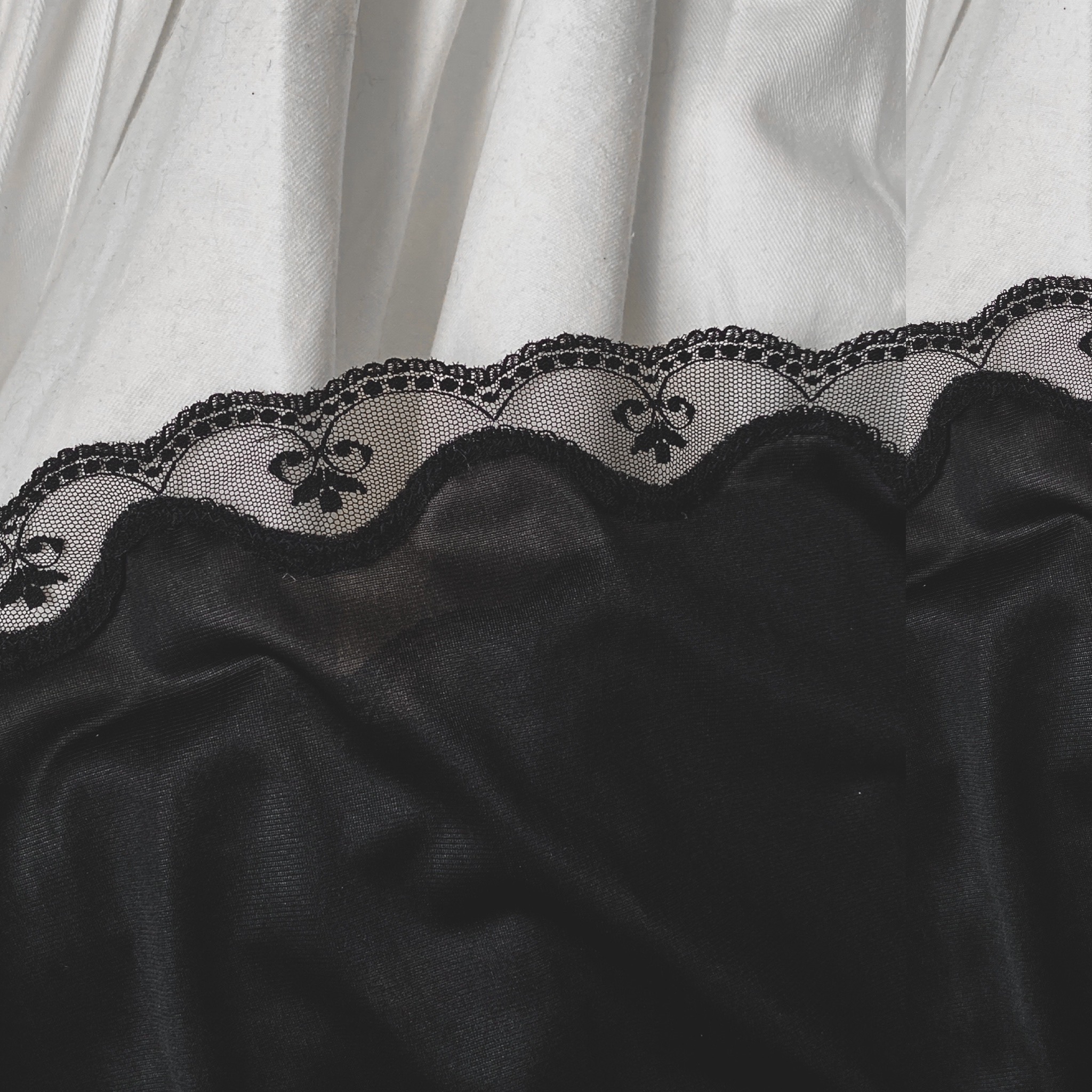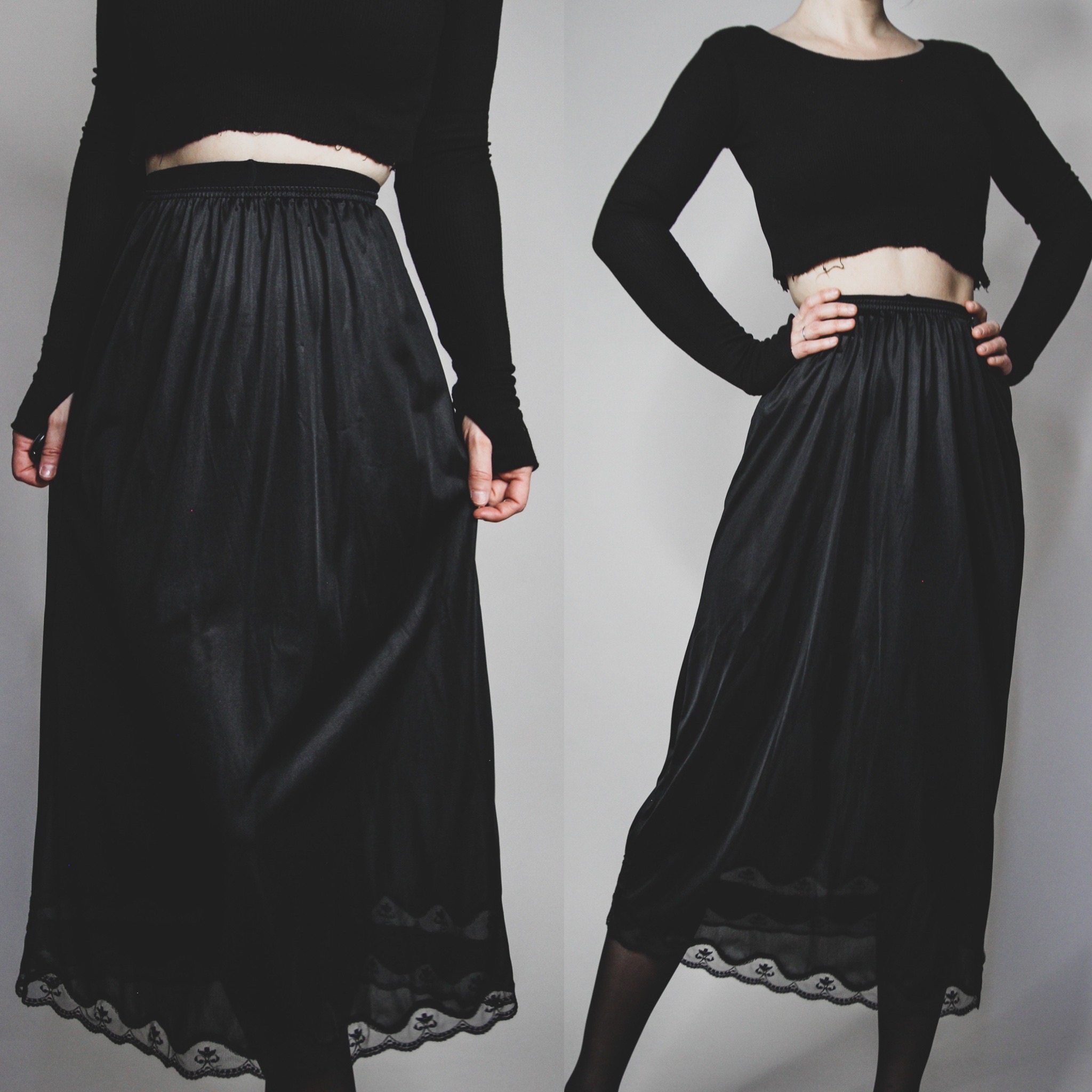 Vintage 80s black satin slip skirt. Stretchy elastic waist, pull on style. Beautiful lace detailing at the hem. Perfect for layering under your favorite skirts and dresses, or wear it alone in hot weather!