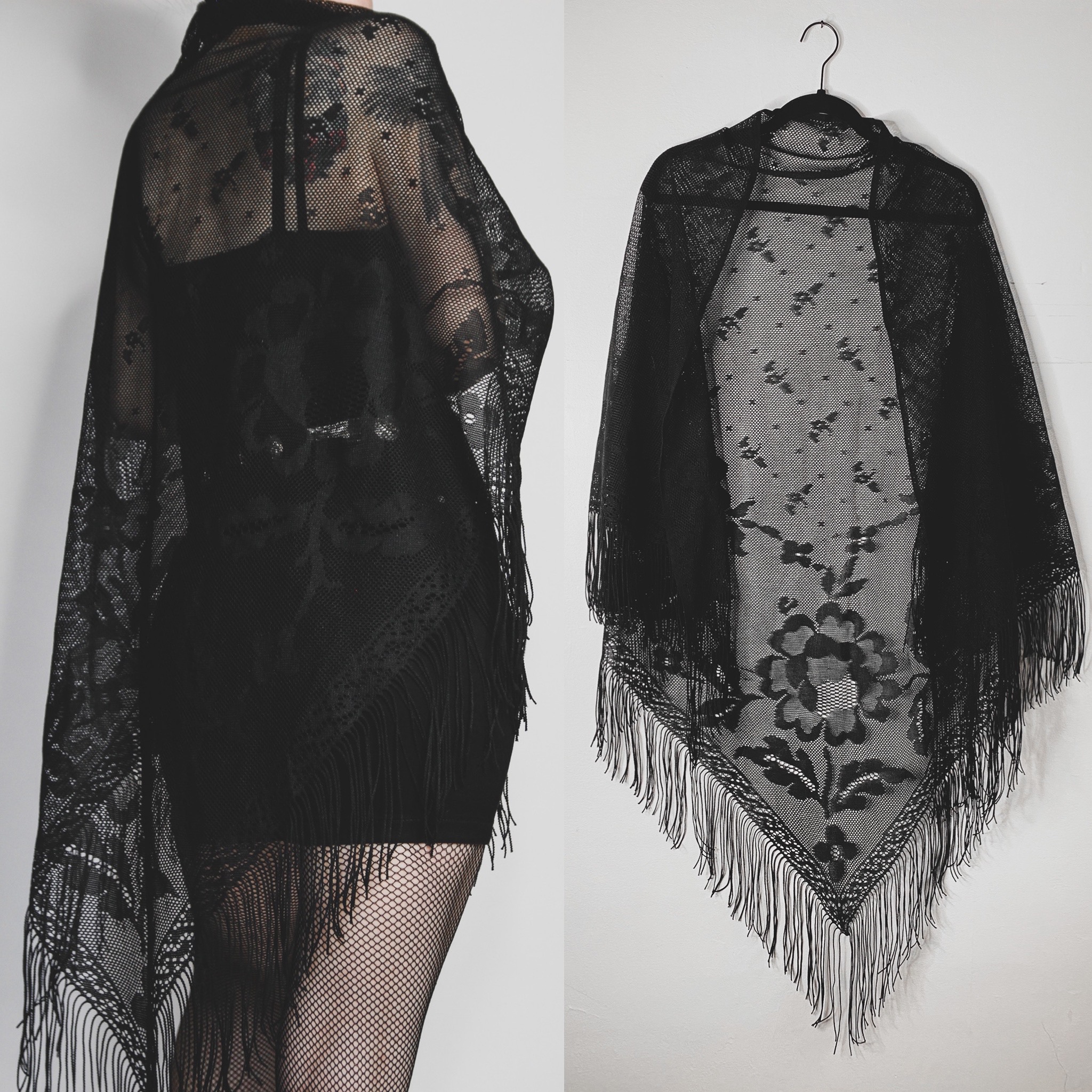 This one is black mesh lace with a dainty floral motif and long luxe fringe on two sides. Can be worn over the shoulders in place of a cardigan or jacket, styled as a scarf, belted or knotted in the back and worn as a top, tied as a wrap skirt or swim coverup, or even used for home decor - the options are endless! Perfect throwover piece, especially for transitional weather. Works for all seasons and can be dressed up or down. Stevie Nicks would be proud.
