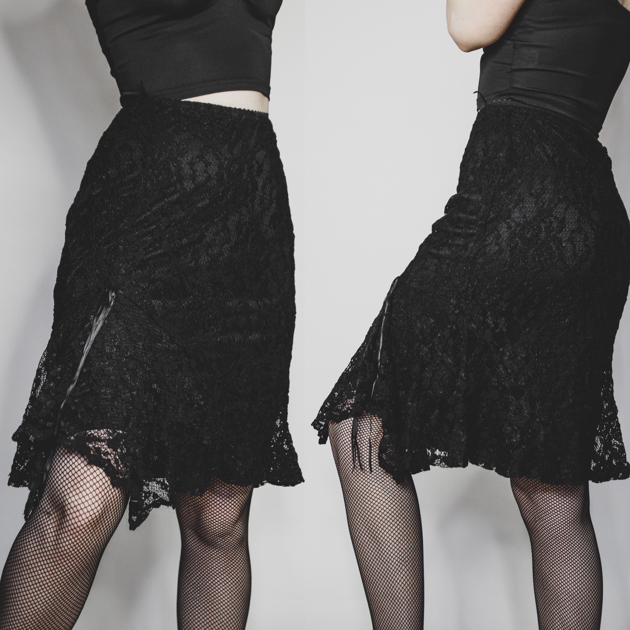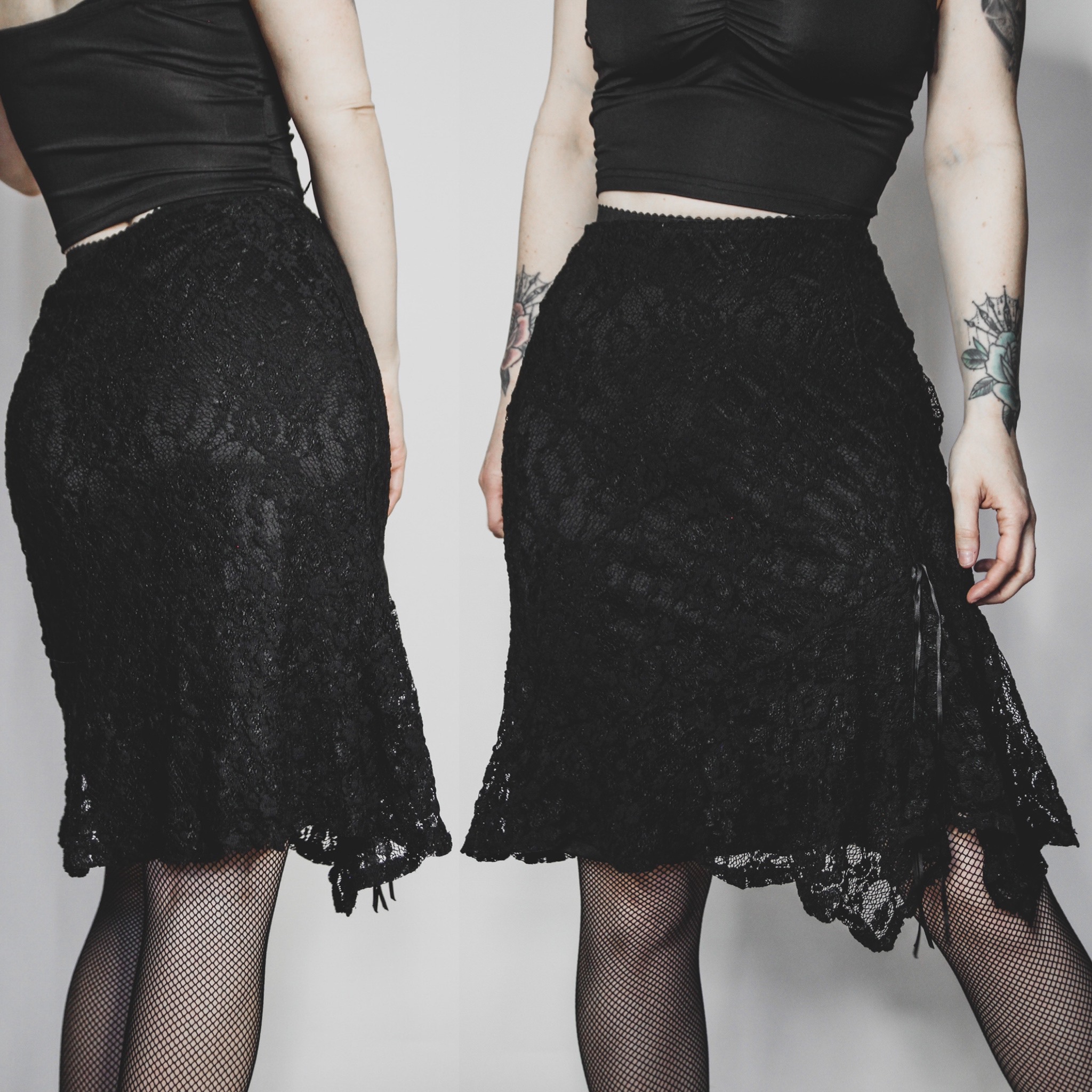 Vintage 90s lace skirt. Soft black lace with a little satin ribbon bow detail on one side. Asymmetrical hemline. Can be worn high or mid-waisted. More of a pencil cut than than a bodycon, but still hugs your curves! Pull-on style with an elastic waist and a bit of stretch all over. Fully lined in black poly satin.