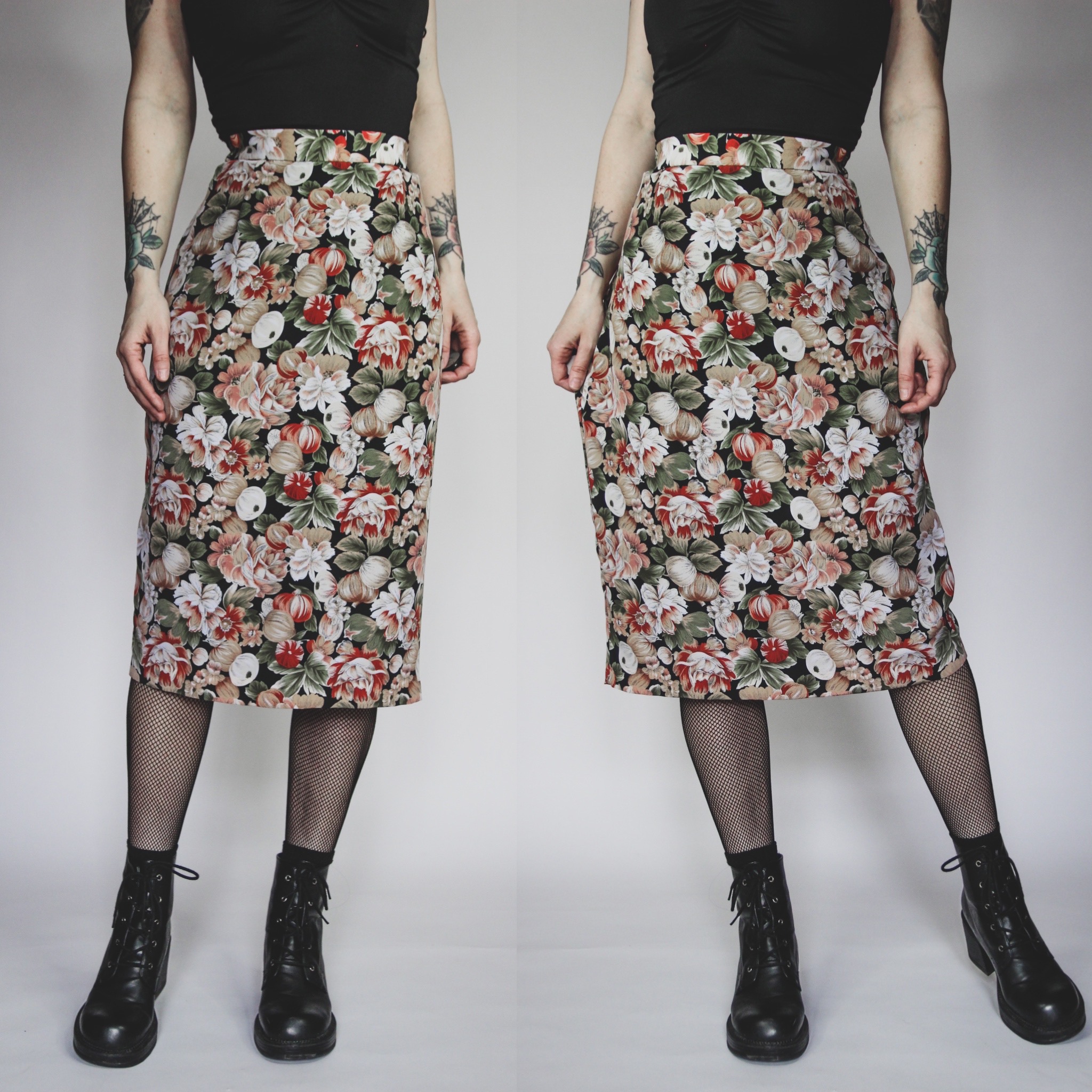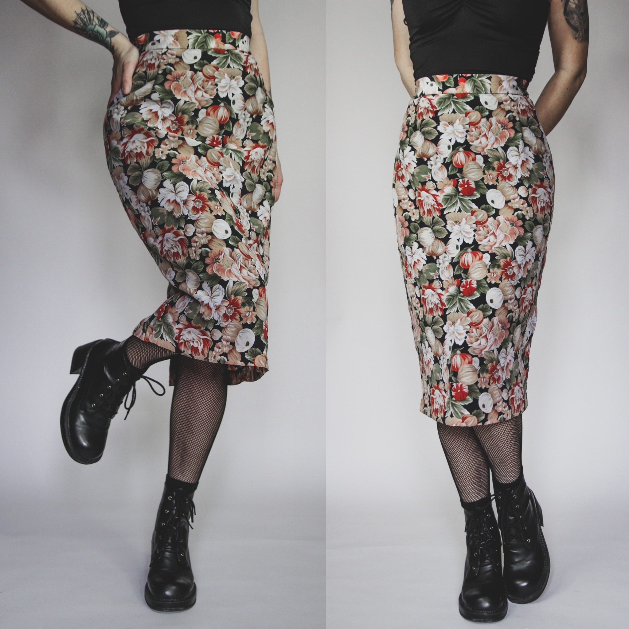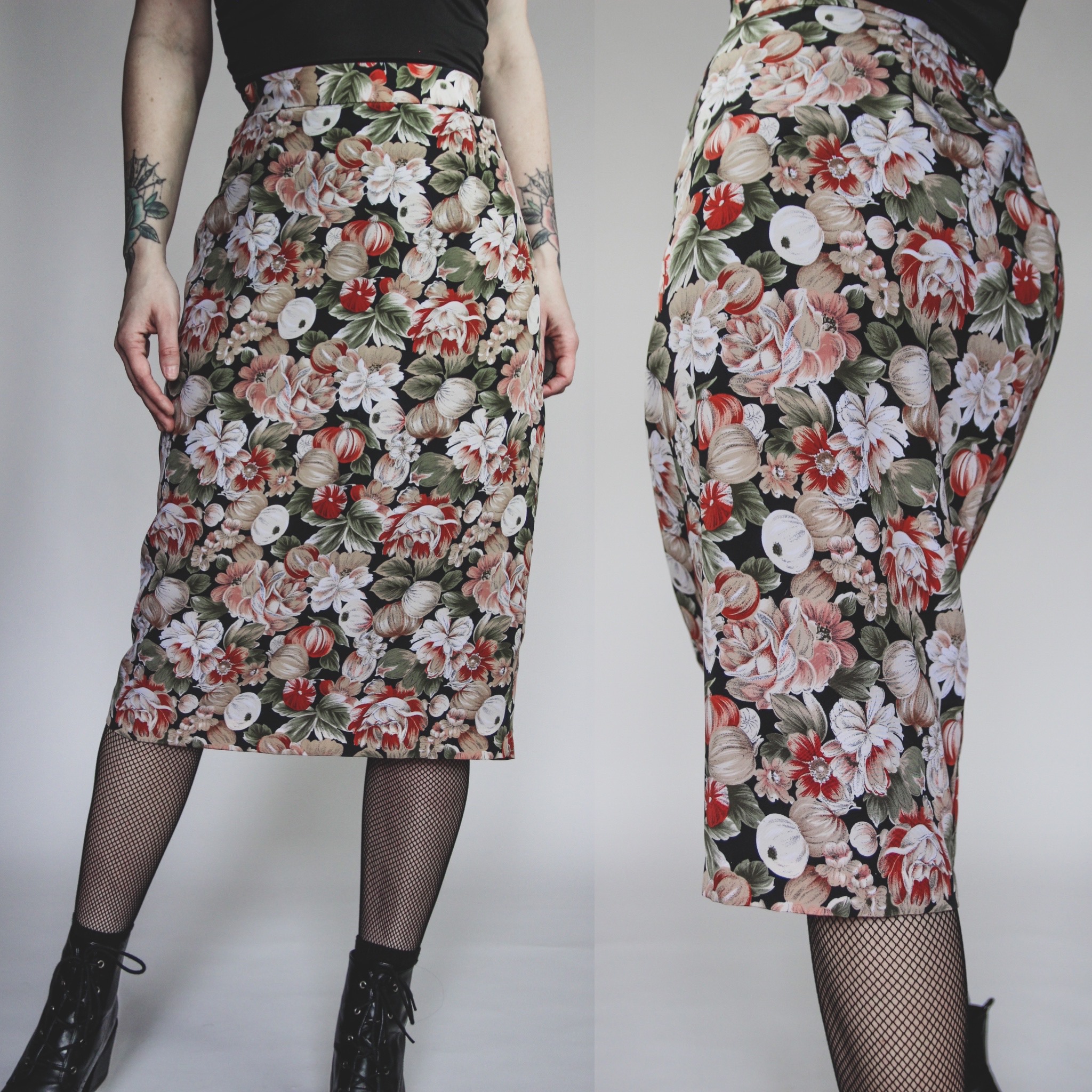 Vintage midi skirt. The print on this one is everything - PUMPKINS and flowers on a black base, but the color palette works for spring, summer or fall! Straight pencil cut with a bit of hourglass curve to flatter the hips and waist. Waistband is ruched elastic in back, flat in front. Back zip with hook-and-eye closure at the top. Fully lined in a separate layer of black poly satin. Fabric is a lightweight breezy poly satin with a bit of shine, no stretch other than the waist.