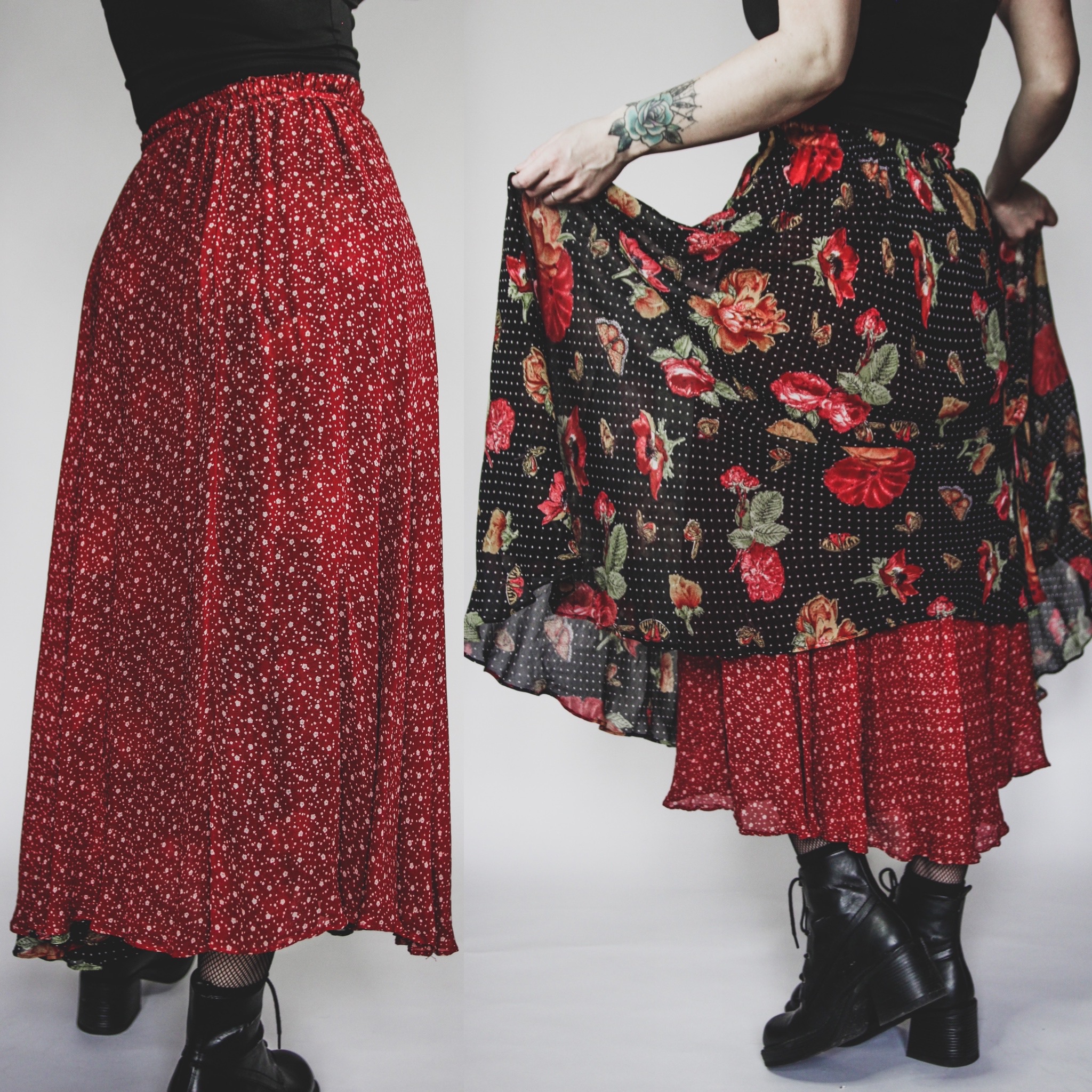 Vintage 90s 2-in-1 reversible skirt. This one is so fun and versatile! One side is red with a dainty white floral pattern and the other side is a dotted black floral - two separate layers of fabric. Pleated A-line cut, flares out slightly from the waist down. Stretchy ruched elastic waistband. Pull-on style. Fabric is a lightweight, semi-sheer poly chiffon.