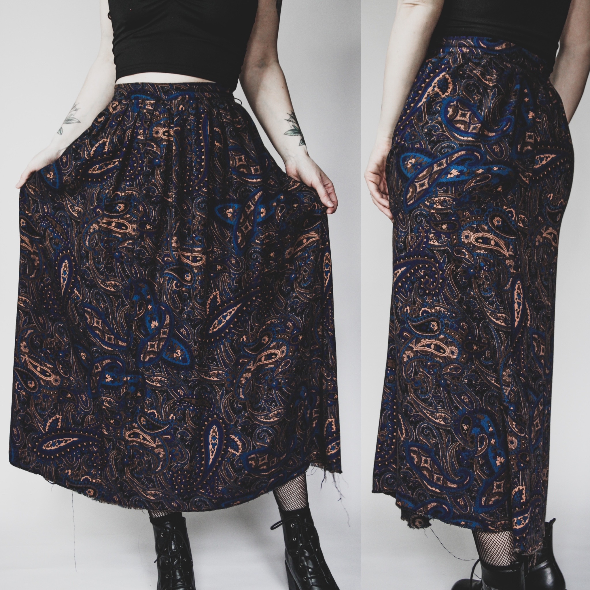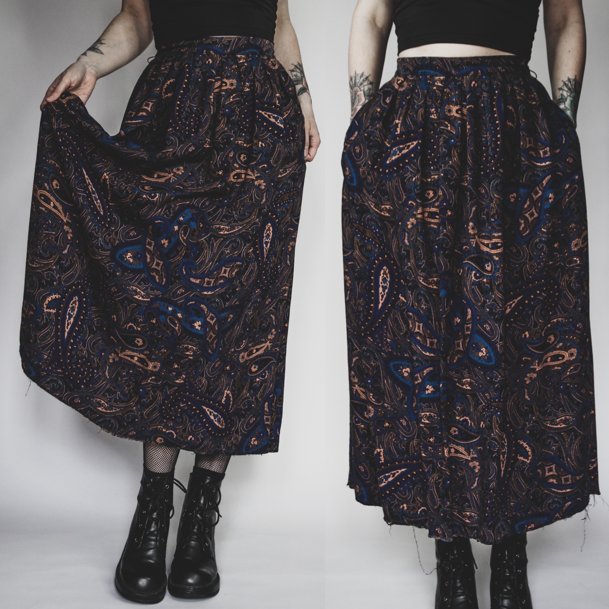 Vintage 90s dark paisley midi skirt in shades of blue, black, purple and caramel orange. SHE HAS POCKETS! A-line cut, flares out slightly from the waist down. Waistband is ruched elastic in back, flat in front. Pull-on style, unlined. Fabric is a super soft, perfectly broken in cotton-poly-rayon blend. No stretch other than the waist. Raw hem.