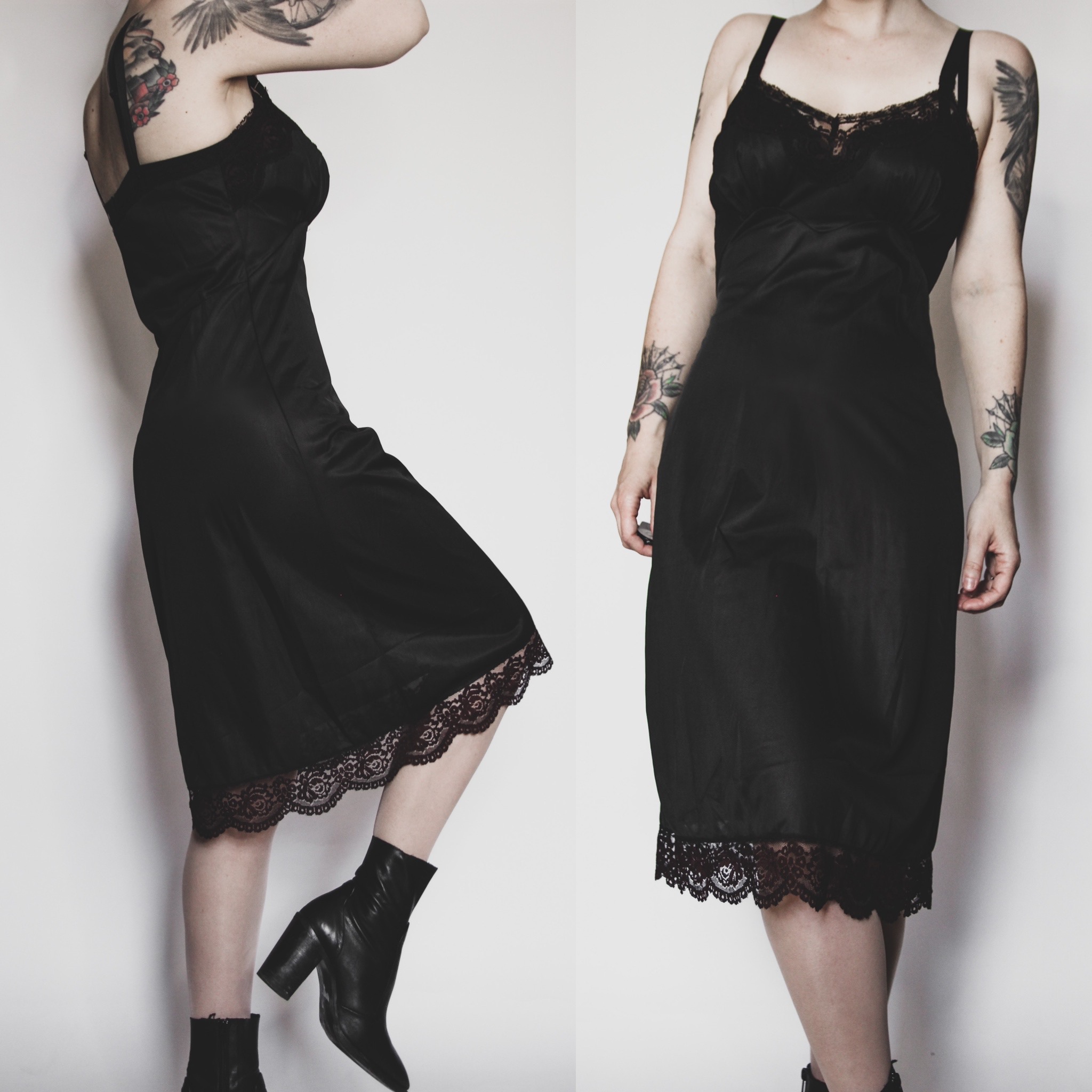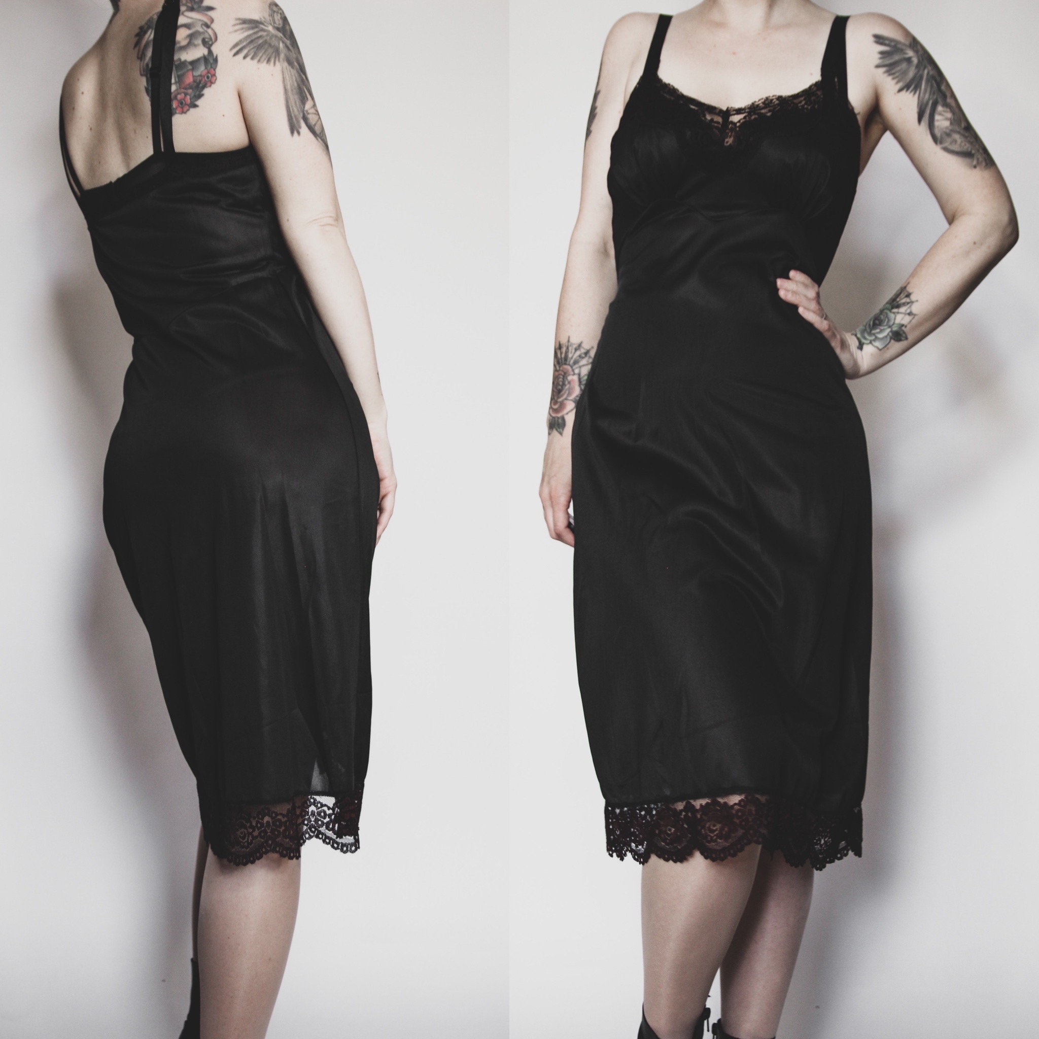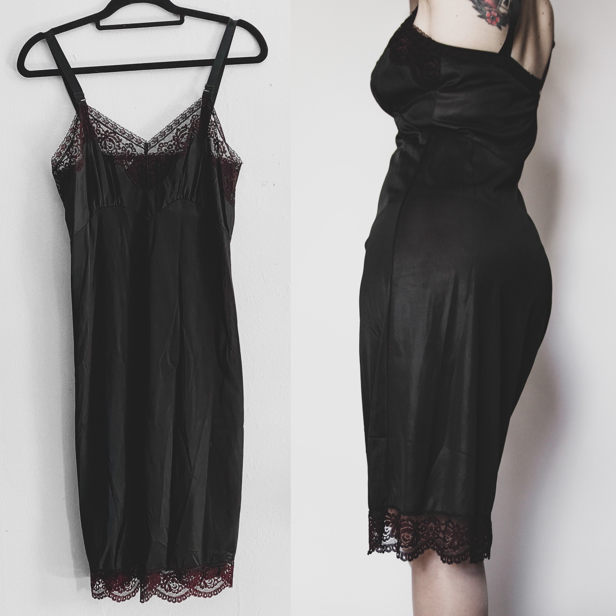 Vintage 60s Perlcreest black nylon satin slip dress. This one is an extra-special find, sourced in Salem, Massachusetts! Black with deep plum lace trim. Contoured sweetheart bust, slightly fitted cut. Fabric has a bit of "give" but is meant to drape loosely. Unlined. Wide satin straps are fully adjustable. Marked a size 34, will best fit a women's XS or Small.