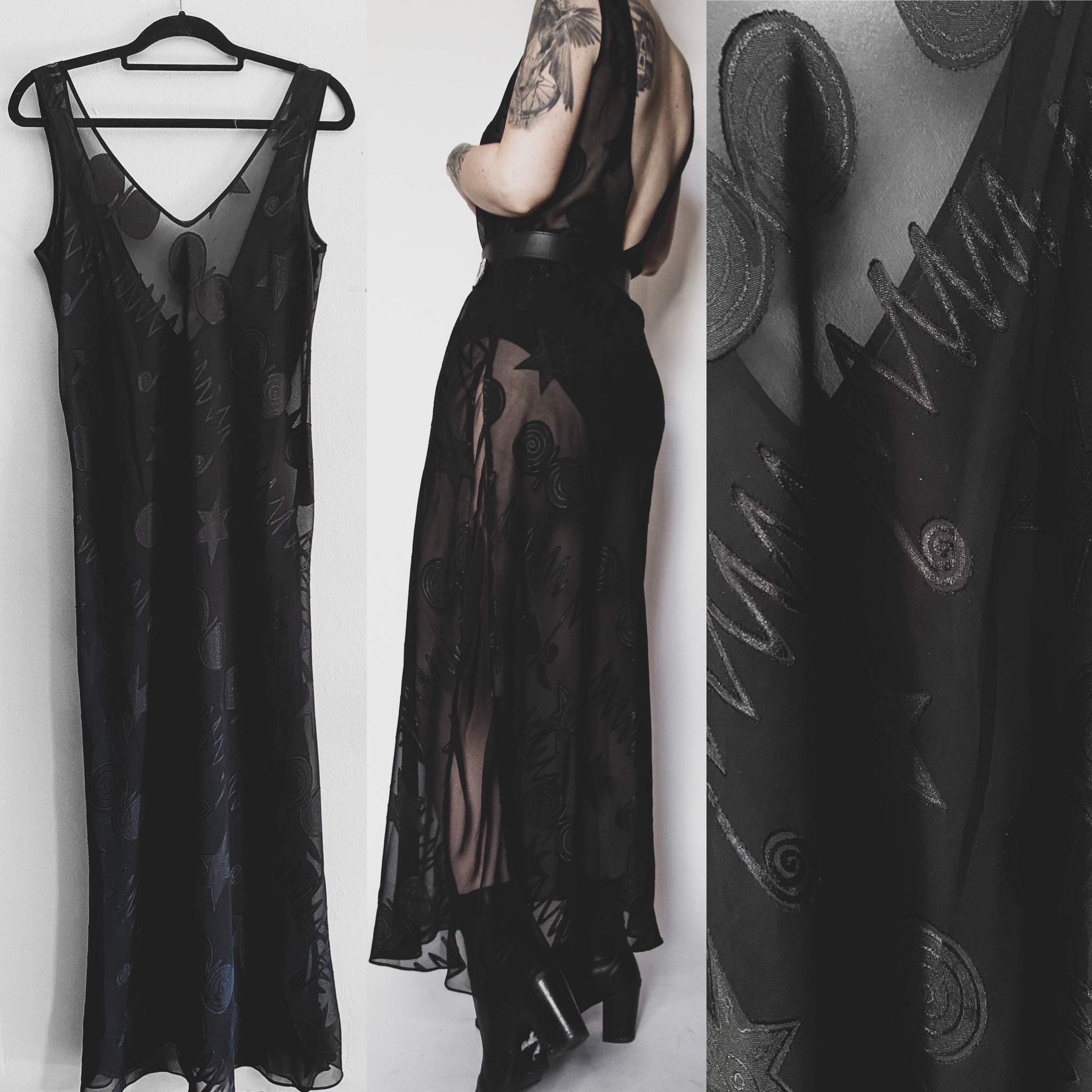 Vintage 90s sheer dress. Such a cute statement dress for summer, sourced in Salem, Massachusetts! Features a fun burnout pattern all over with stars and squiggles. Deep, plunging v-back and a more subtle v-neck in front. Pull-on style. Thin fabric, lightweight, super soft and comfortable. Can be worn as loungewear or daywear. Belt not included. Unlined, no stretch.