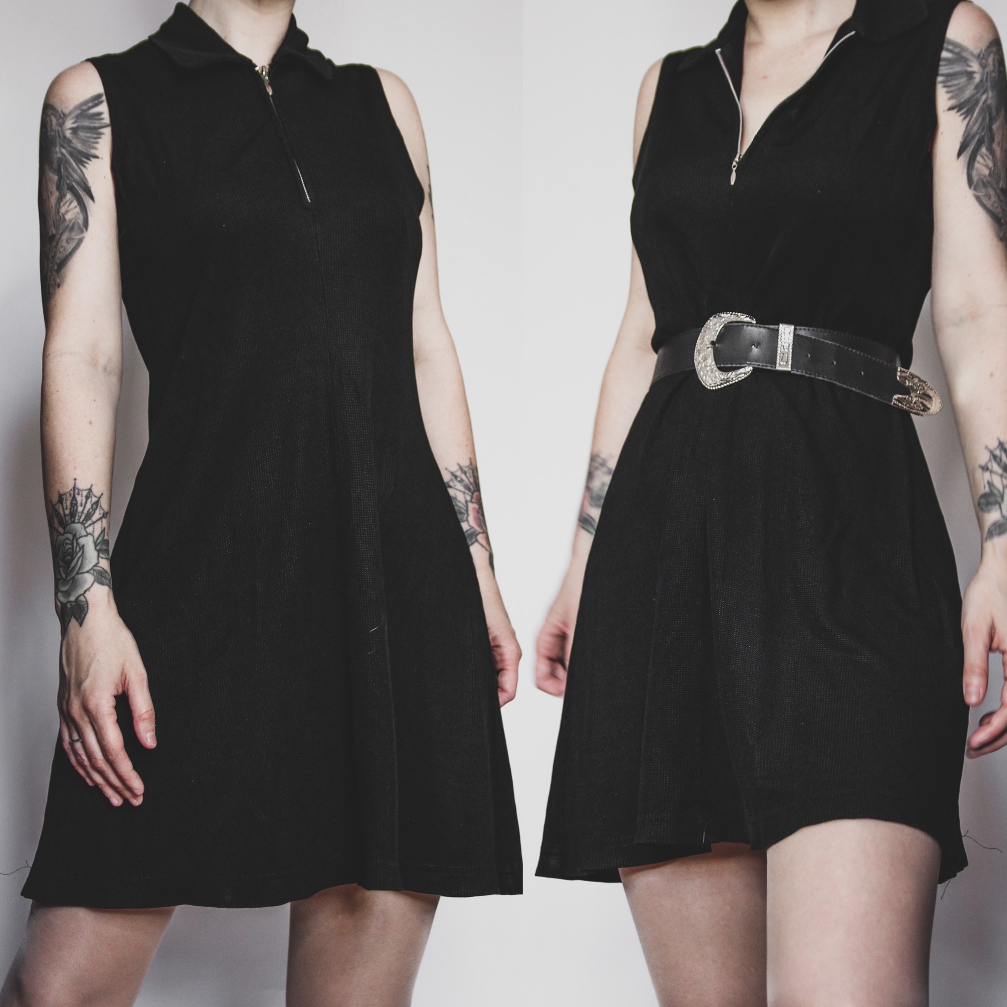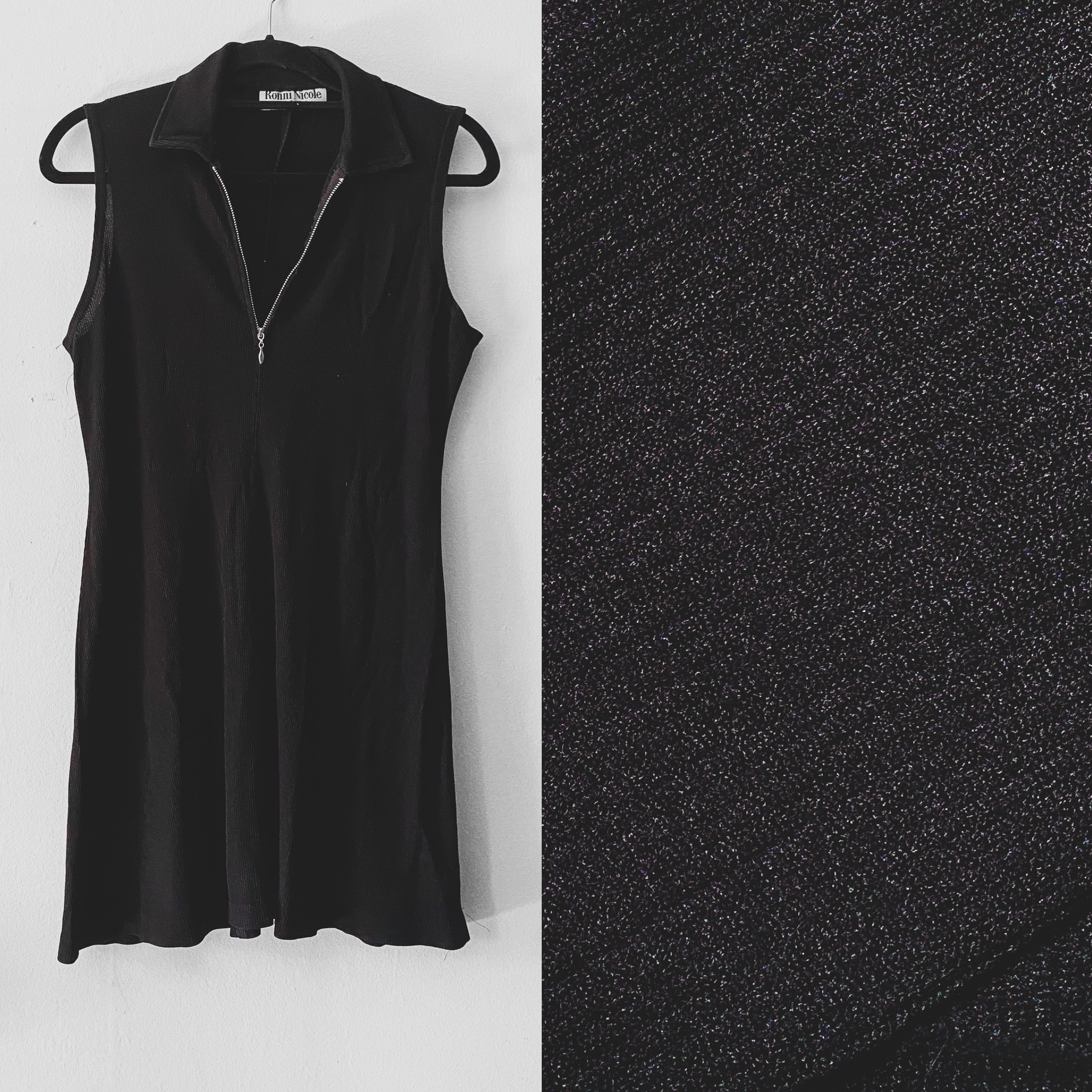 Vintage 90s Ronni Nicole knit sweater dress. Flattering fit-and-flare A-line cut, almost a skater style. Fully functional silver zipper neckline with a classic shirt collar. Pull-on style. No fabric tag but feels like a rayon-spandex blend. Fabric has lots of stretch, can be worn slinky and loose, or more of a bodycon fit depending on your measurements. Light/mid-weight fabric is cool and comfortable for warm weather, no itch factor unless you're sensitive to knits. Has a slight sheen and does not draw lint!