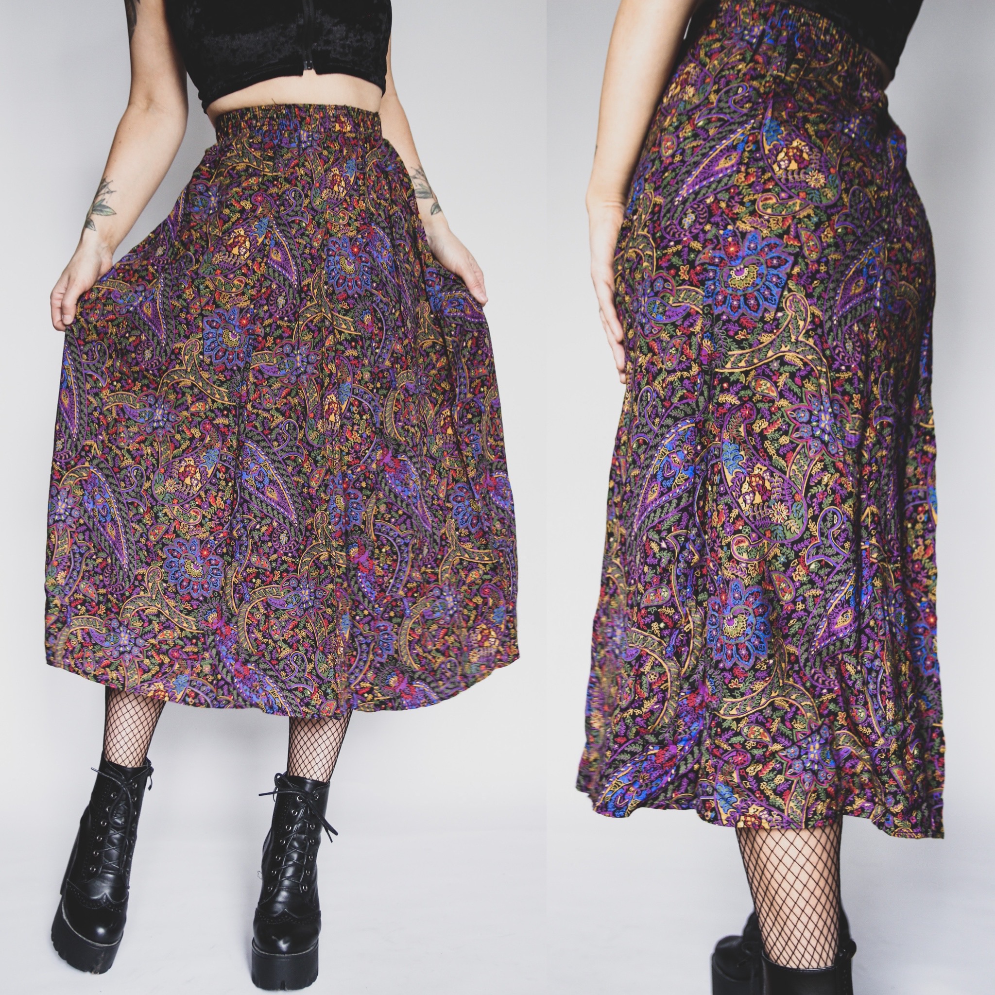 Vintage 80s/90s Maggie McNaughton floral paisley midi skirt. Shades of purple, mustard yellow, red and green on black. Lightweight, breezy 100% rayon fabric. Elastic waistband, pull-on style. Meant to be worn high waisted. Unlined. Super comfortable for hot weather!