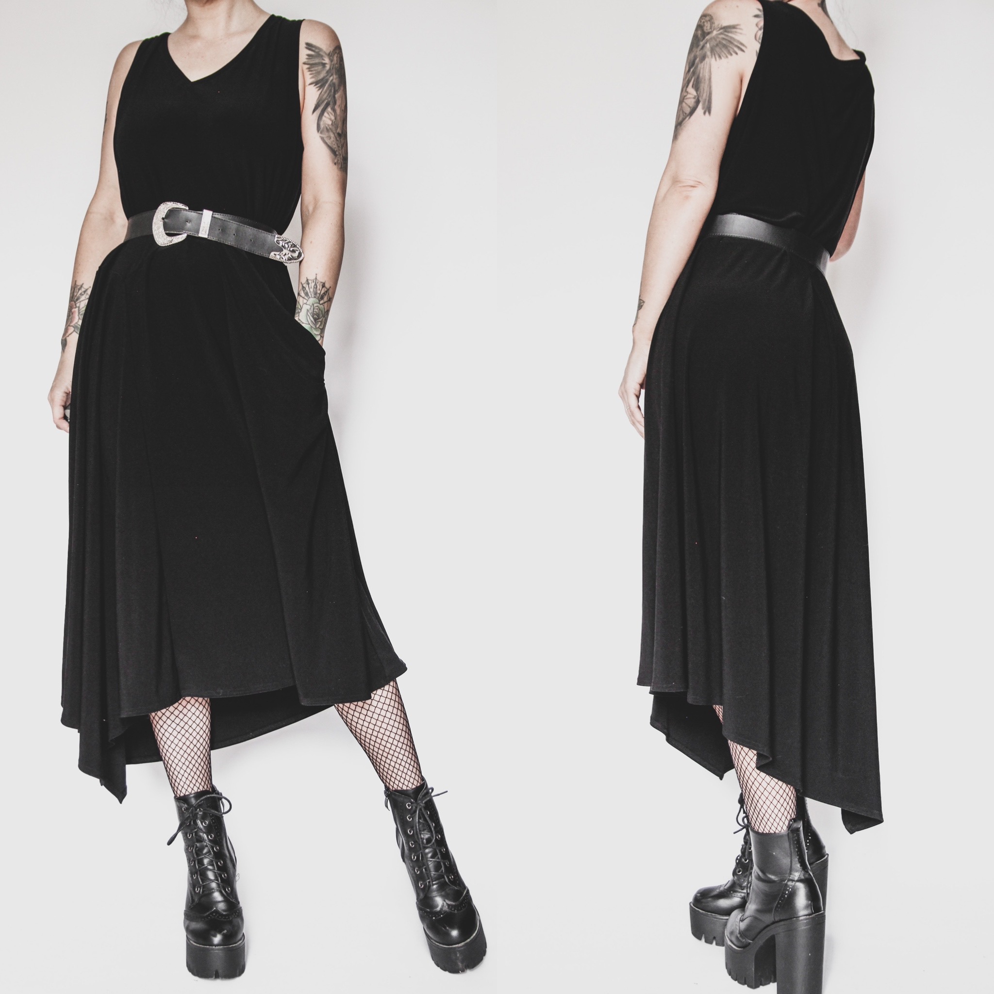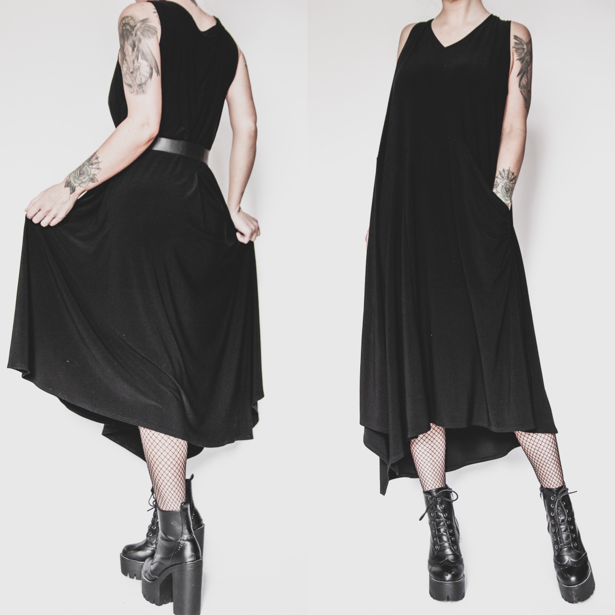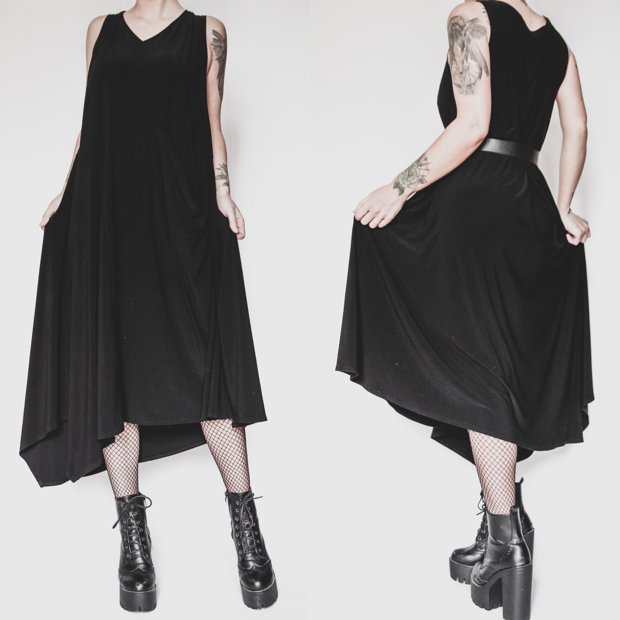 Vintage 90s black draped asymmetrical dress. Super full skirt, flares out from the shoulders down with a bit of draped detailing in the front, an empire waist seam and a roomy pocket! Belt is not included. Poly-spandex blend fabric. Fabric is midweight and slinky but still cool and comfortable for hot summer days. Pull-on style. Unlined, plenty of stretch all over.