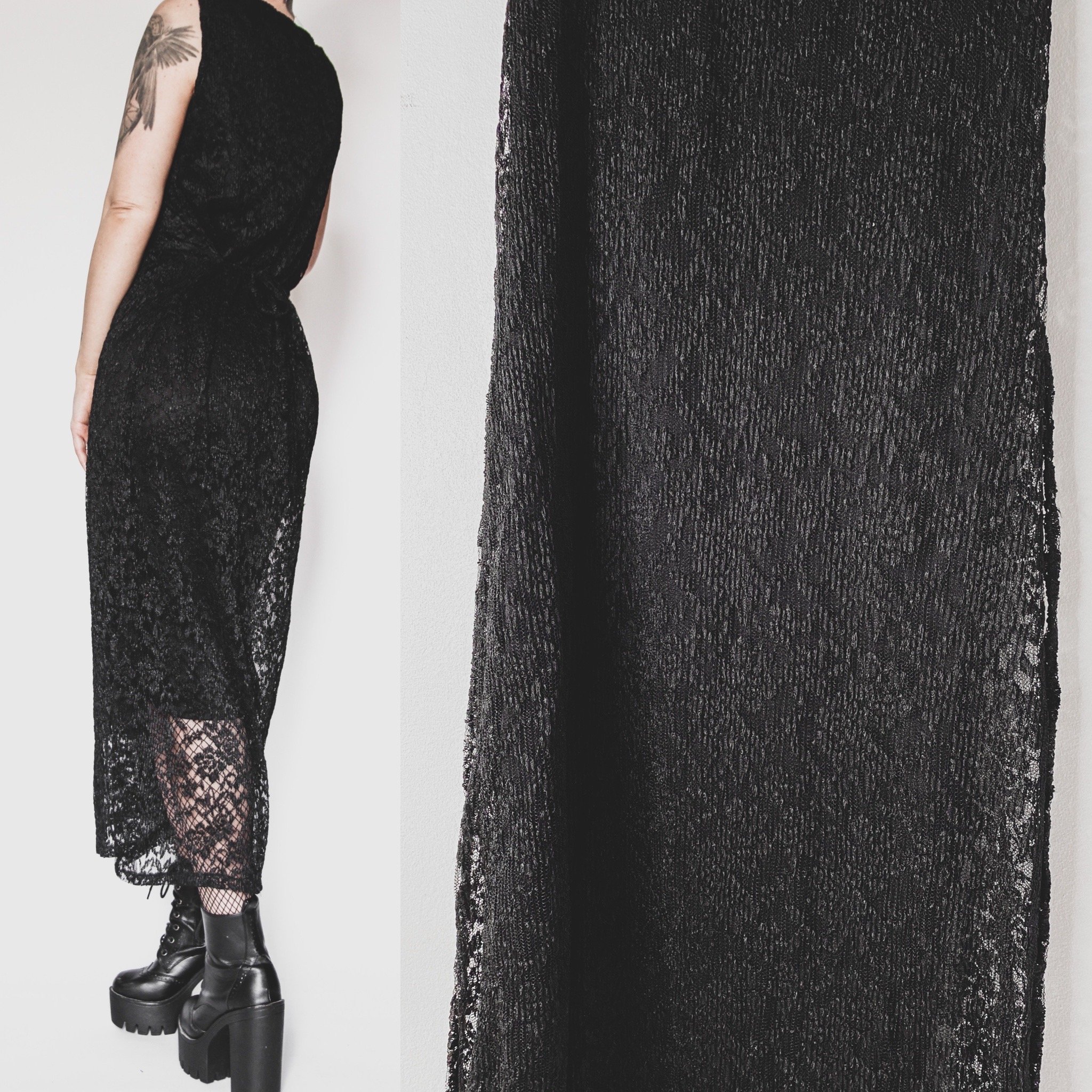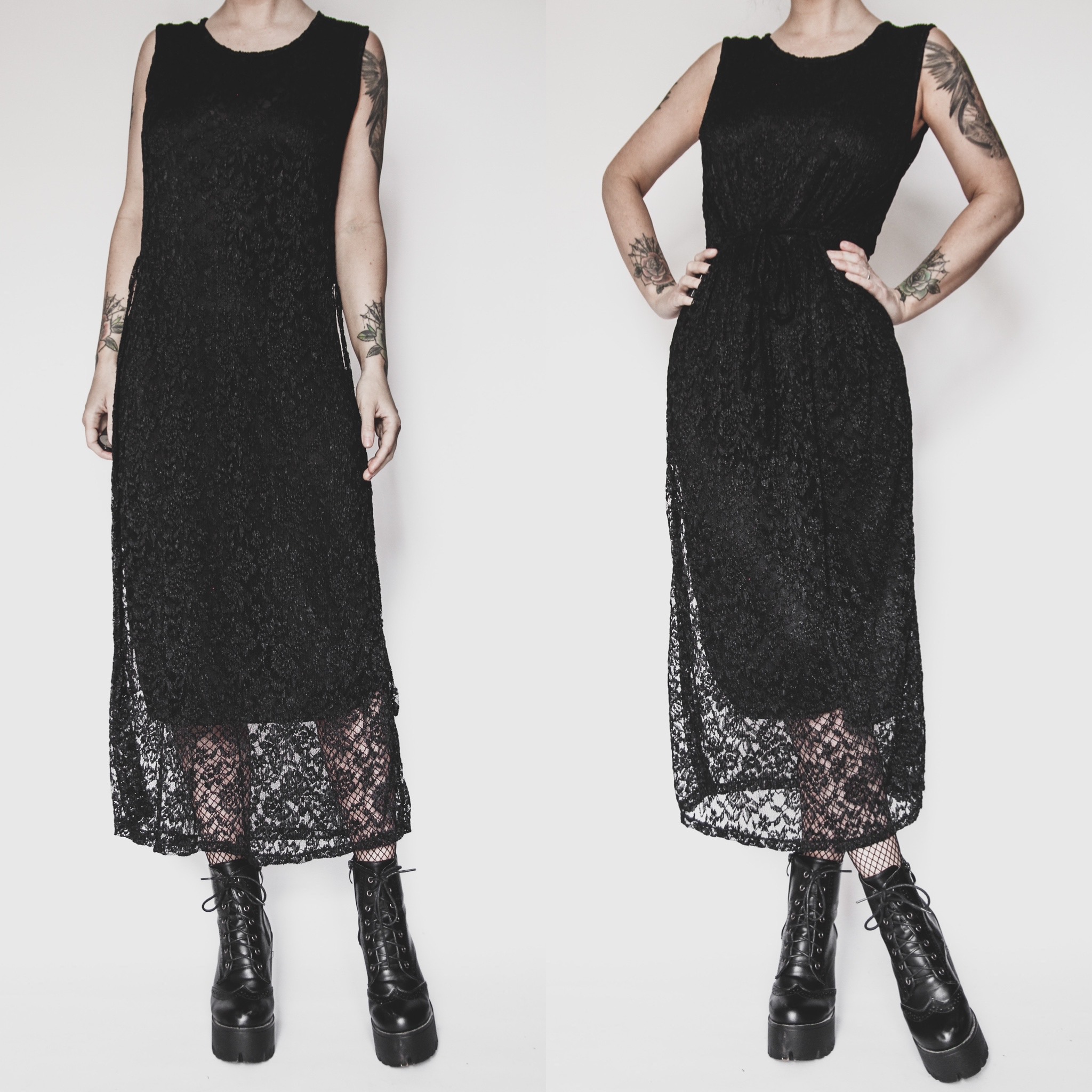 Vintage 90s black lace burnout dress. Fully lined in a separate layer of semi-sheer polyester mesh, outer layer is a textured sheer mesh lace. Long ties on either side of the waist, so you can wear it loose or tie it in front or back. Pull-on style, has a bit of stretch all over. Straight cut from the shoulders down. Will be slightly see-through in direct light.