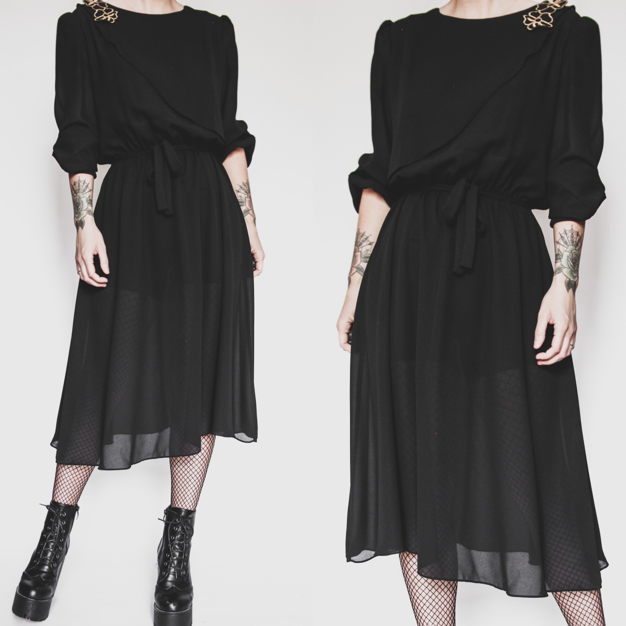 Vintage Gauguin Pour Elle ILGWU Union-made cocktail dress. Label tag has been partially removed but what's left of the label dates the dress between 1964 and 1984 (most likely early 80s), made in Canada. Semi-sheer polyester chiffon fabric with no stretch. Elastic gathered waistband and cuffs. Puffed shoulders, draped front detailing, a fully adjustable/removable tie belt and the cutest little gold floral applique at the shoulder! The applique can be removed with a snip of the threads and reattached with a safety pin if you wish. Back zip. Unlined, may be see-through in direct light so she may require a slip or cute layers underneath!