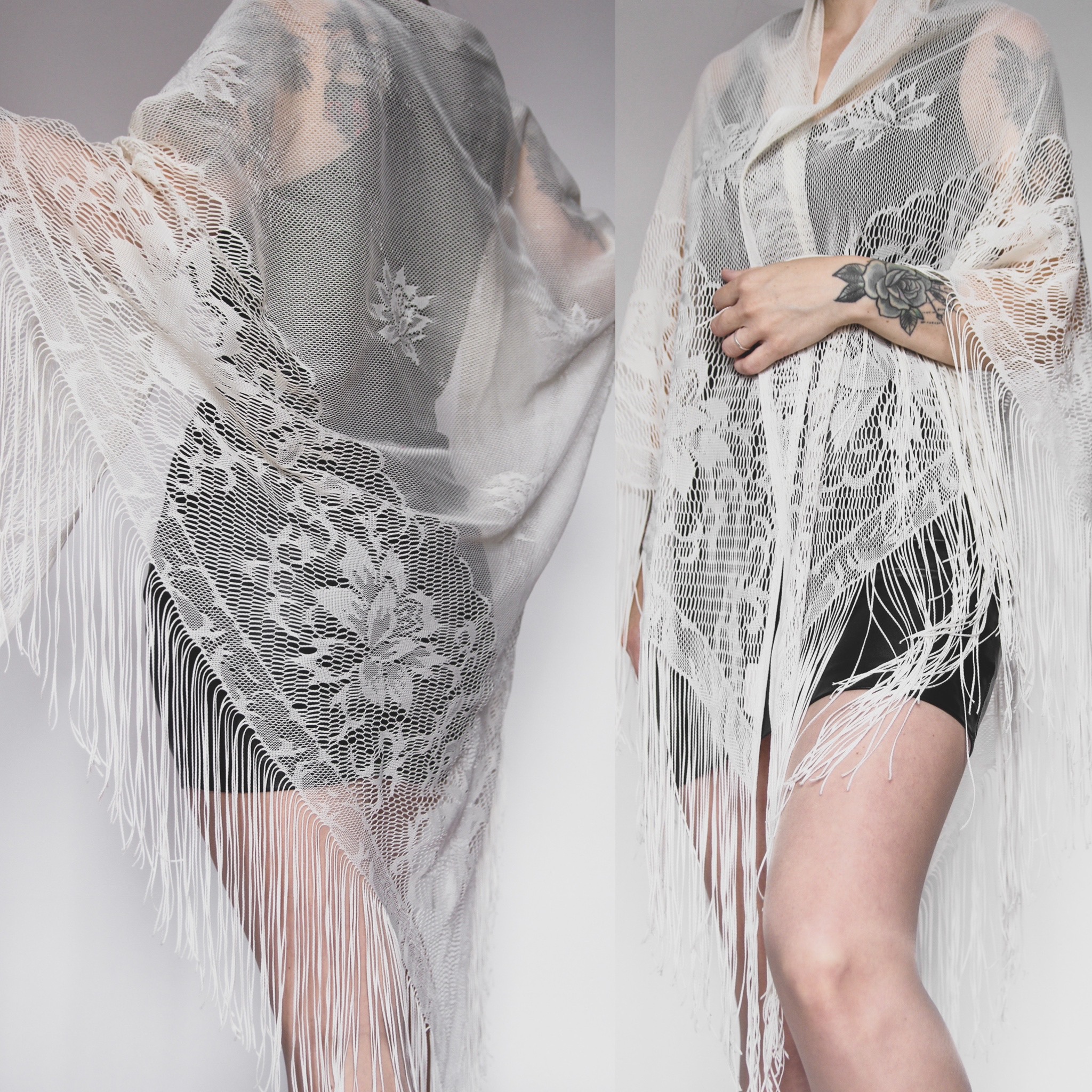 Vintage 70s ivory lace fringed shawl. This is a Last Rites signature piece in a XXL oversize style for extra drama. All Last Rites signature shawls are one of a kind with unique colors, patterns and lace! No two are alike. This one is triangular in a soft off-white /eggshell color, with a beautiful floral lace motif and long delicate fringe on two sides.