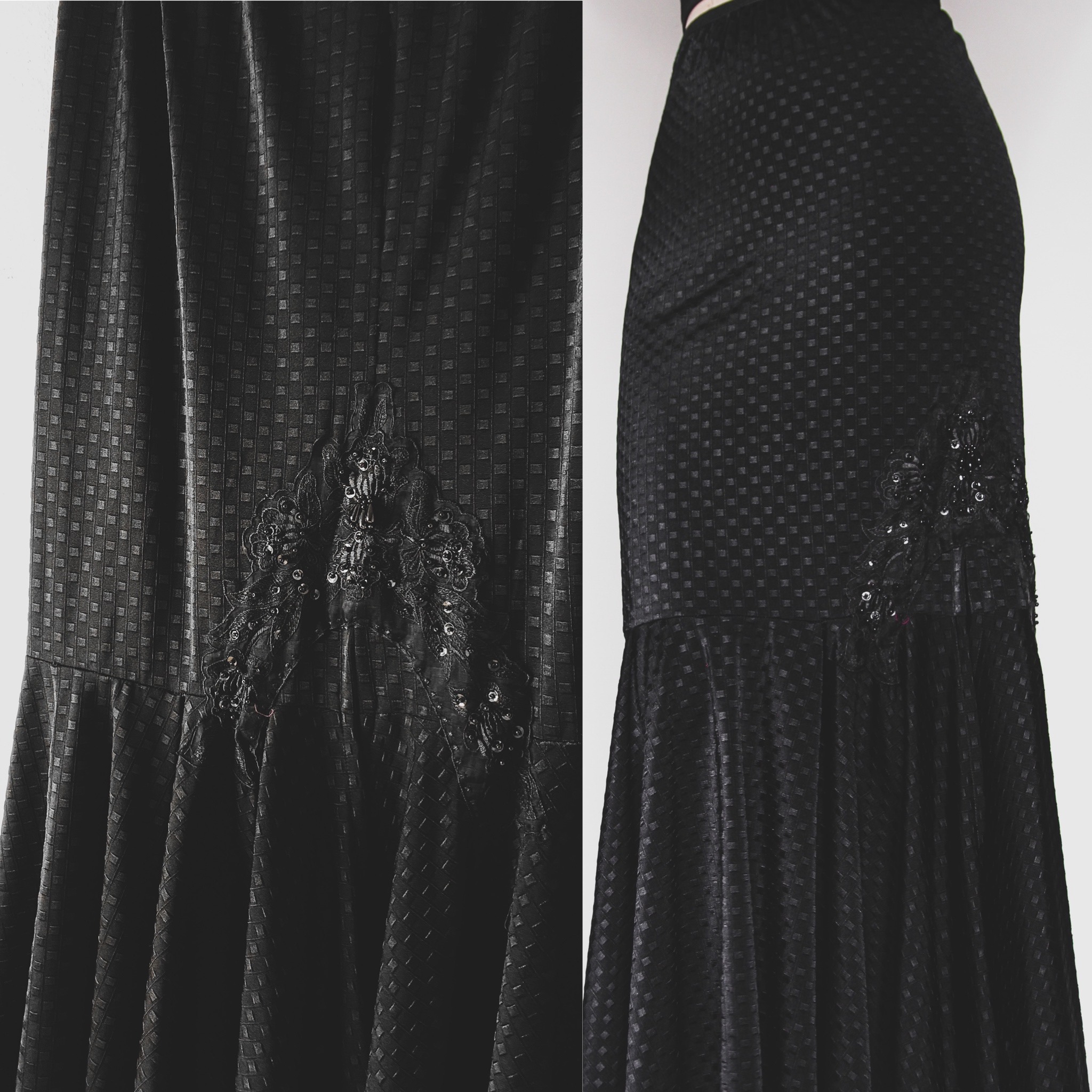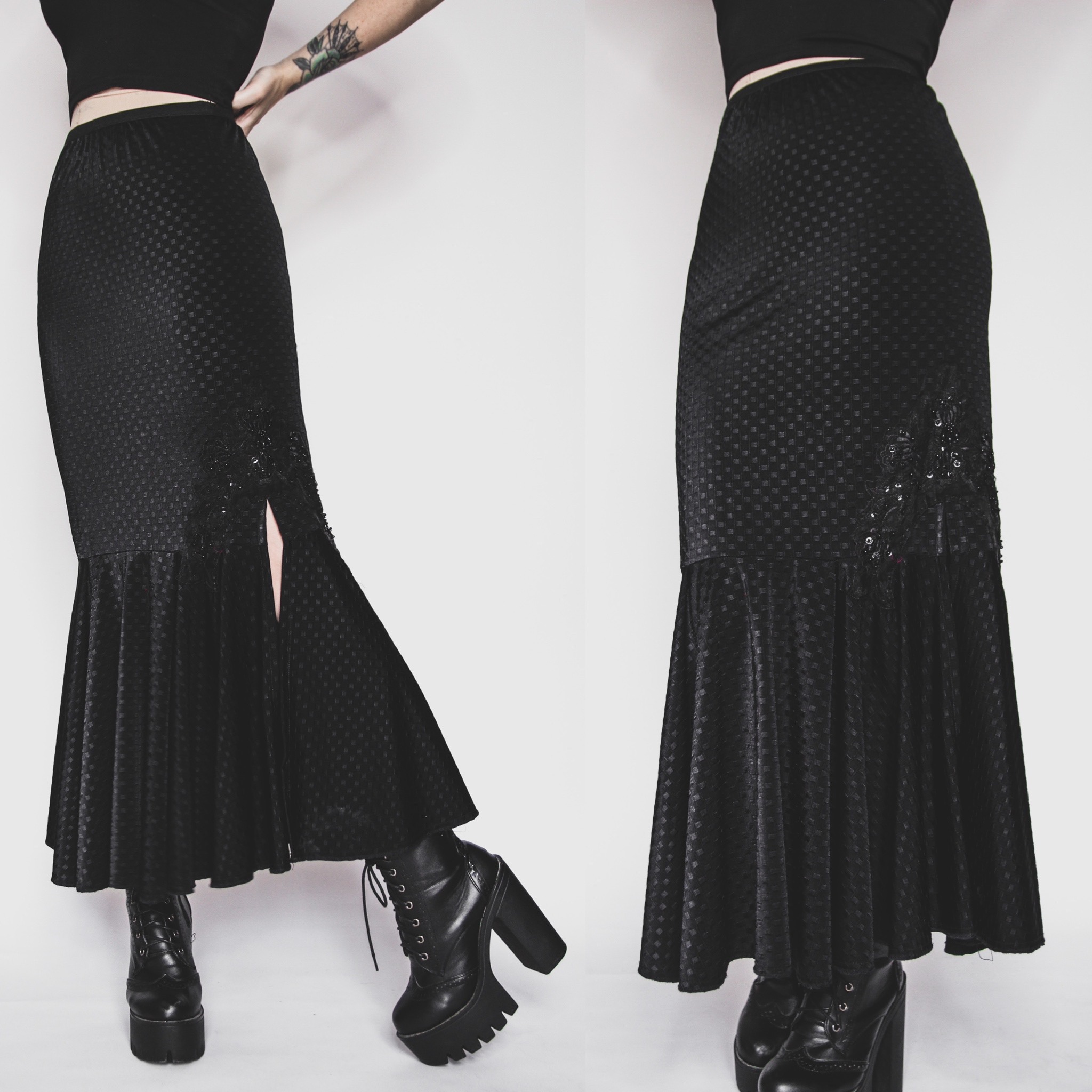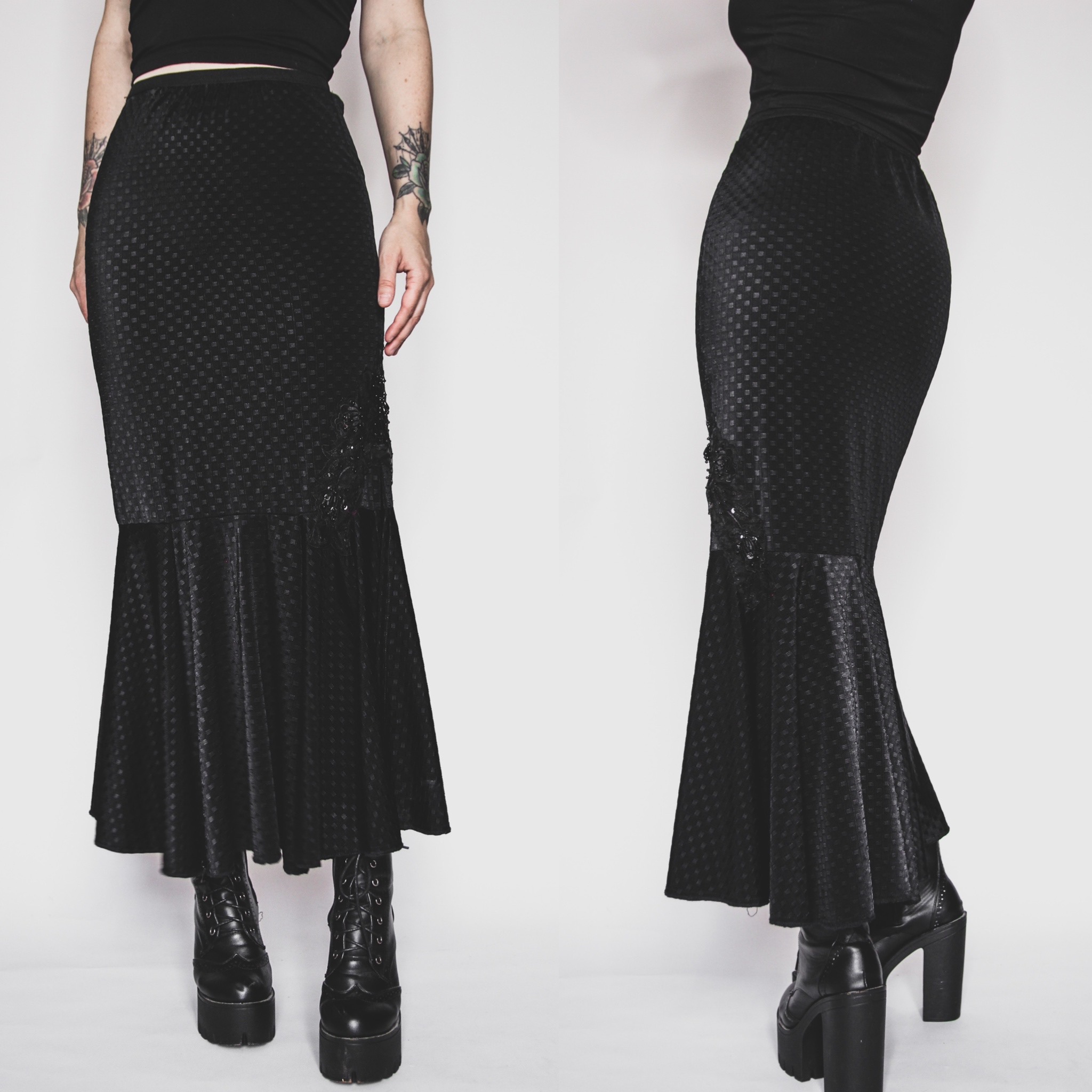 Vintage 90s mermaid skirt. So fun and unique! Textured, black geometric pattern all over with a flowy peplum hem and an elastic waist. Gorgeous oversize applique detail with embroidery, beading and sequins. Pull-on style, meant to be worn high waisted. Hugs your curves in all the right places! Unlined. Fabric is super stretchy, slinky poly spandex blend with a bit of sheen.