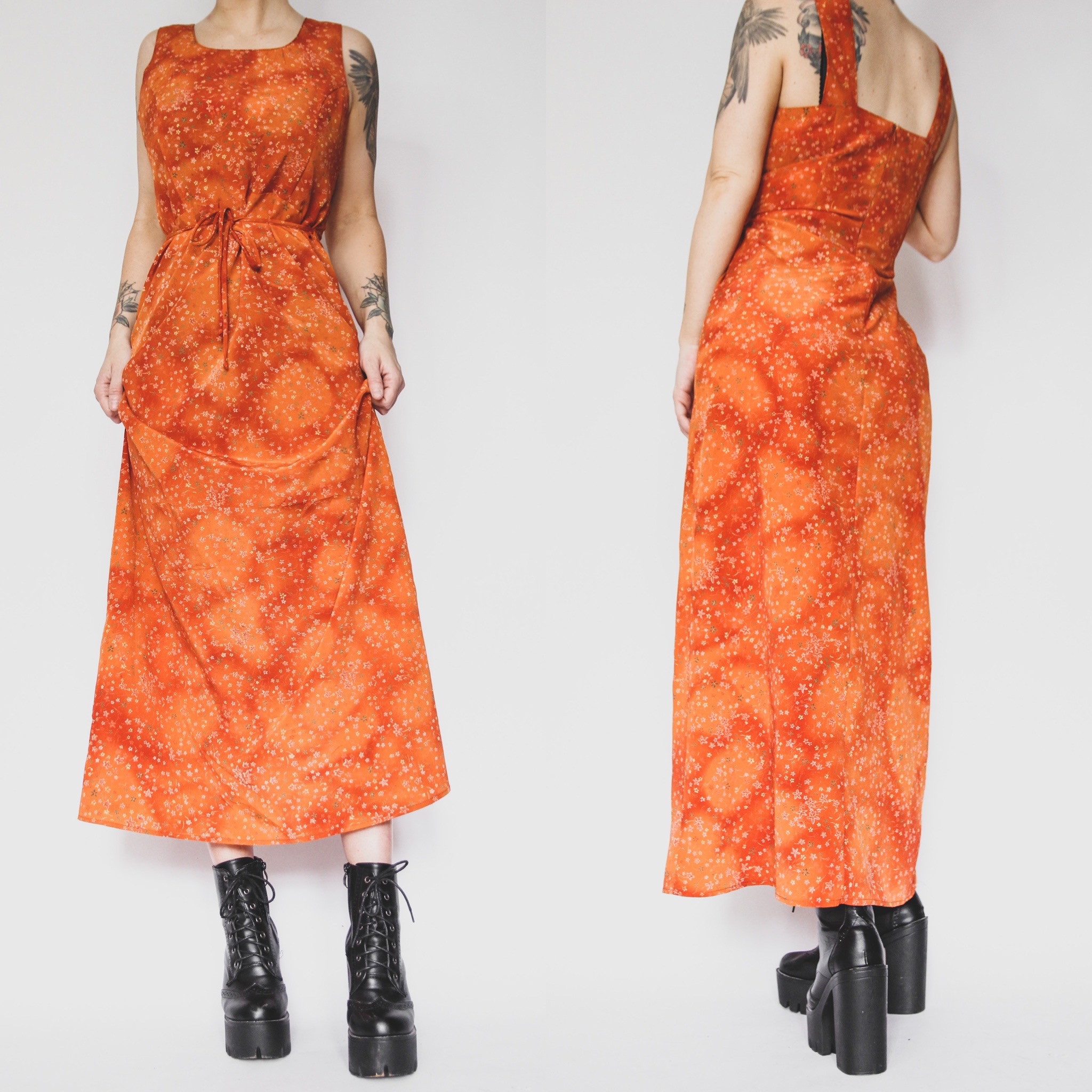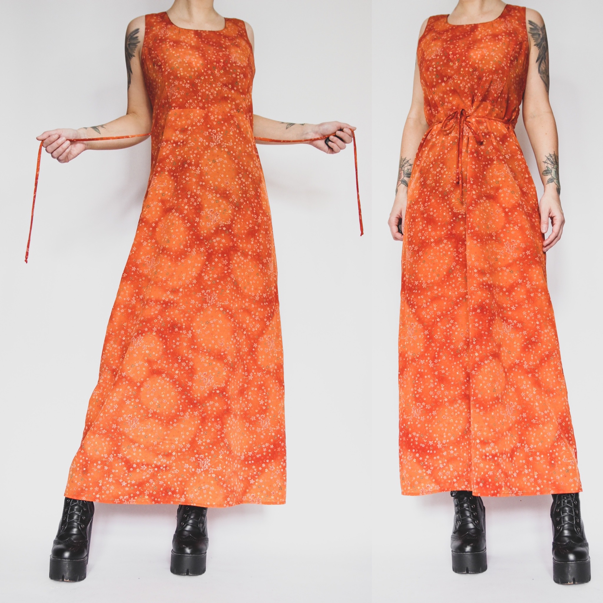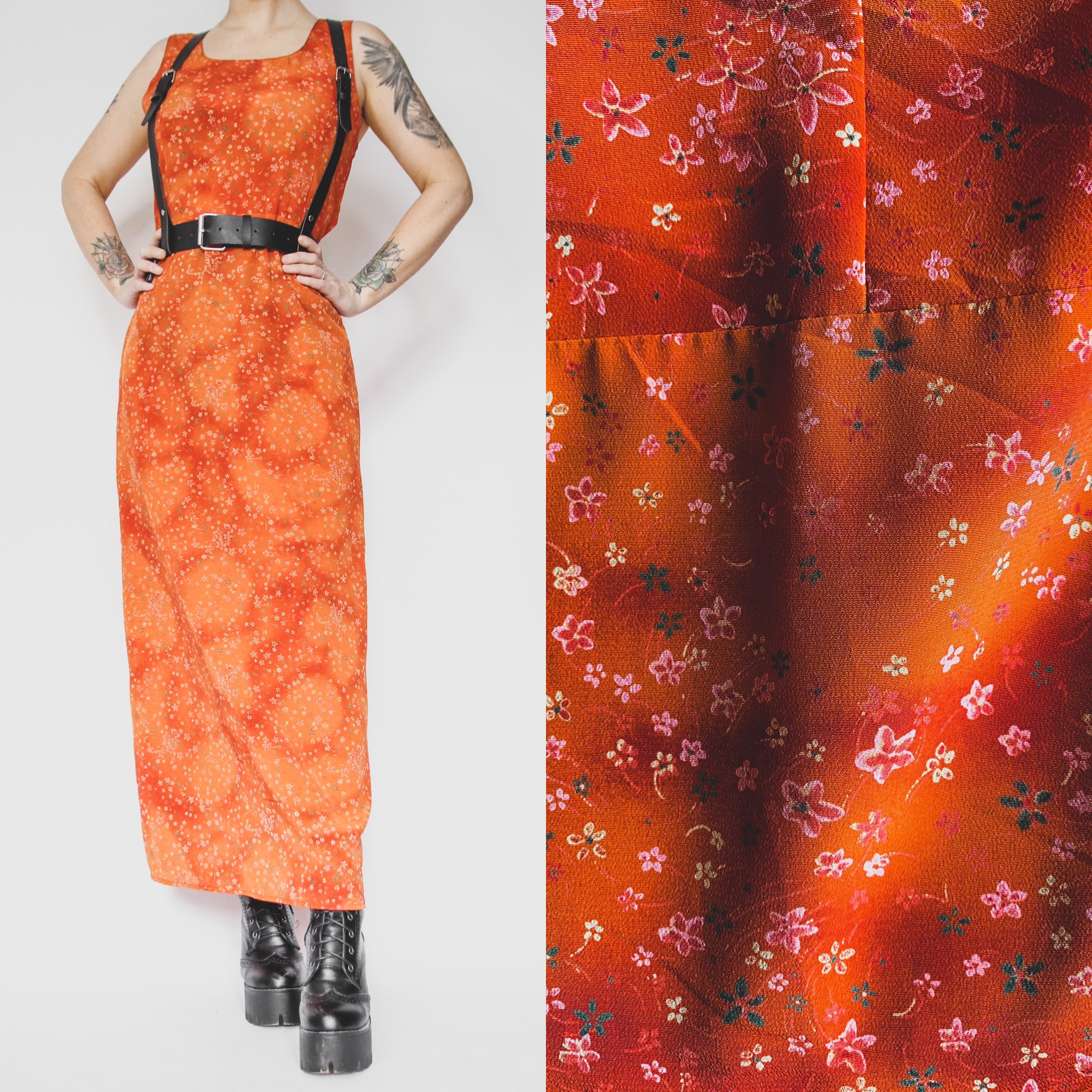 Vintage 90s Cloud Nine bright orange floral maxi dress. Whimsigoth vibes for summer! Back zip, scoop neck with a square cut back. 100% polyester with no stretch. Unlined. Long belt ties on either side to cinch the waist in front or back. Harness belt is not included.