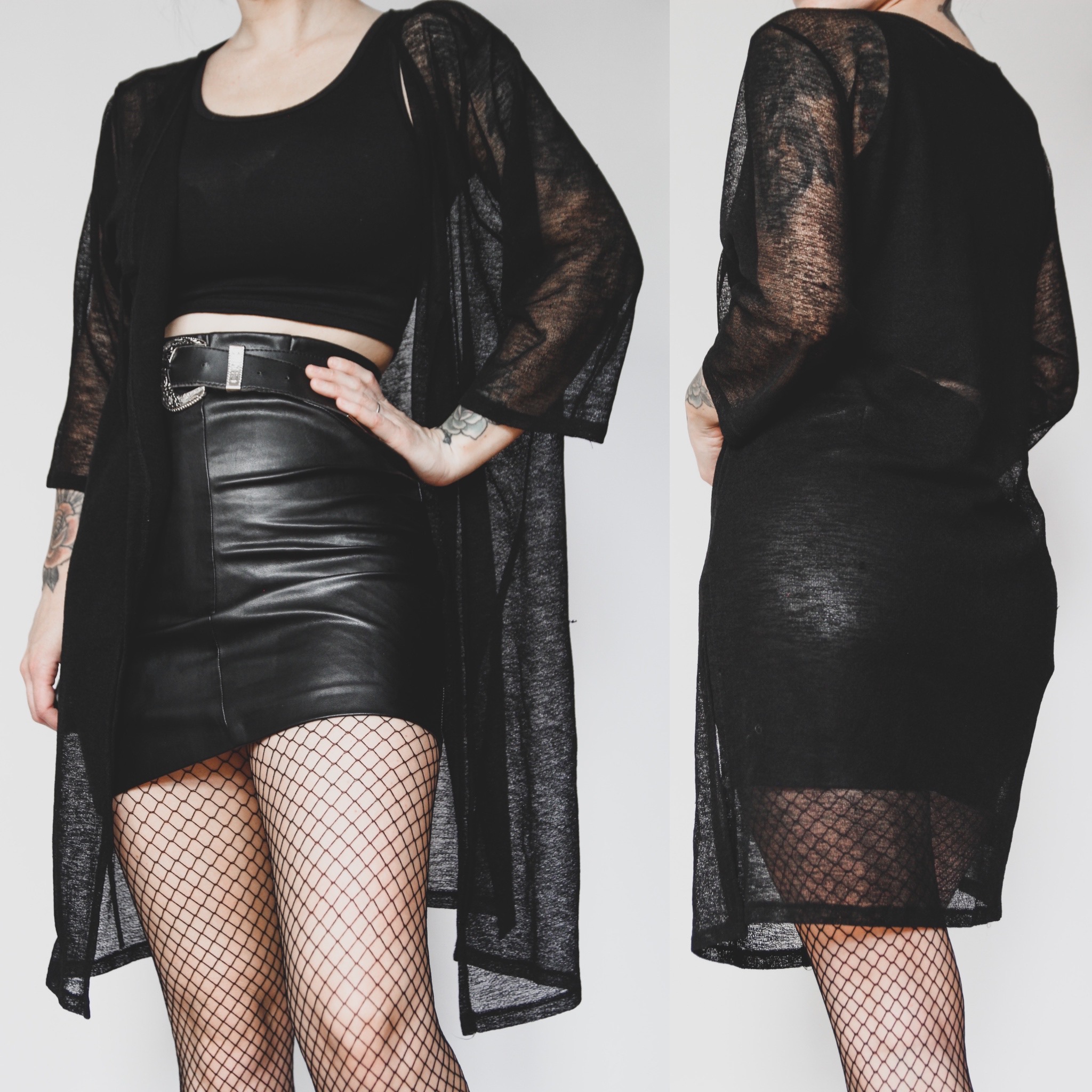 Vintage Y2K mesh knit cardigan. Slight A-line cut with side slits, loose 3/4 sleeves, front tie closure at the bust. Slight stretch but meant to drape loosely. She has a couple of pulled threads / snags in the back due to age and the nature of the fabric, barely visible when worn.