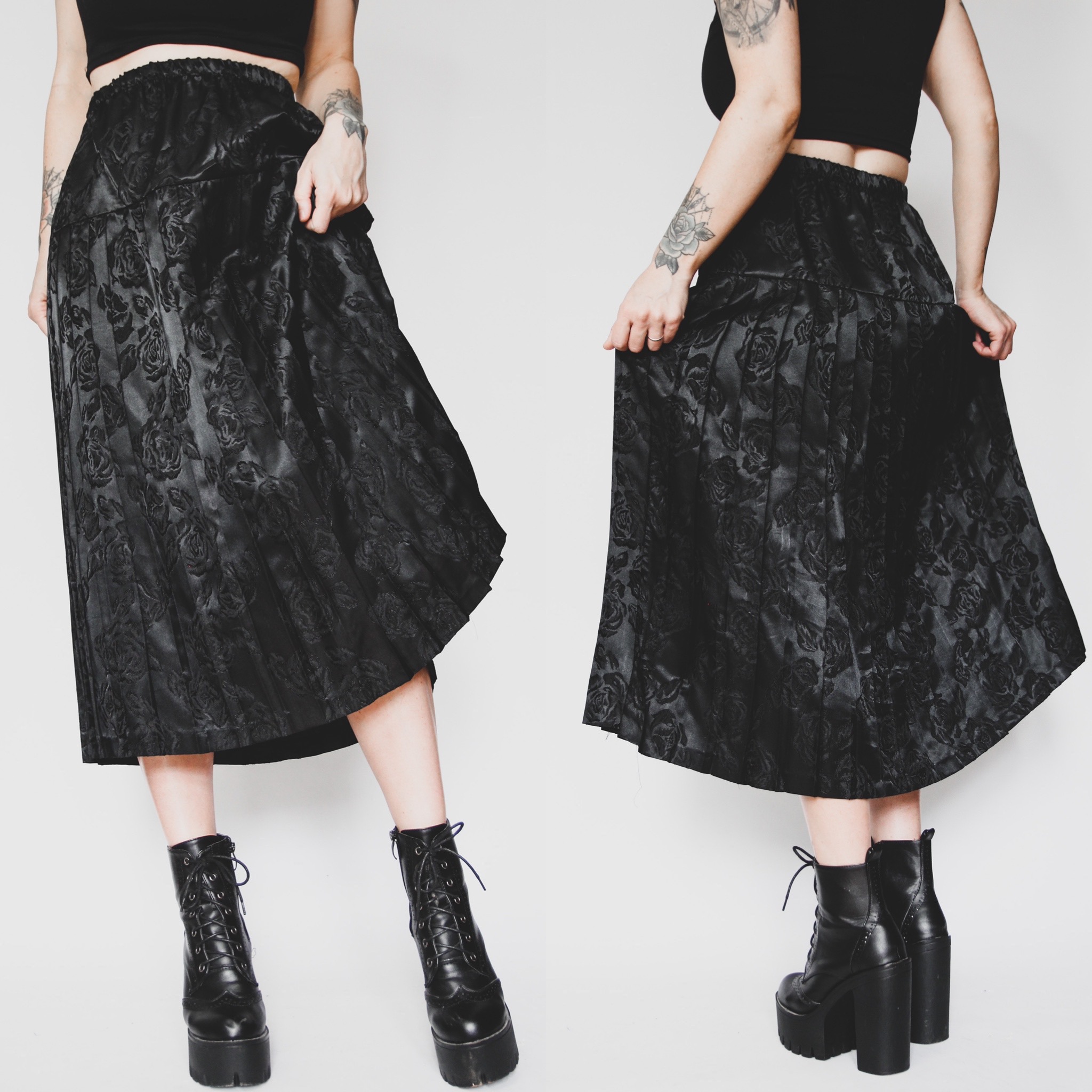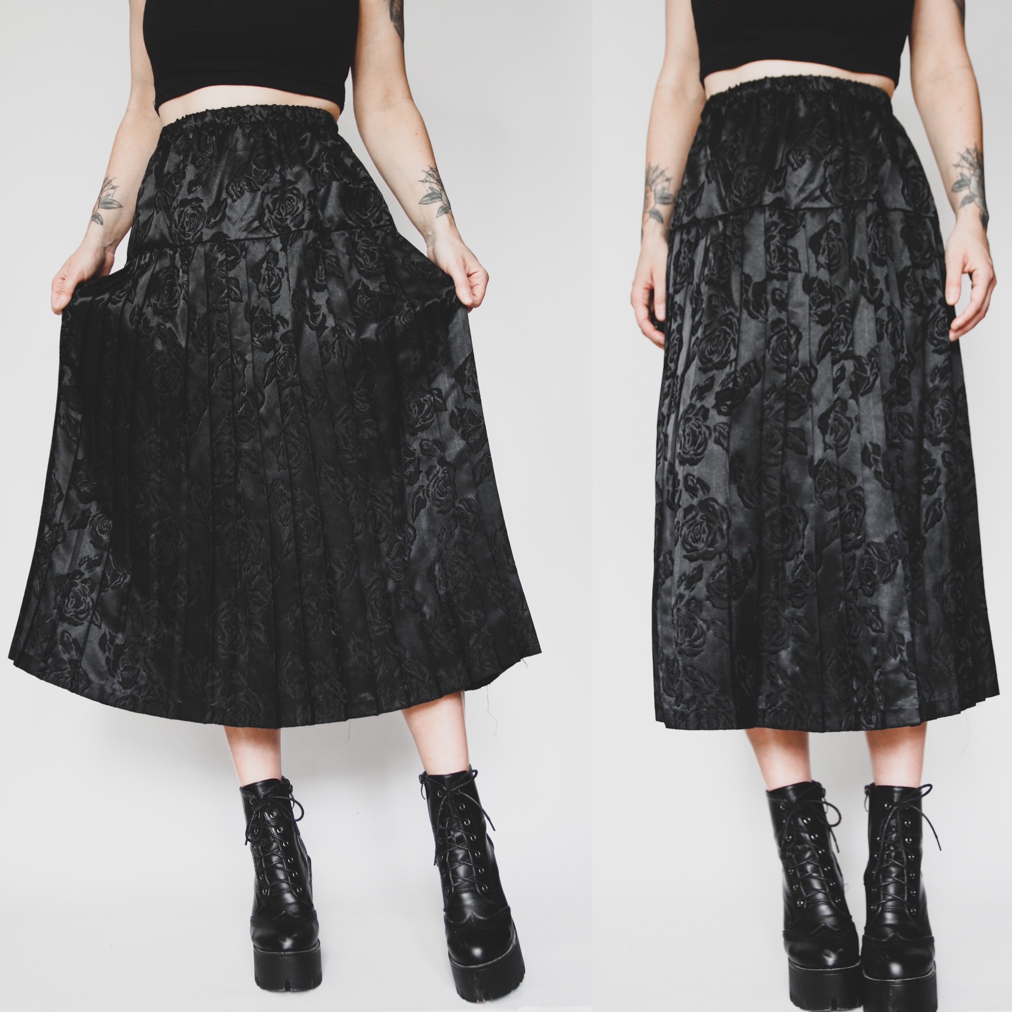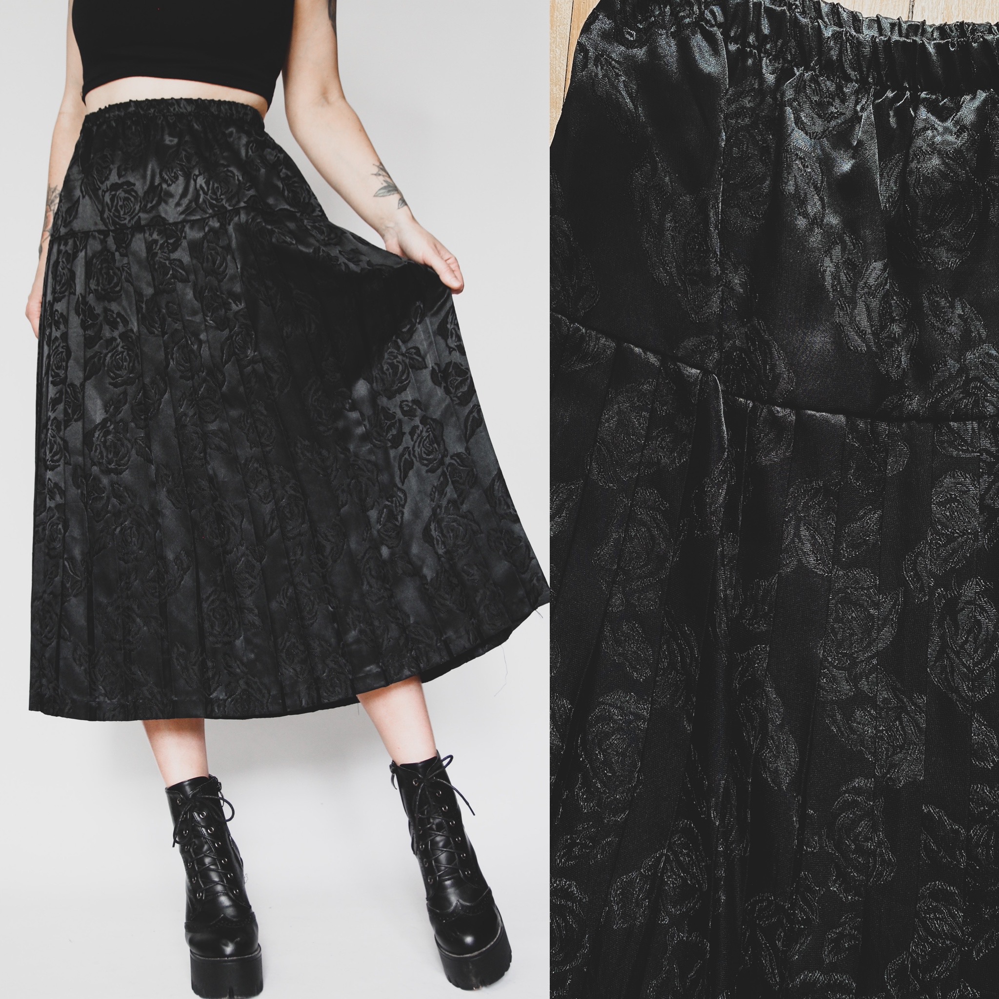 Vintage 80s black satin pleated skirt. Shiny and soft with a textured floral design all over. Elastic waistband, pull-on stye, unlined. Meant to be worn high-waisted. Drop waist A-line cut with structured pleats. The perfect staple skirt - fancy casual, or even for the office!