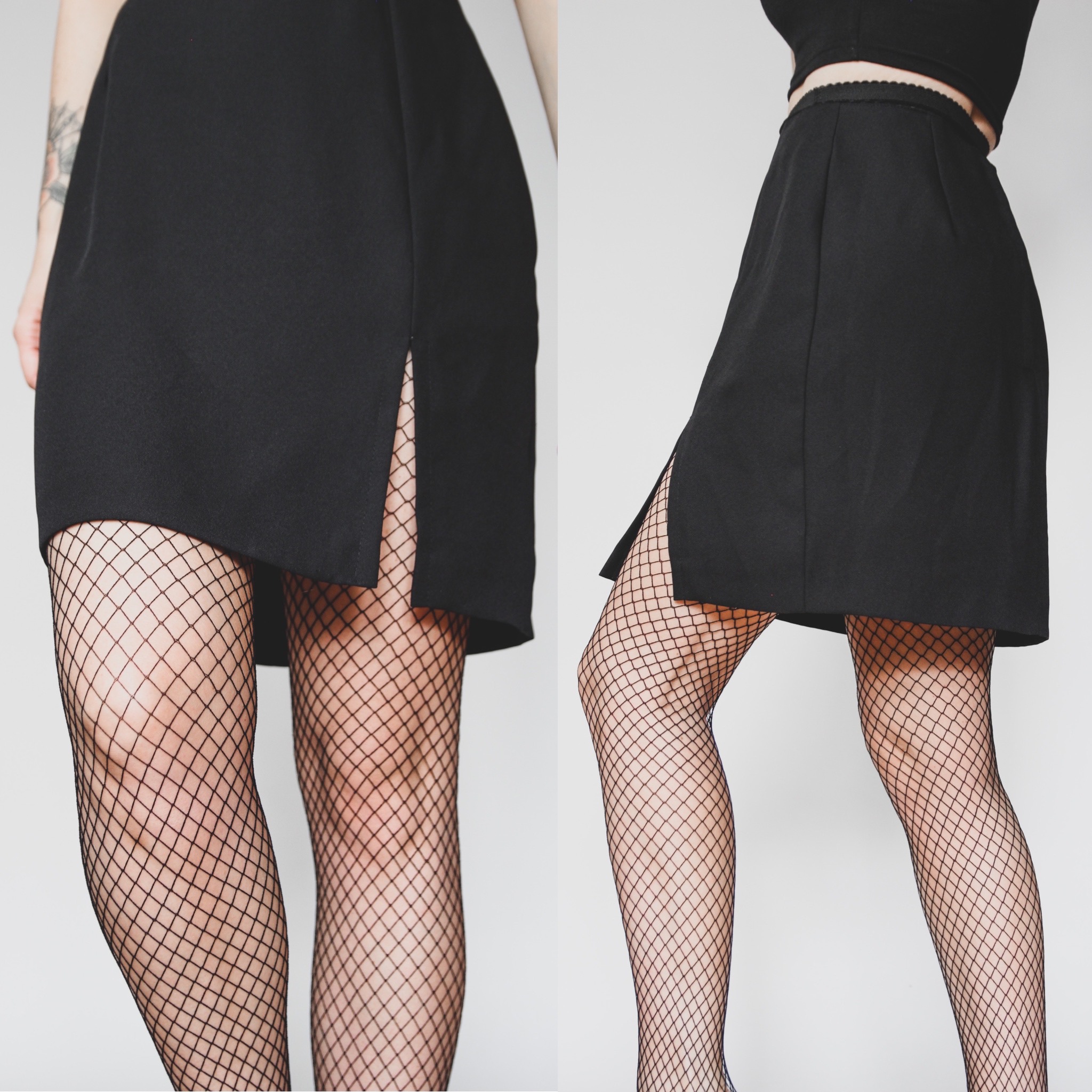 Vintage 90s Classique Collection mini skirt. 100% polyester, black semi-sheer chiffon with a built in partial liner (liner is about half as long as the skirt itself). Pencil cut with a front slit. Back zip with hook-and-eye closure at the top. No stretch whatsoever.