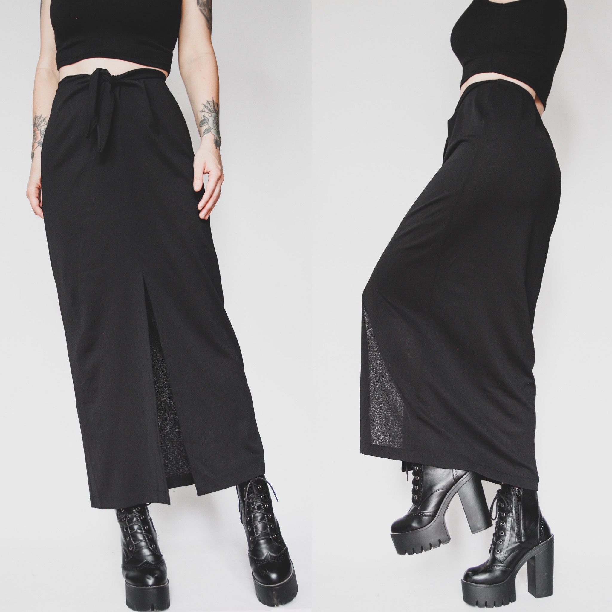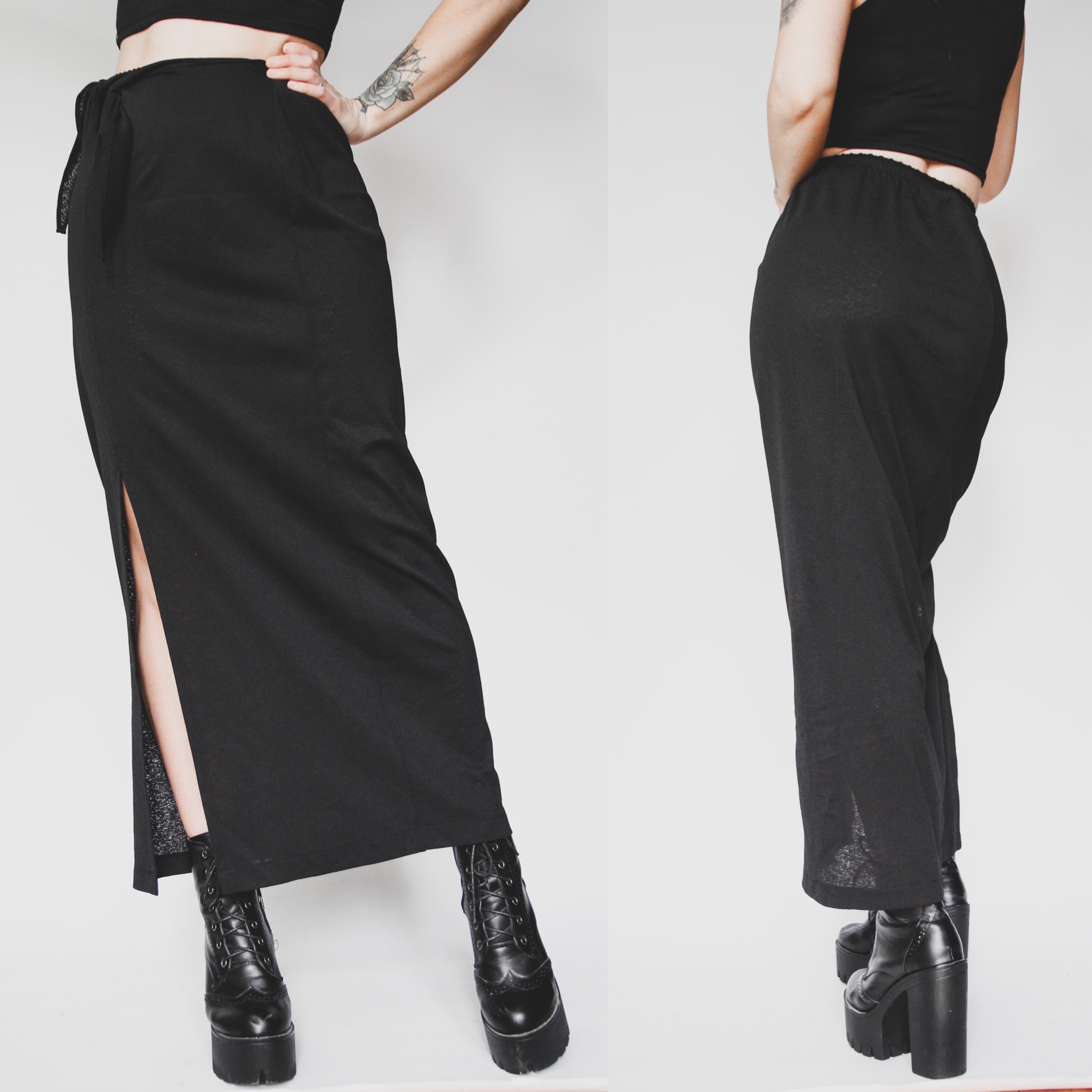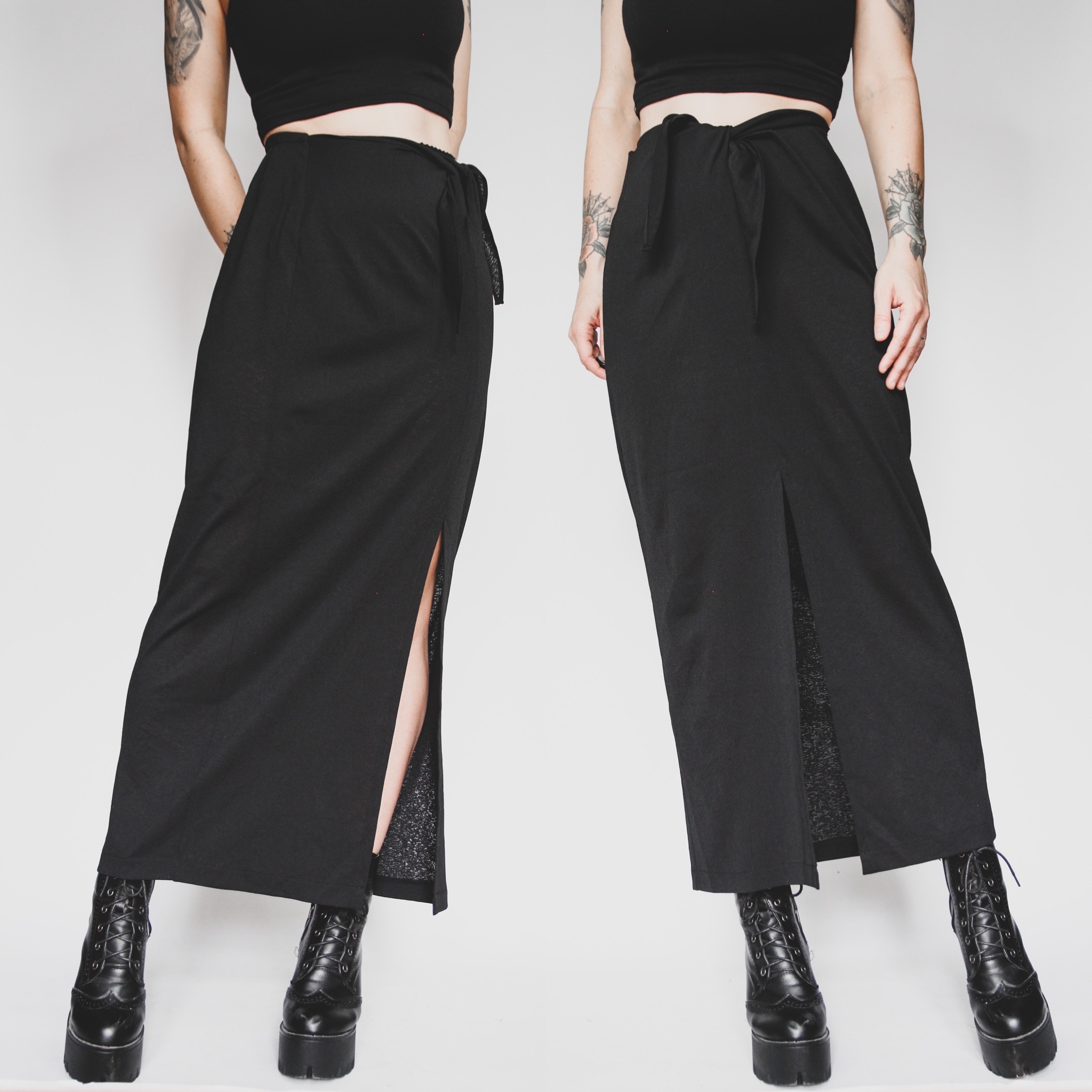 Vintage 90s faux-wrap maxi skirt. Straight cut with a high side slit. Waistband is elasticized in back with adjustable handkerchief-style ties at the top that can be knotted to cinch the waist. 100% poly, lightweight with lots of stretch all over. Pull-on style. Unlined, may be slightly sheer in direct light. May have a bit of itch factor if you're sensitive to synthetic fabrics.