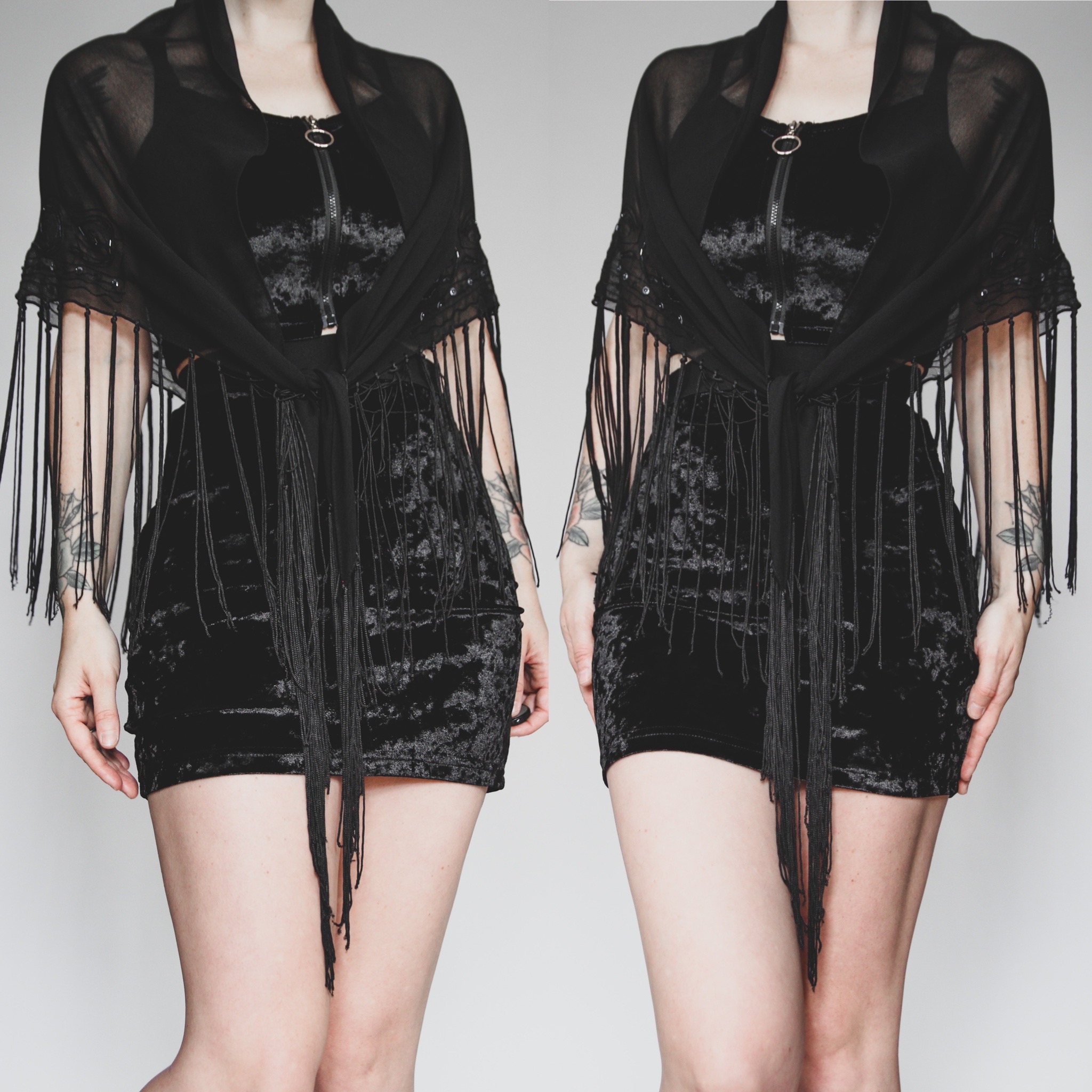 Vintage 90s fringed shawl. All Last Rites signature shawls are one of a kind with unique colors, patterns and lace! No two are alike. This one is a sheer black, with long delicate fringe on two sides and embroidered trim with metallic seed bead and sequin detailing.