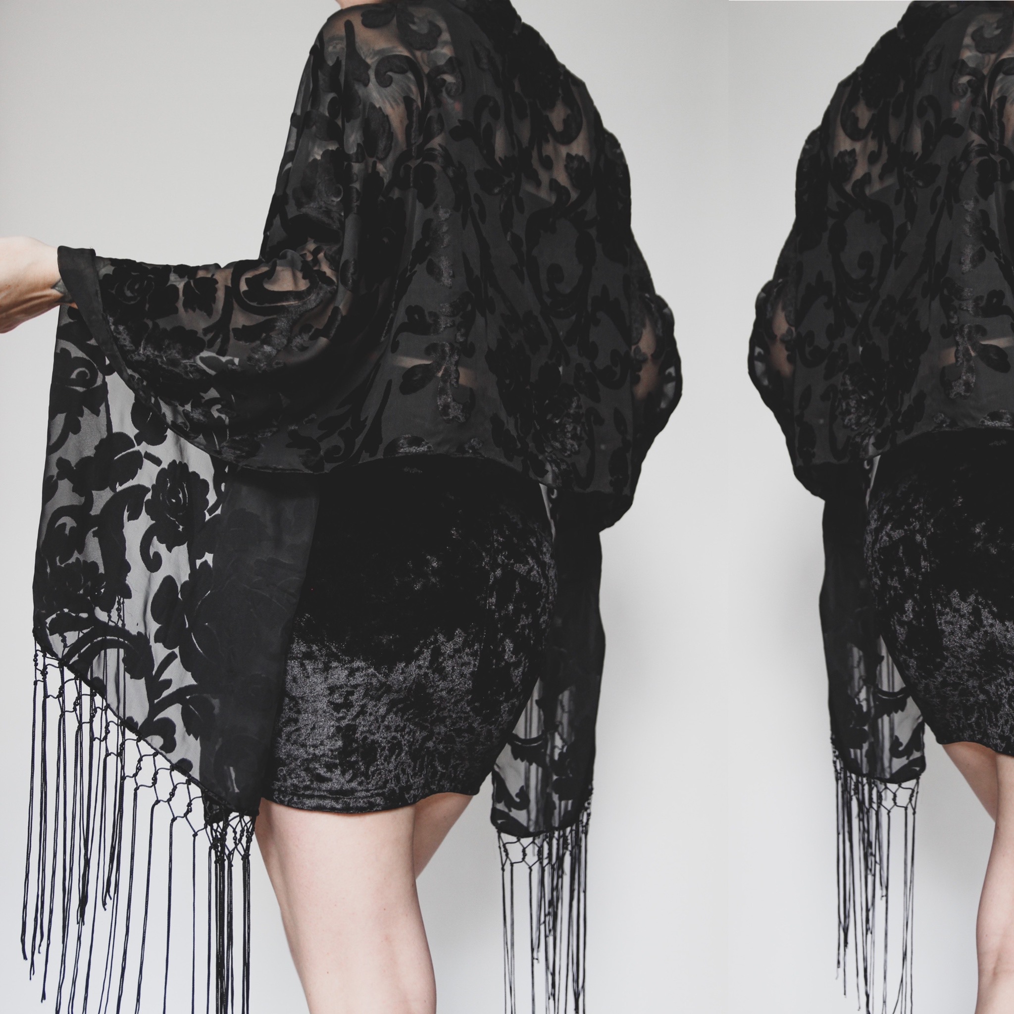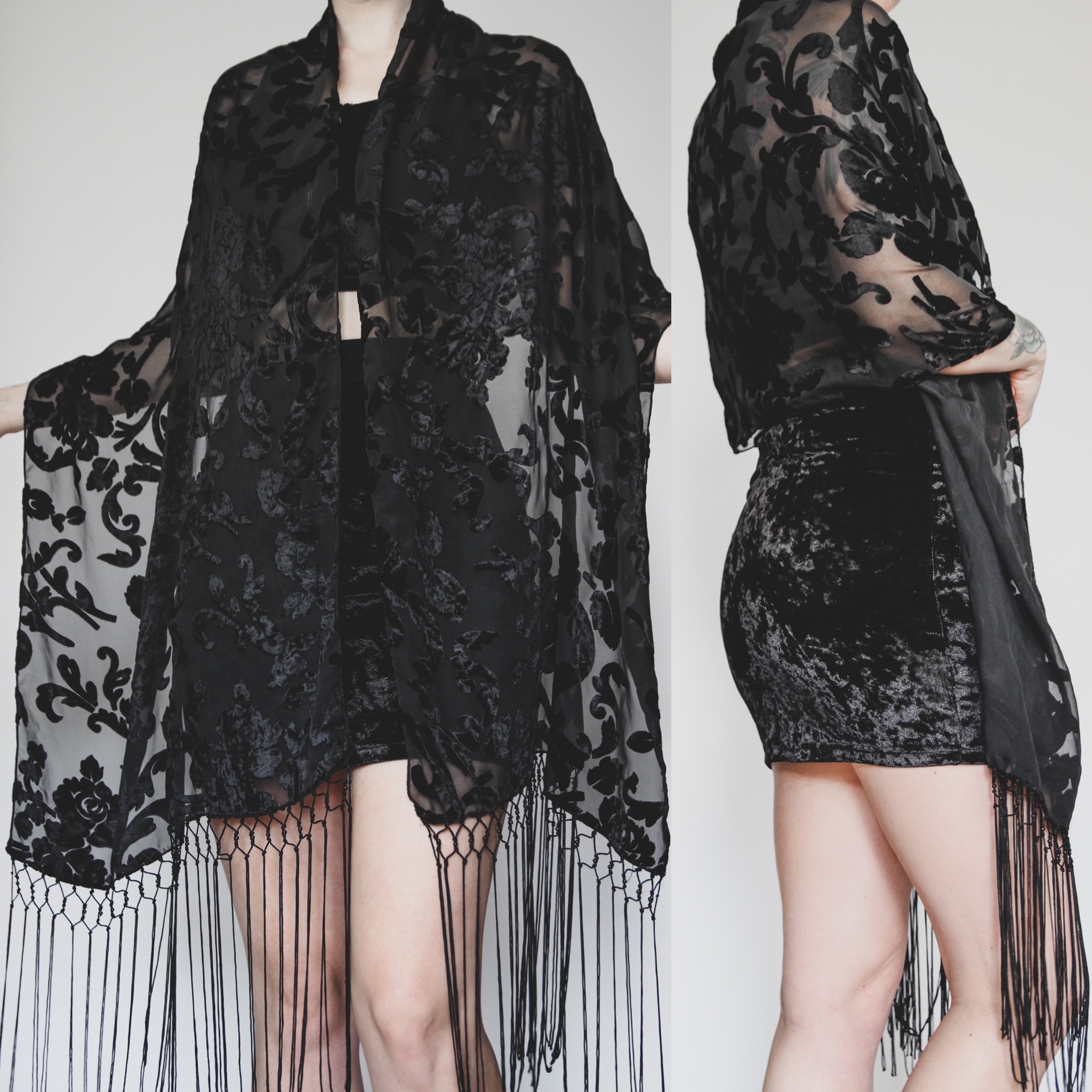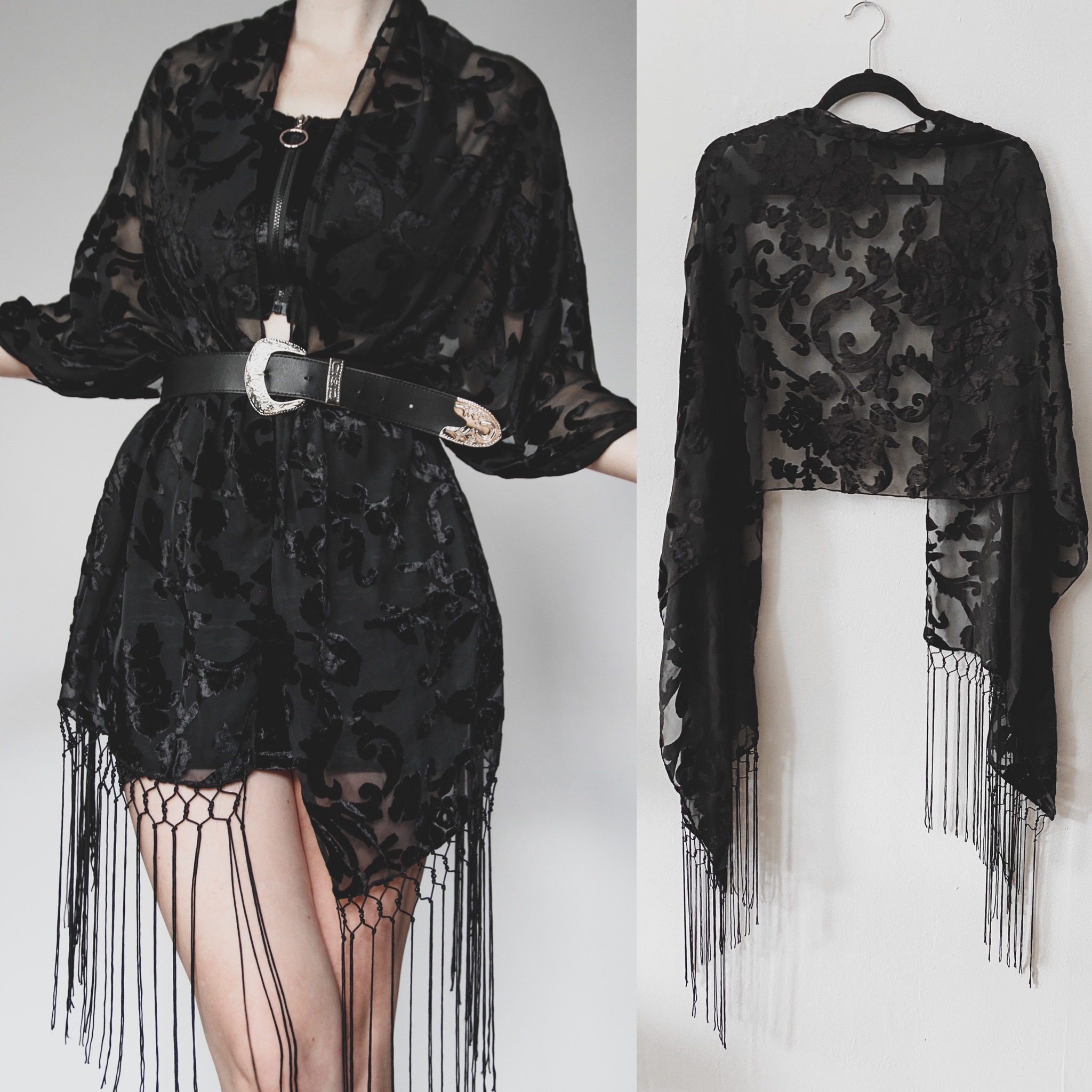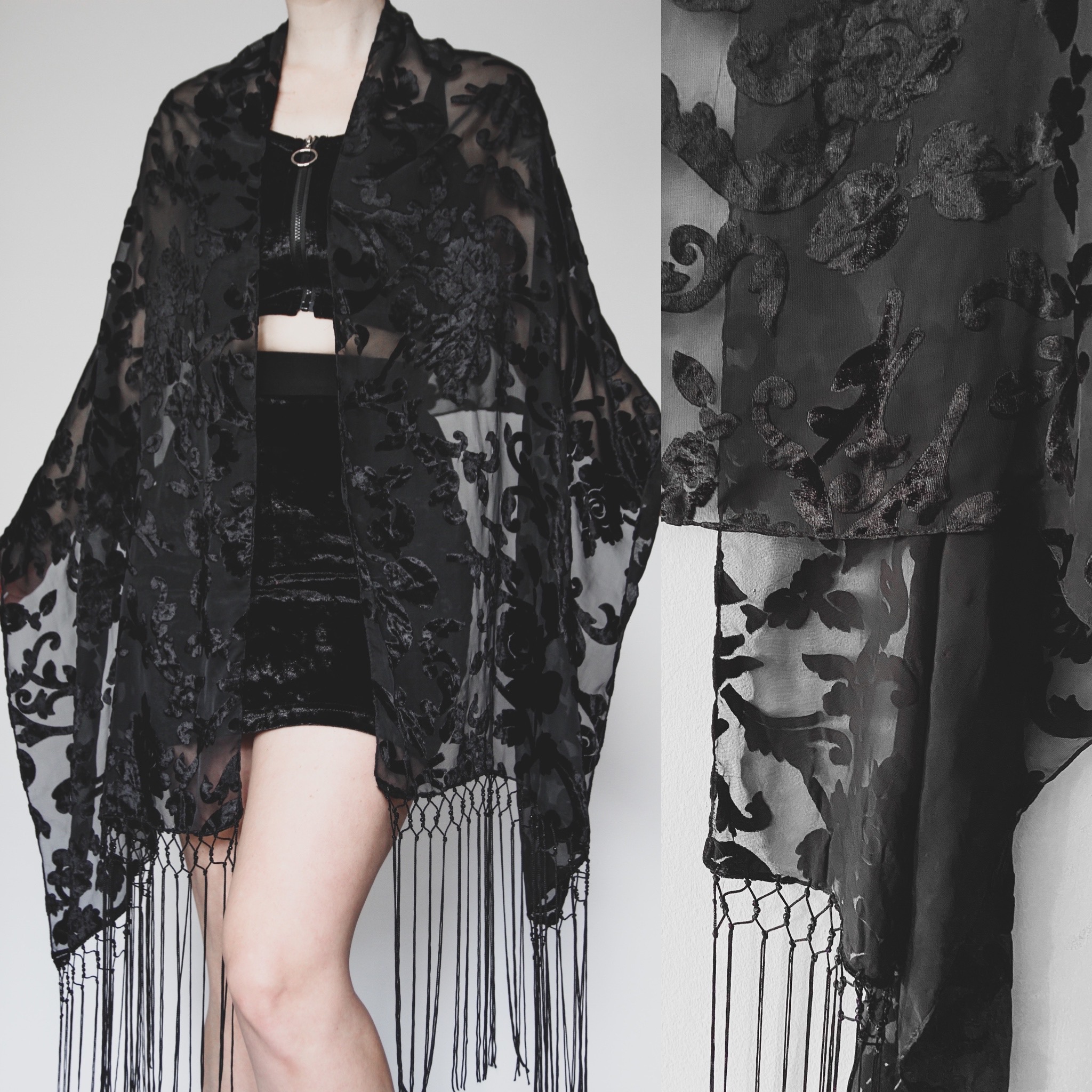 Vintage velvet burnout shawl. All Last Rites signature velvet shawls are one of a kind silk blends with unique colors and patterns! This one is quite a bit thicker and larger than our usual shawls. Sheer black backing with a super-soft black crushed velvet overlay in a Victorian-inspired floral pattern. Long delicate fringe on both ends. Rectangular, XXL oversize style measures 70" by 21". This is a perfect throwover piece for chilly nights and can be layered for all seasons as a scarf or substitute for a jacket or cardigan, draped over your shoulders, belted as a top, or even as a wrap skirt or swim cover up! Or style it as home decor or an altar covering. Stevie Nicks would be proud. One size fits most.
