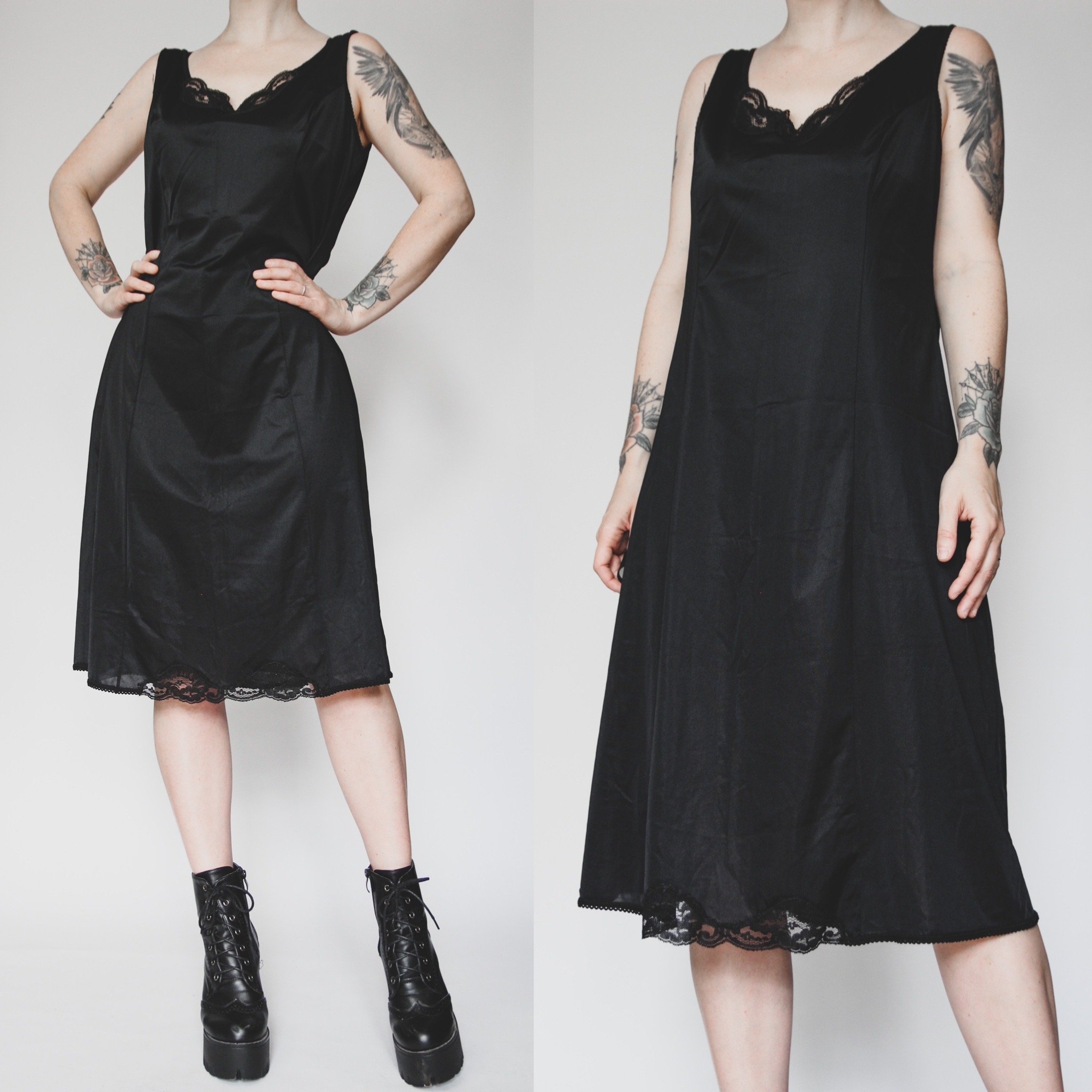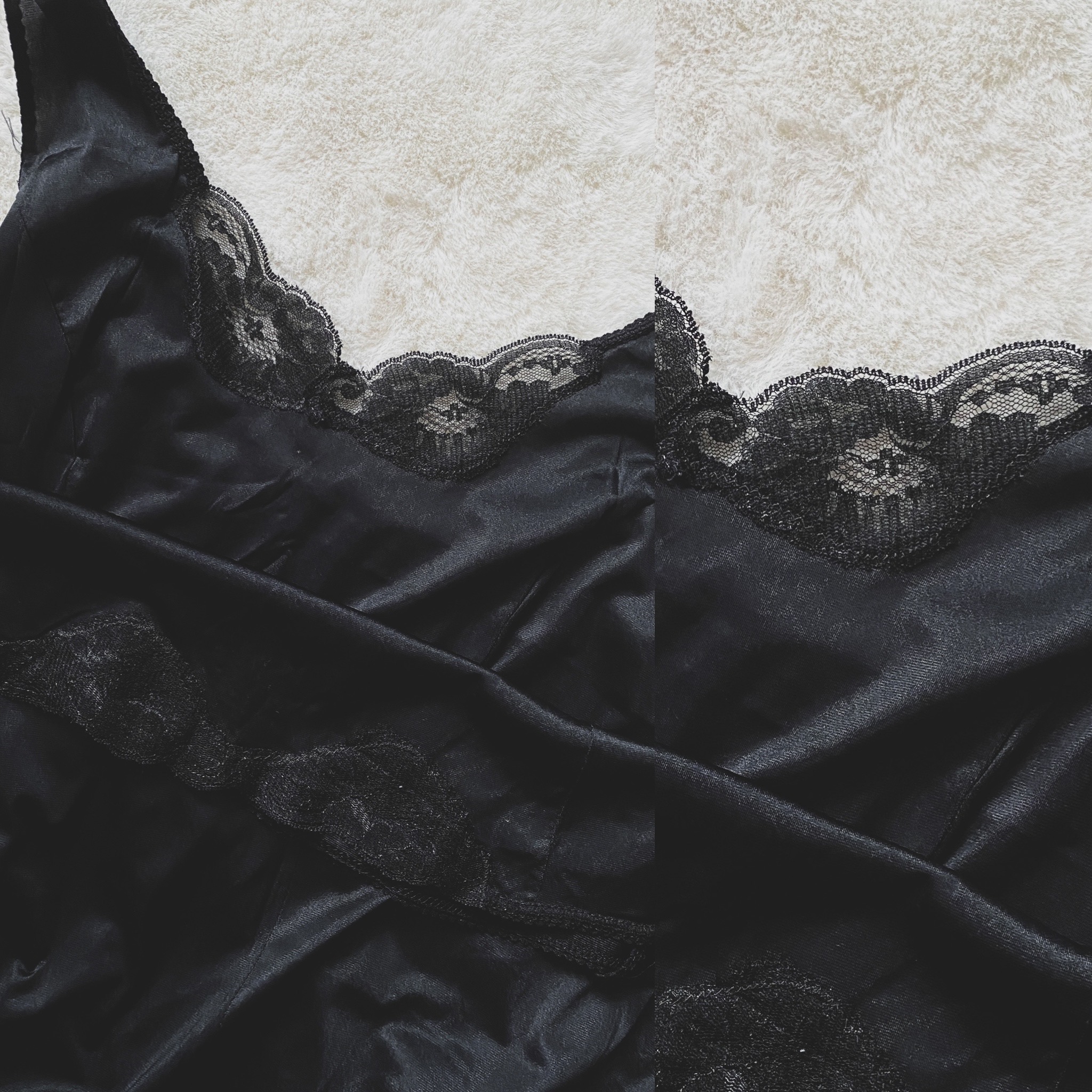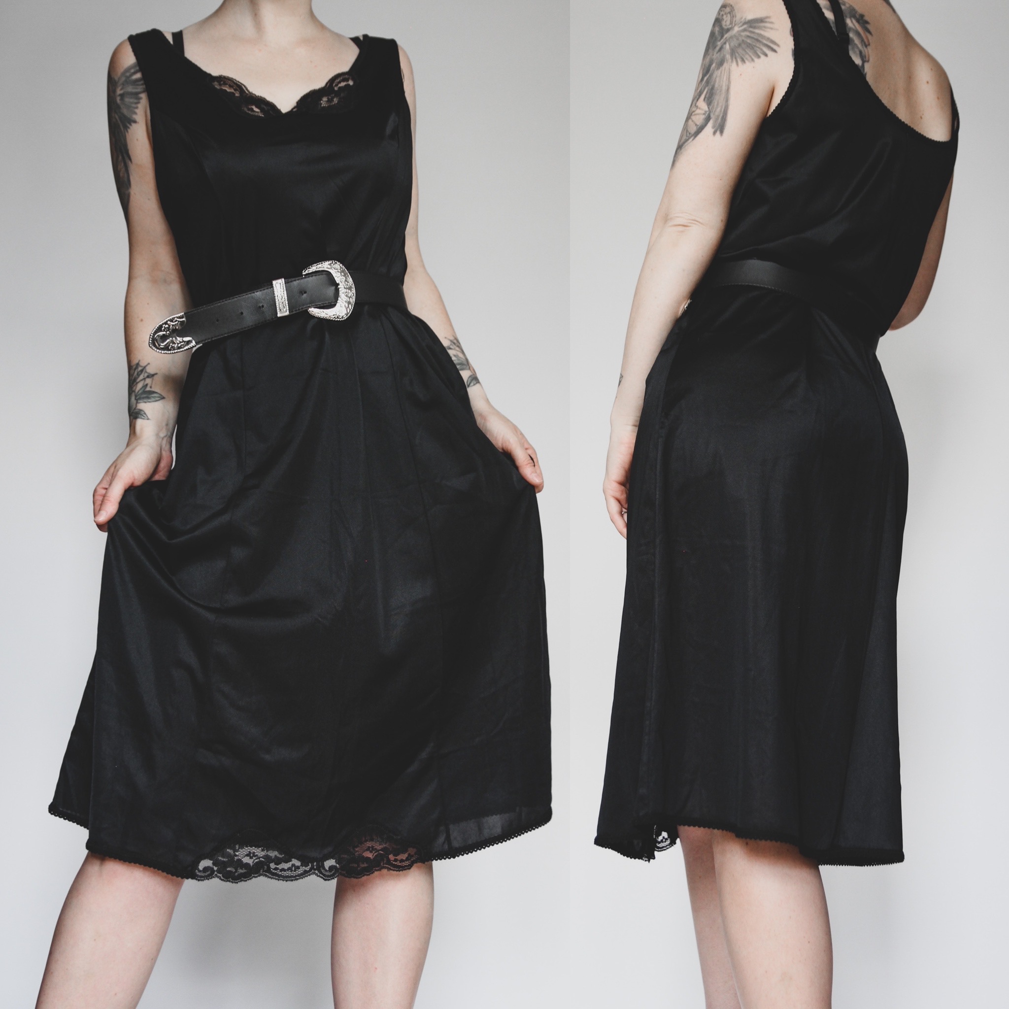 Vintage 80s black nylon satin and lace midi dress. Thin, lightweight, flowy, super soft and comfortable fabric. Can be worn as loungewear or daywear. Belt not included. Unlined, fabric has a bit of stretch but is meant to drape loosely. Boxy, straight cut.