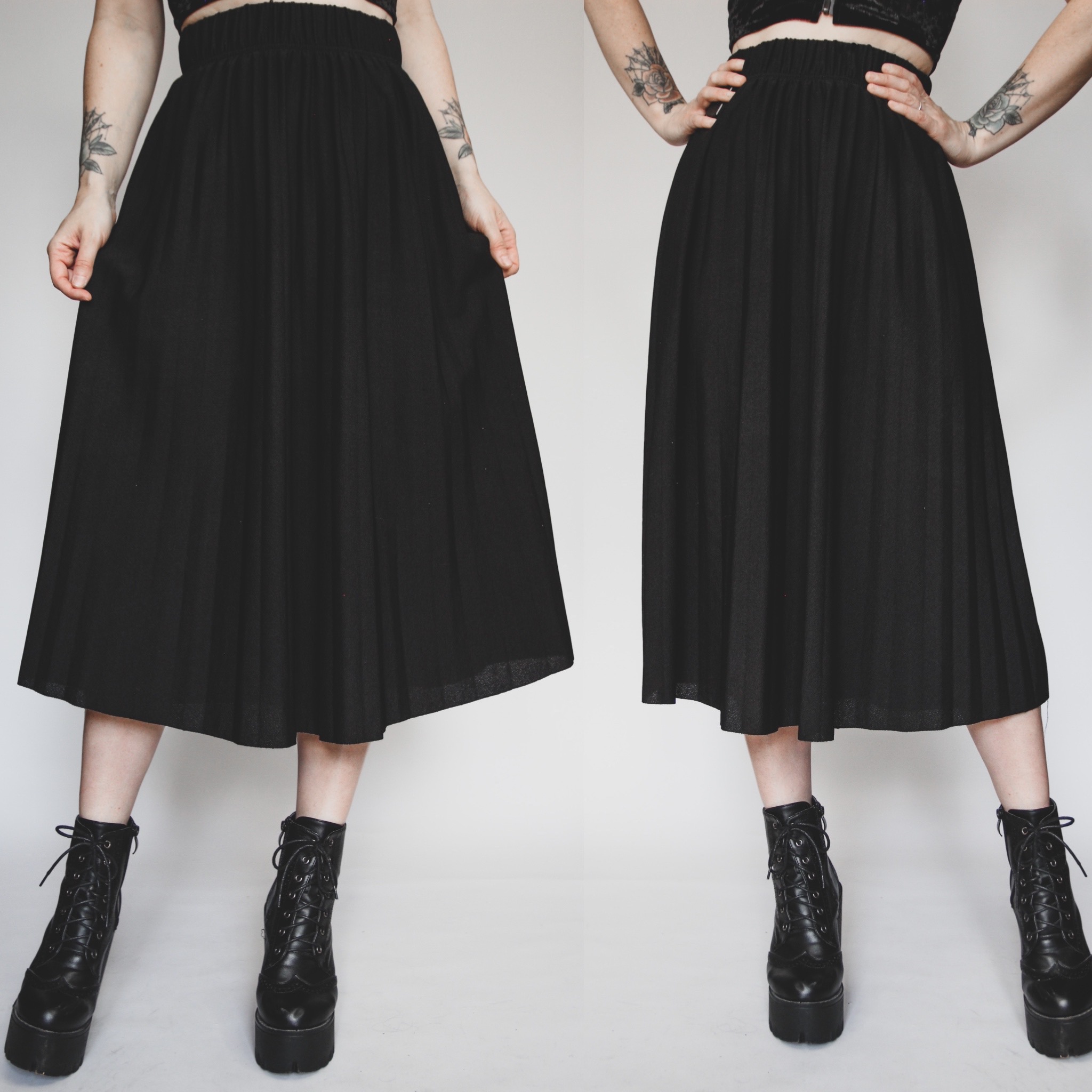 Y2K black pleated midi skirt. Super soft matte fabric with a 2" wide ruched elastic waistband (meant to be worn high-waisted.) Fabric tag is gone but almost certainly polyester or a poly blend. Raw hem, pull on, unlined. No real stretch other than the waist. Full A-line cut flares slightly from the waist down with soft pleats. The perfect witchy staple skirt - fancy casual, or even for the office!