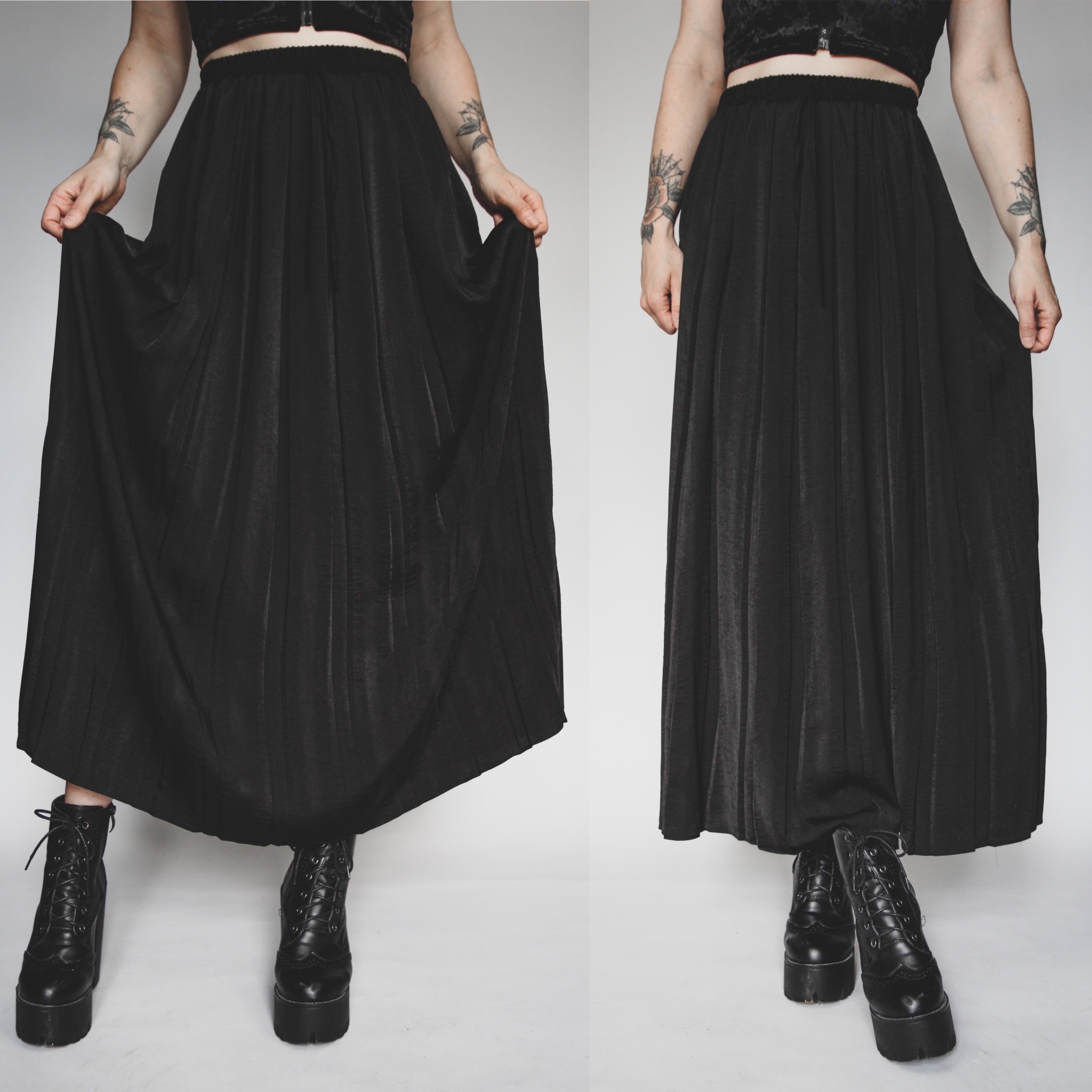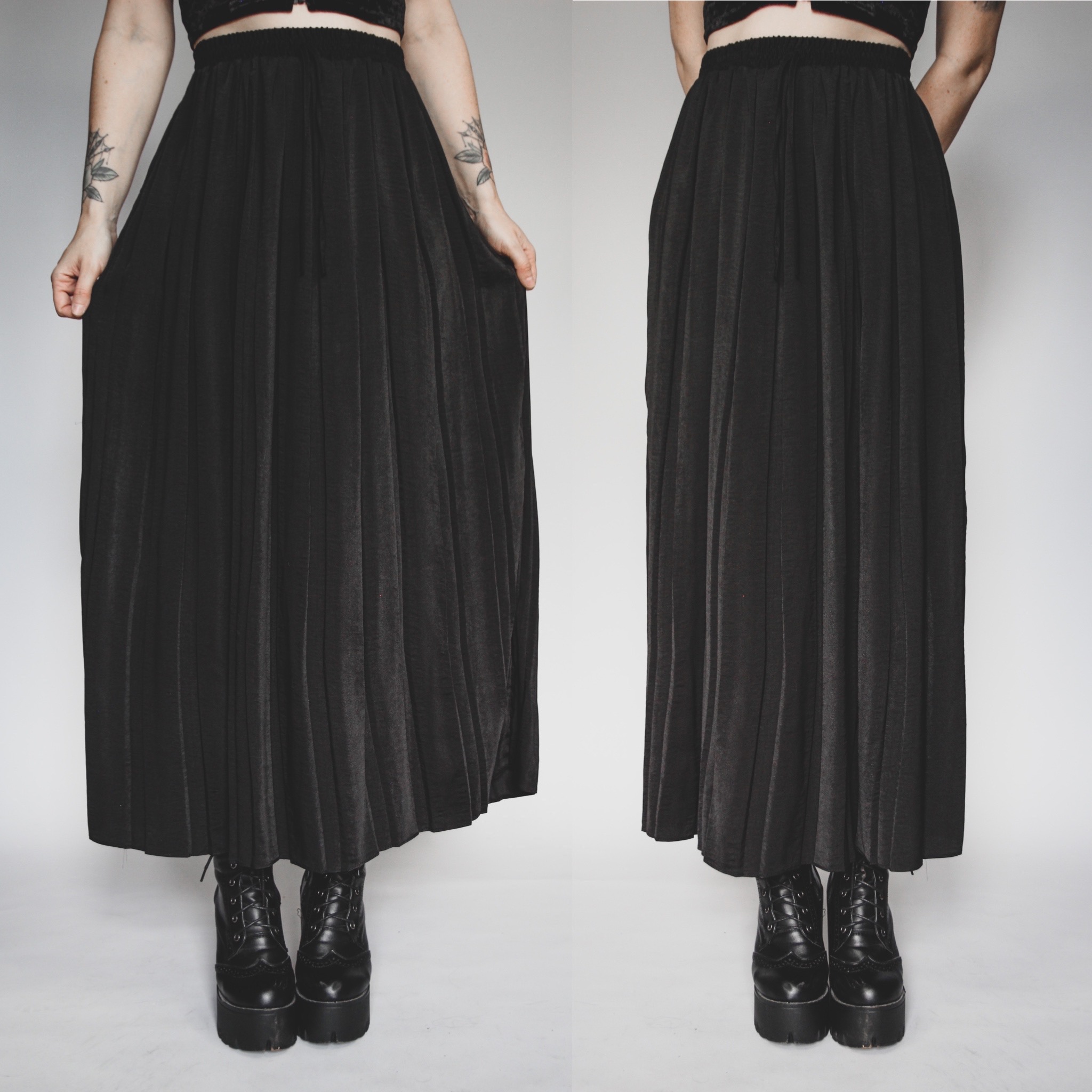 Modern black pleated maxi skirt. Super soft, semi-gloss 100% poly fabric with a 1.5" wide ruched elastic waistband (meant to be worn high-waisted.) Pull on, unlined. Nlostretch other than the waist. Decorative (non-cinchable) drawstring detail at the front, can be easily moved. Flares slightly from the waist down with soft pleats. The perfect witchy staple skirt - fancy casual, or even for the office!