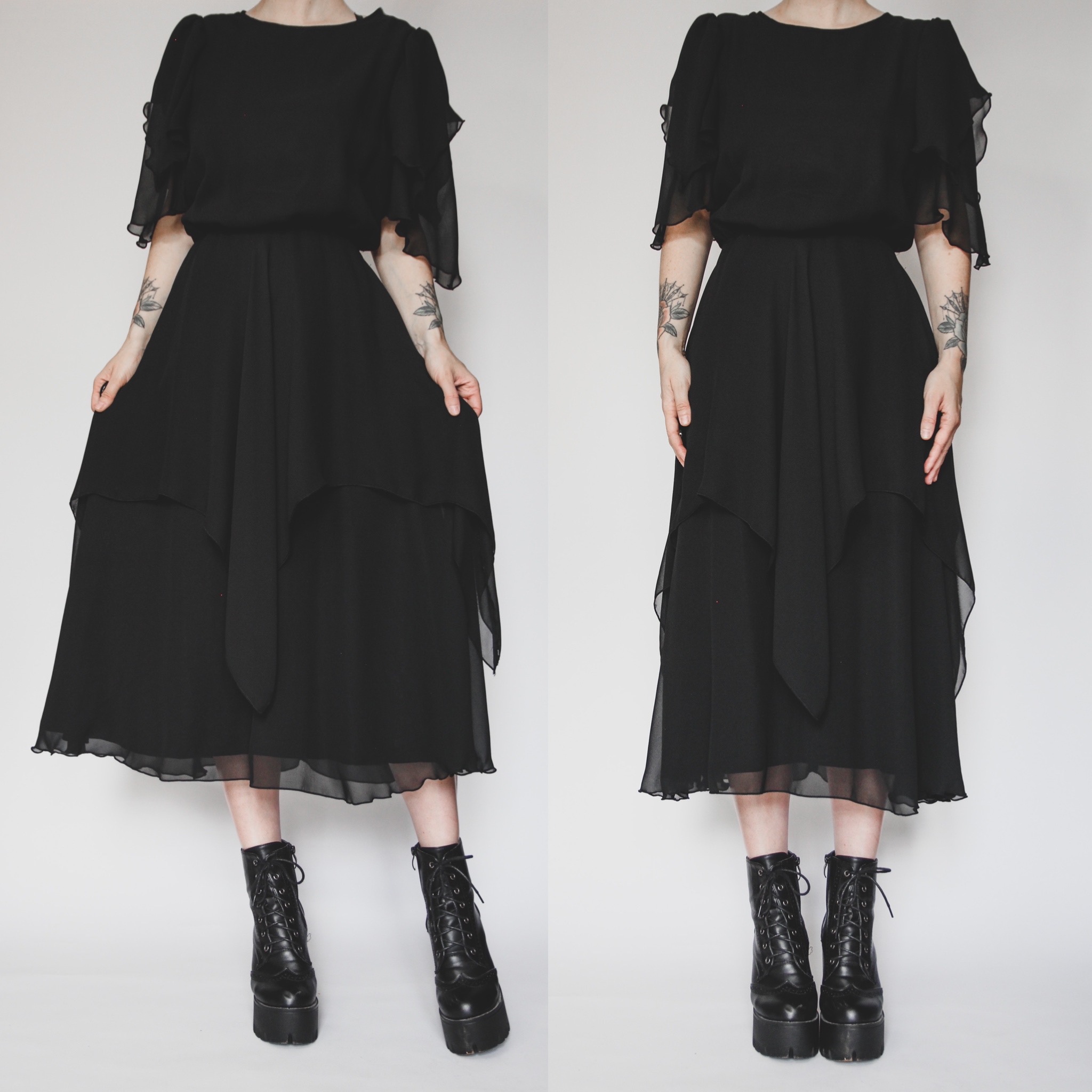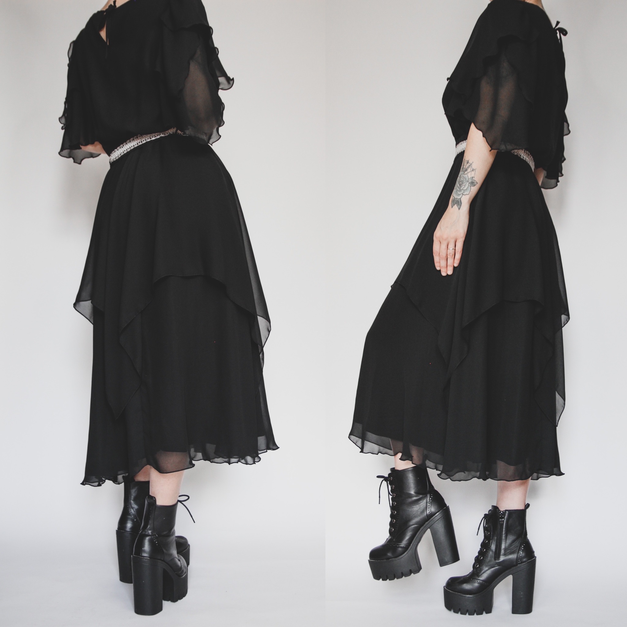 Vintage black ruffle dress. Construction and tag dates it between 1940s - 1960s. One of our exclusive market display pieces, finally hitting the webstore! Semi-sheer poly-chiffon with flowy, double-layered full skirt and sleeves. Ties at the back of the neck. Hidden side zip from hip to underarm. Fully lined in poly satin. Stretchy gathered elastic waist with belt loops and a removable belt with faux pearls and ivory crochet detailing.