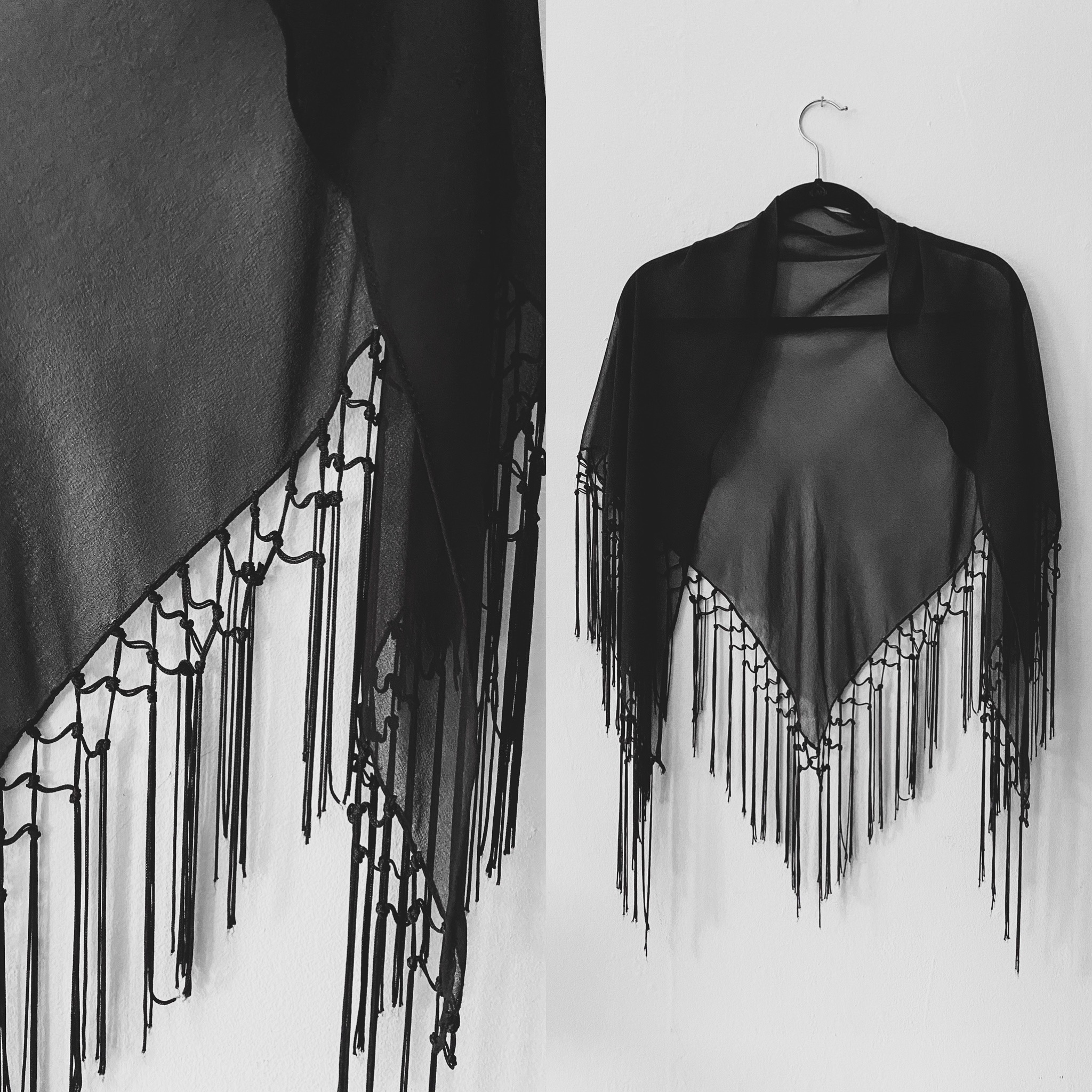 Vintage 90s fringed shawl. All Last Rites signature shawls are one of a kind with unique colors, patterns and lace! No two are alike. This one is a sheer black, with long delicate braided fringe on two sides. Simple, classic and versatile!
