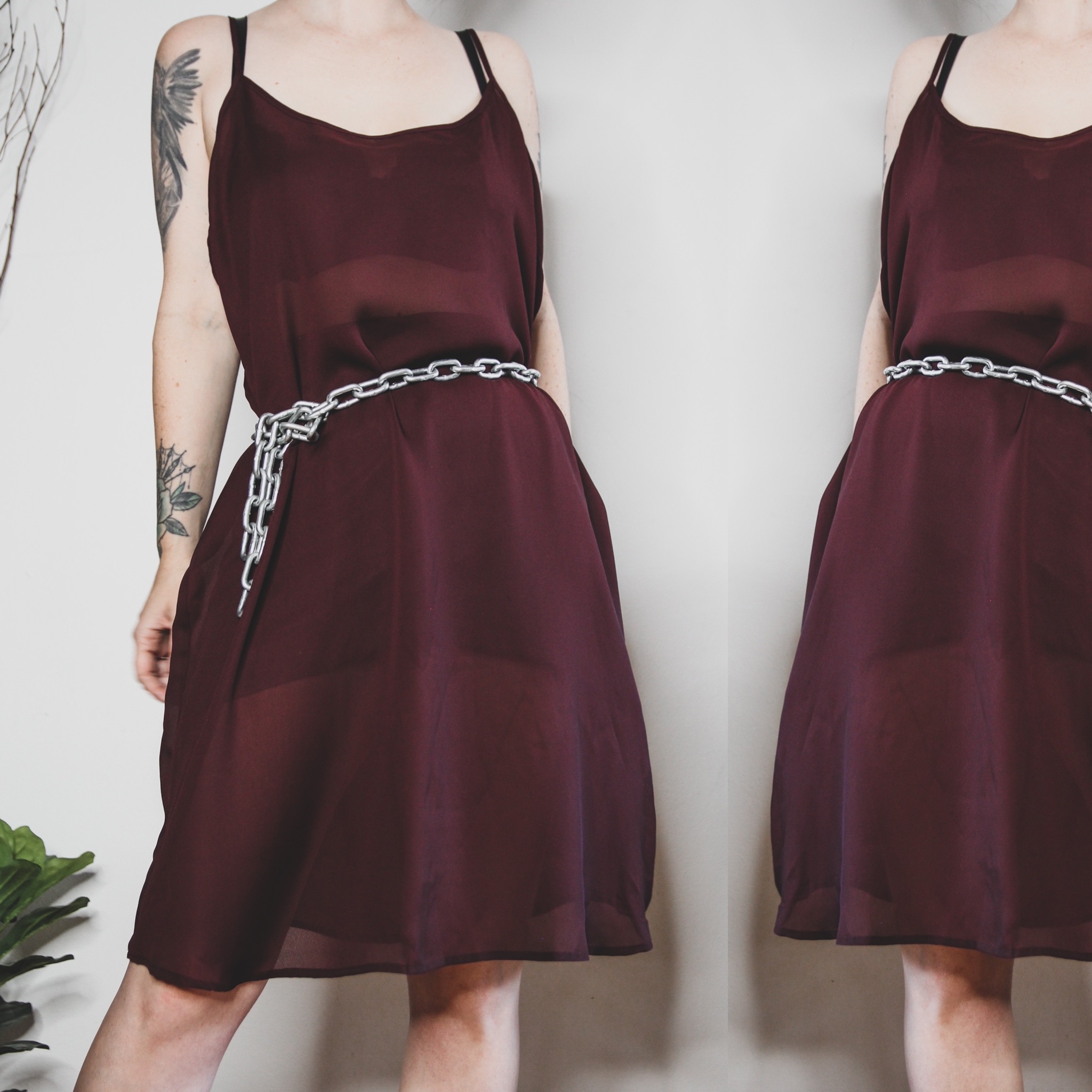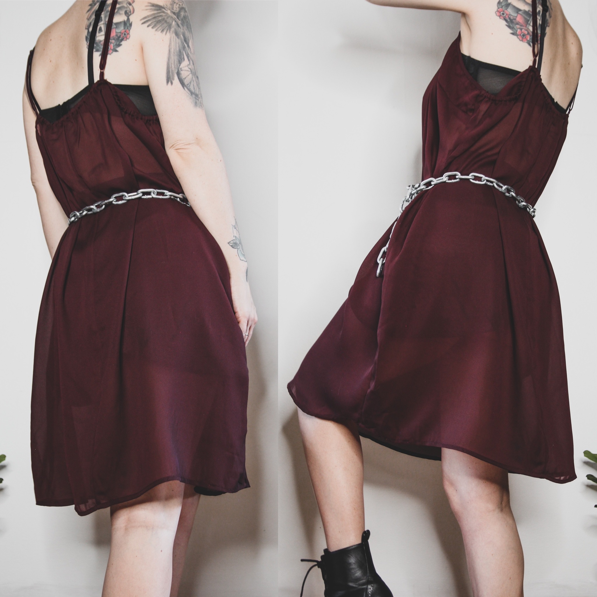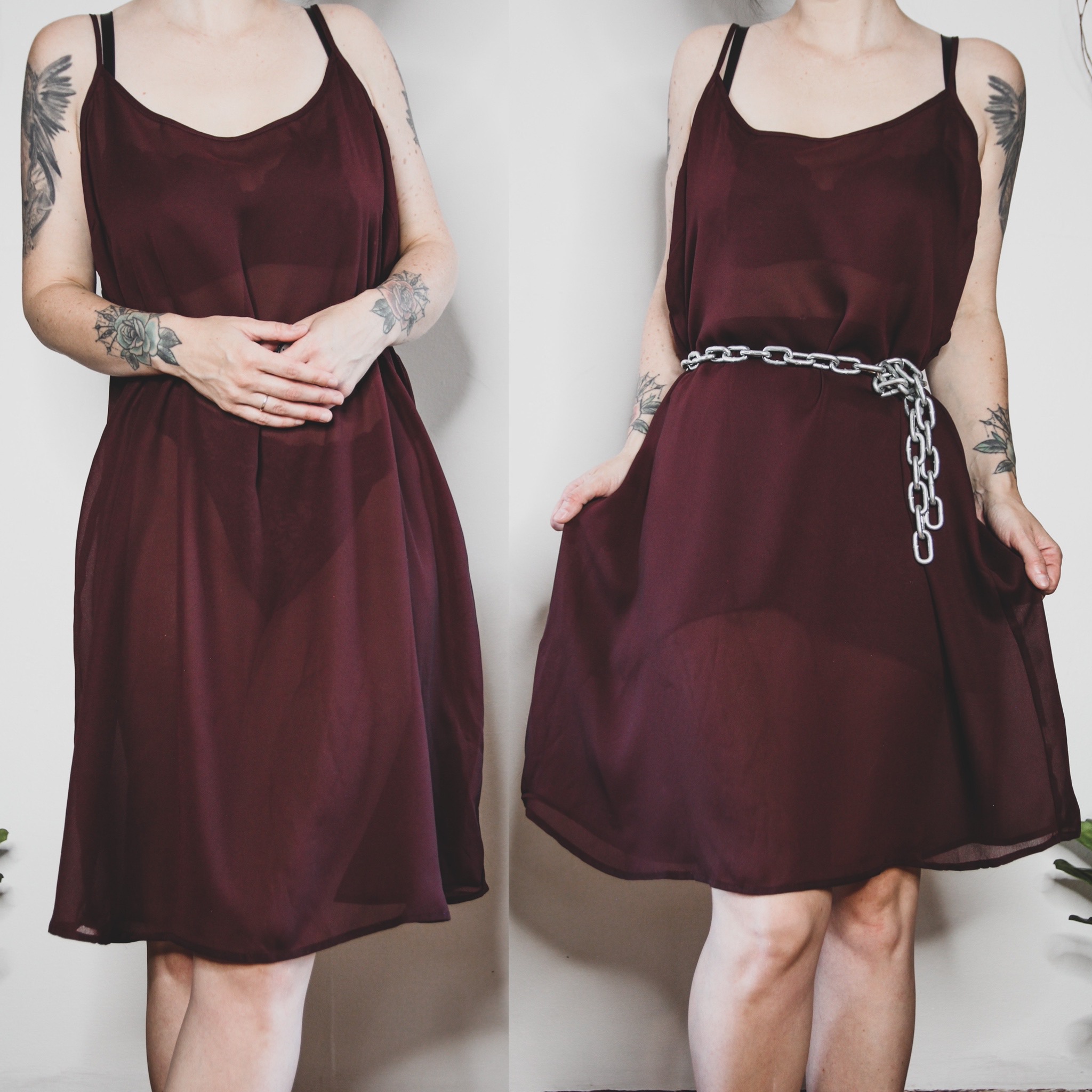 Y2K sheer mini dress in a rare burgundy color! Can be worn as loungewear or layered up with simple lining pieces (bike shorts, leggings, bodycon skirt or dress, bralette, etc.) and worn out and about. Add your favorite belt or harness to spice it up.