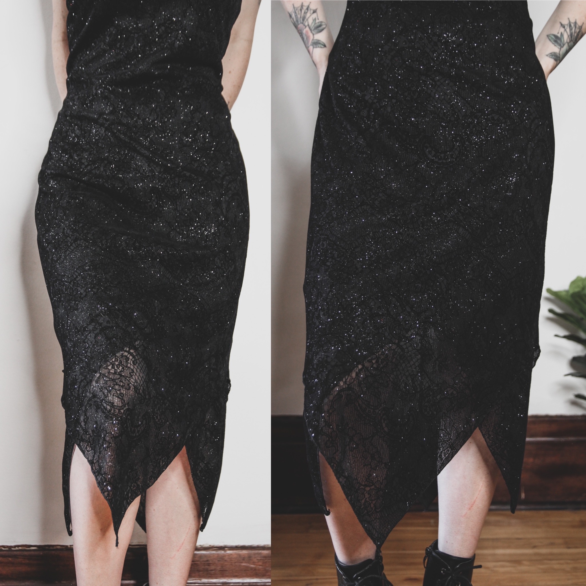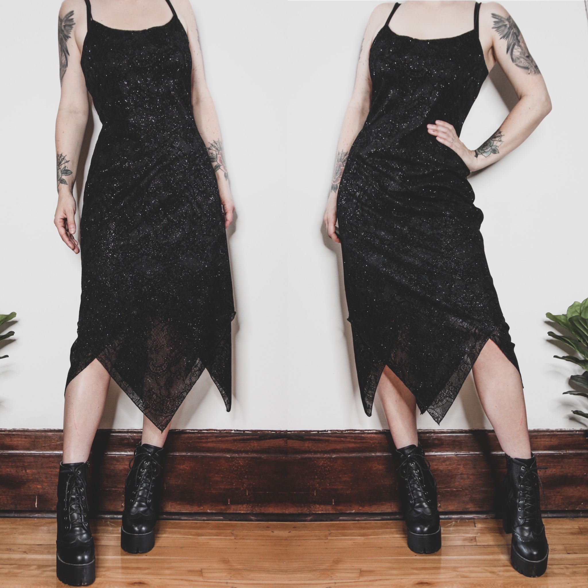 Vintage 90s Byer Too cocktail dress. This one has so many fun details! Lace-print velvet burnout overlay, asymmetrical handkerchief hem, and sparkly silver glitter all over. Elastic cord straps (strechy but non-adjustable) and double layered with a built in poly satin lining. Fabric is 100% poly, not stretchy but does have a bit of "give". Pull on style.