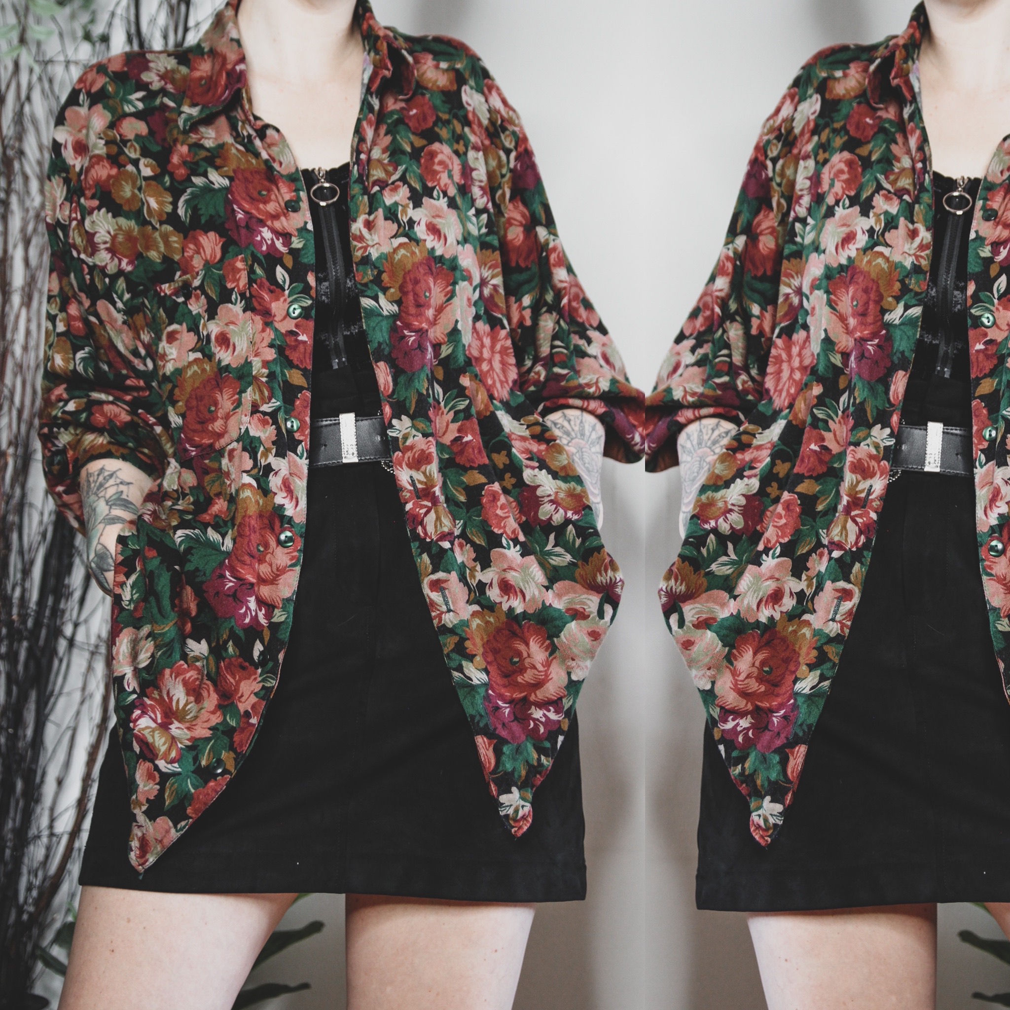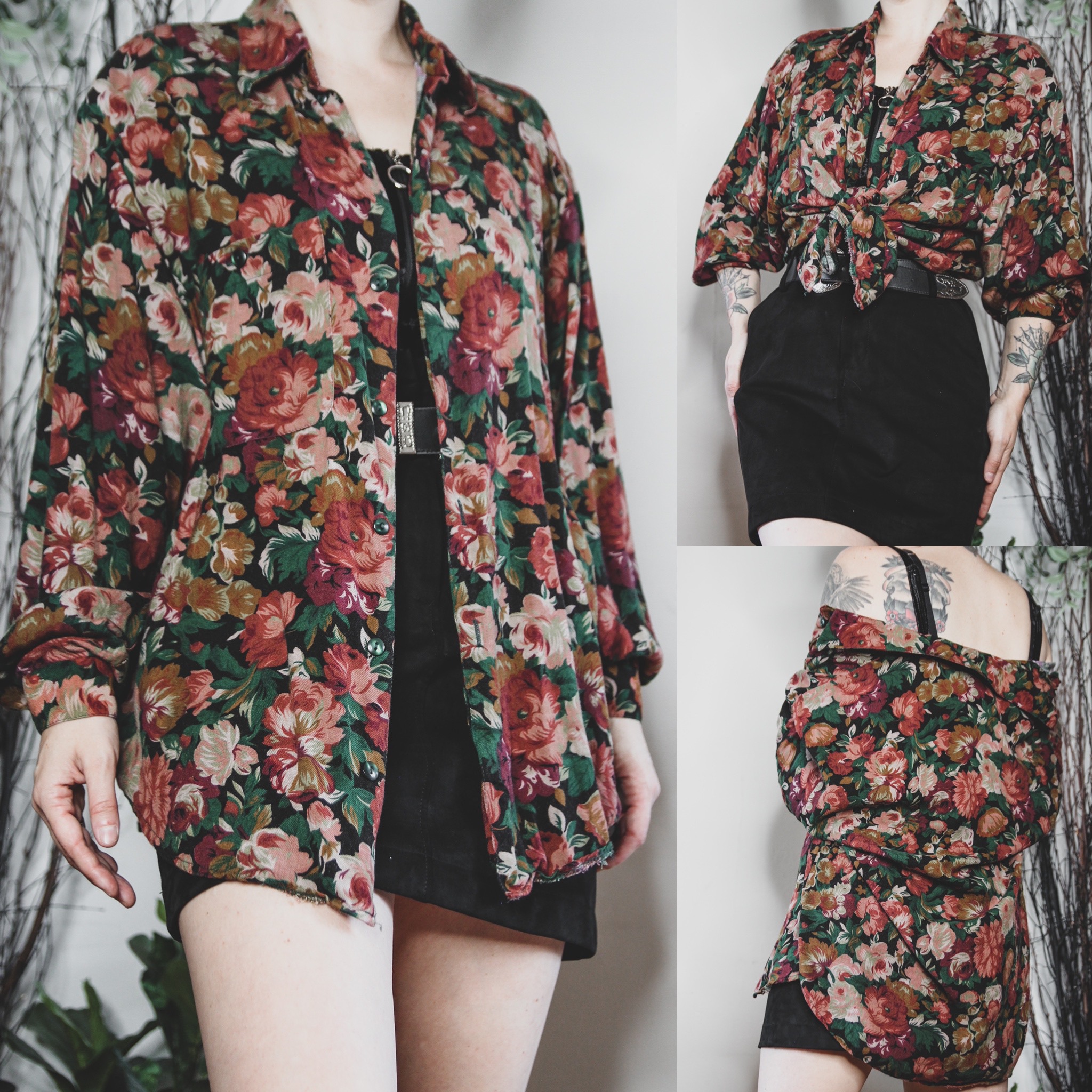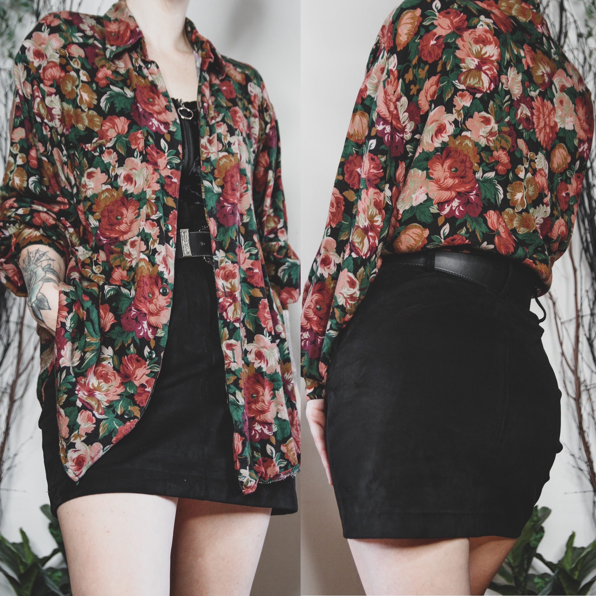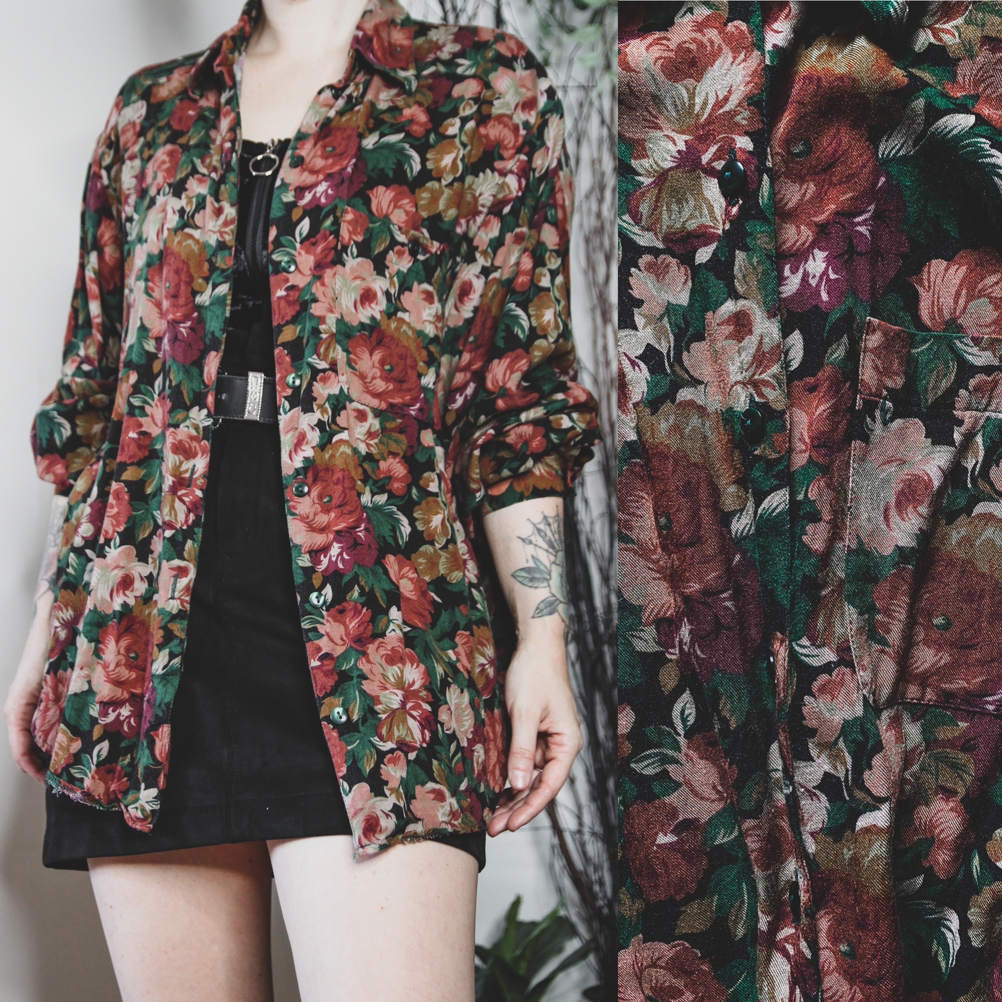 Vintage 80s dark floral blouse. Red, green and gold on black. No fabric tag but feels like an ultra-soft, perfectly broken in rayon blend. No stretch, unlined. Boxy cut with loose sleeves and fitted buttoned cuffs. Easy to dress up or down for the office or every day!