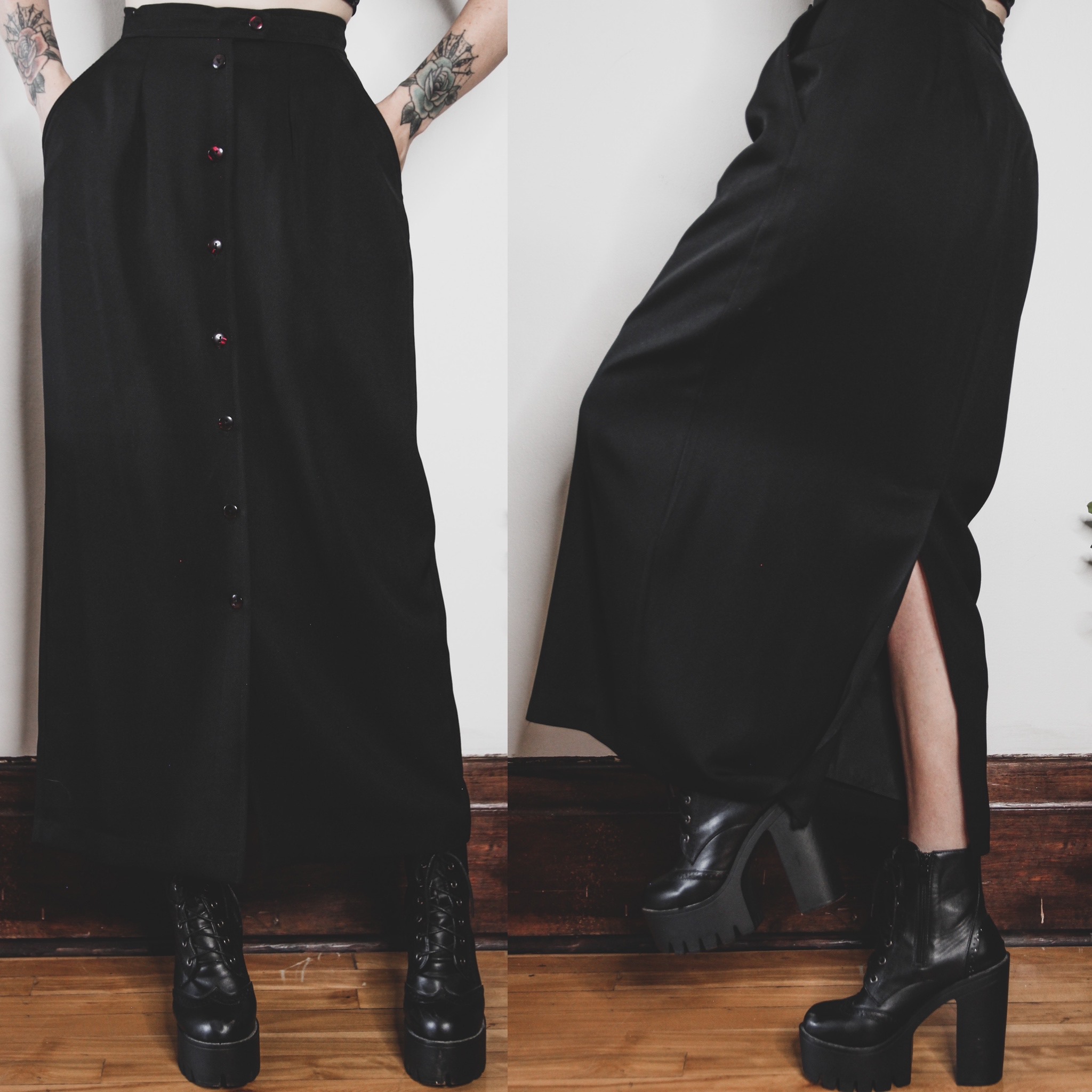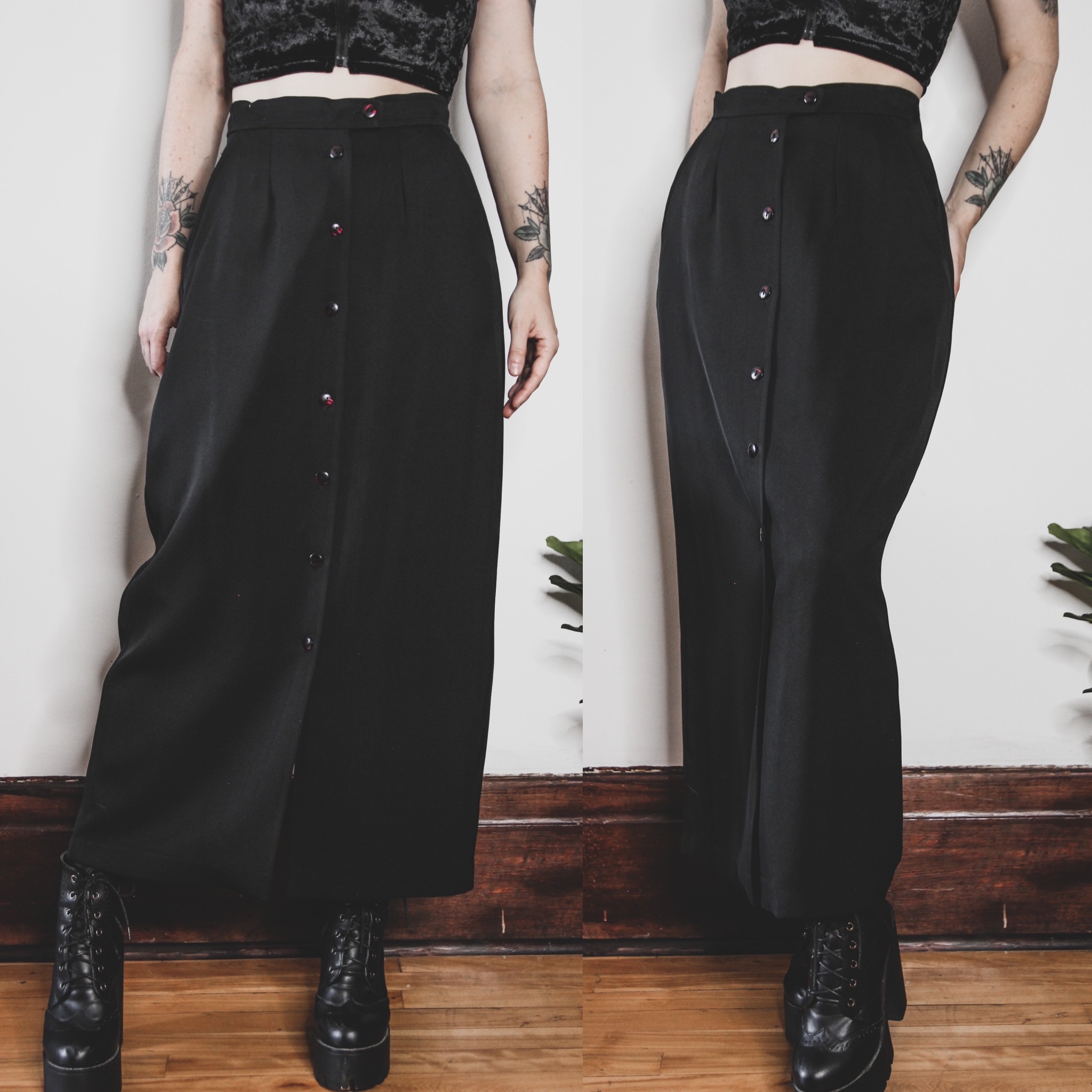 Vintage 80s Mali button down skirt. Tuxedo style with a straight column cut, roomy pockets and a full acetate liner layer. Functional buttons down the front with double-button closure at the waist. Meant to be worn high waisted. Unlined, no stretch whatsoever. Easy to dress up or down!