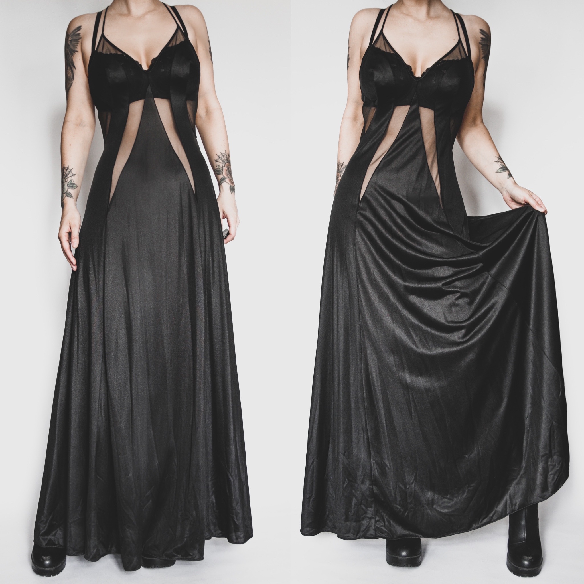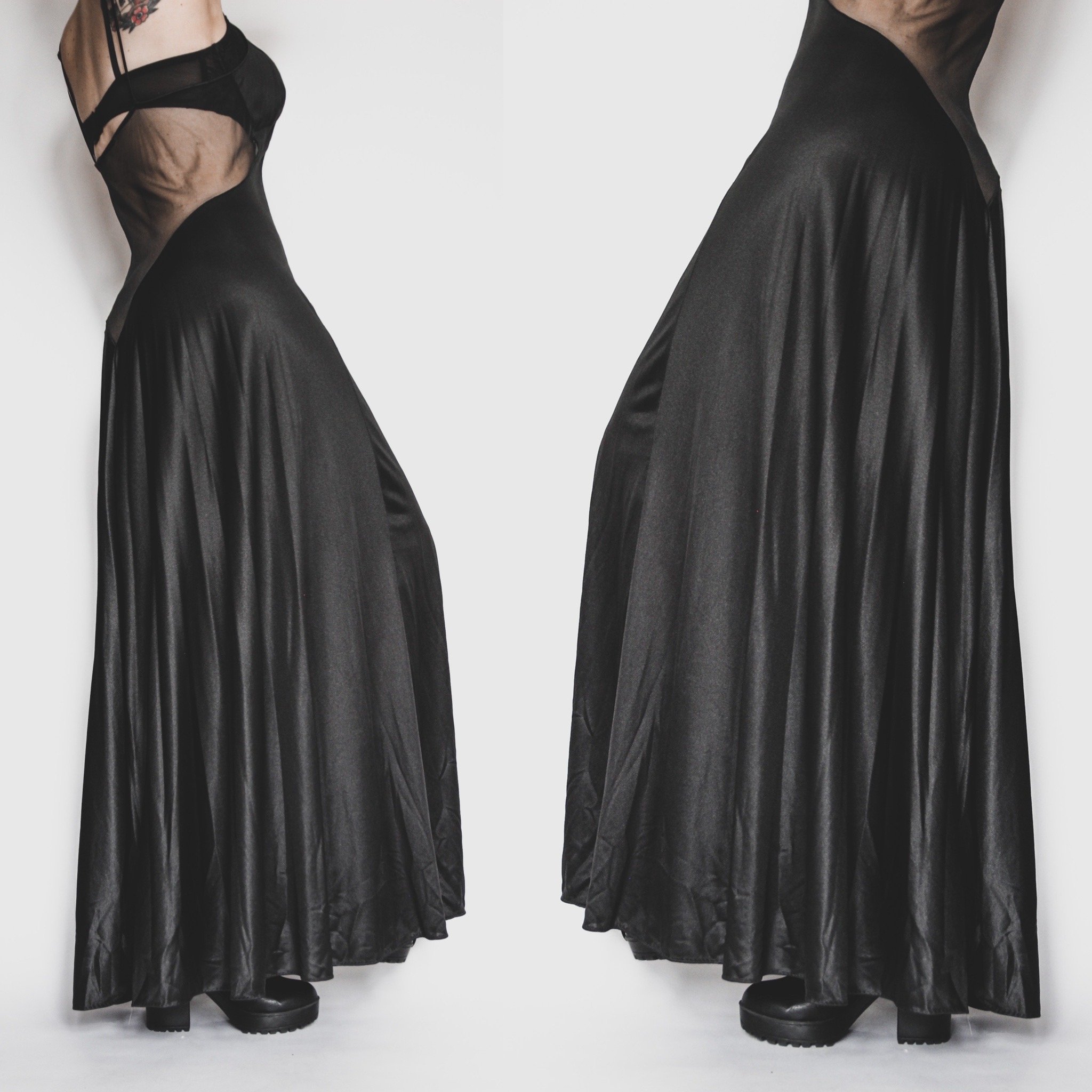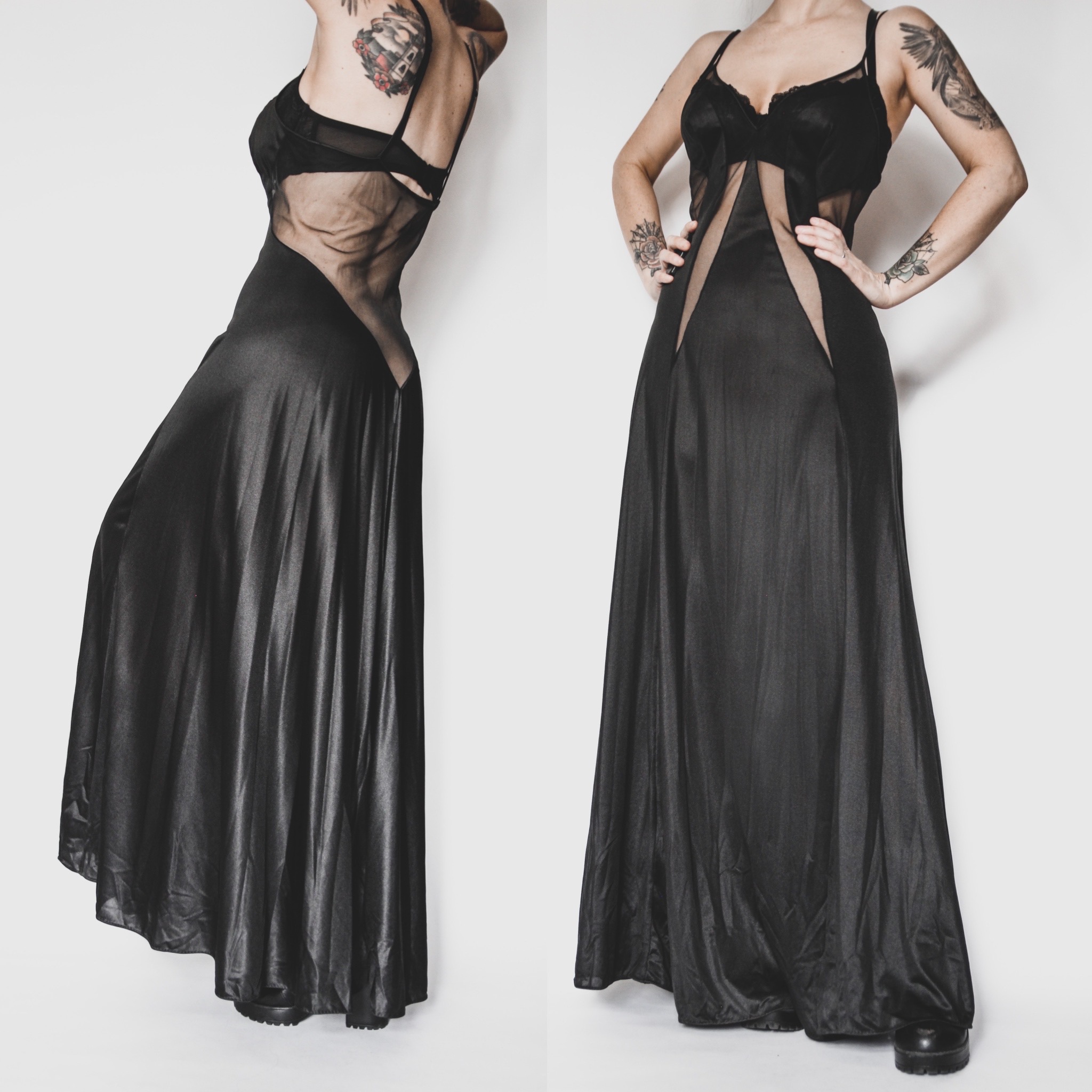 Vintage Blanche by Ralph Montenero nylon satin dressing gown. Deep v-neck and low back, with sheer cutouts in front and at the sides, and an even deeper sheer plunge cutout in back - escándalo! Full flared skirt. Straps are quite long and non-adjustable, but can be easily shortened if you're handy with a needle and thread. Unlined, no stretch. Bust has some slight contouring for fuller cup sizes.