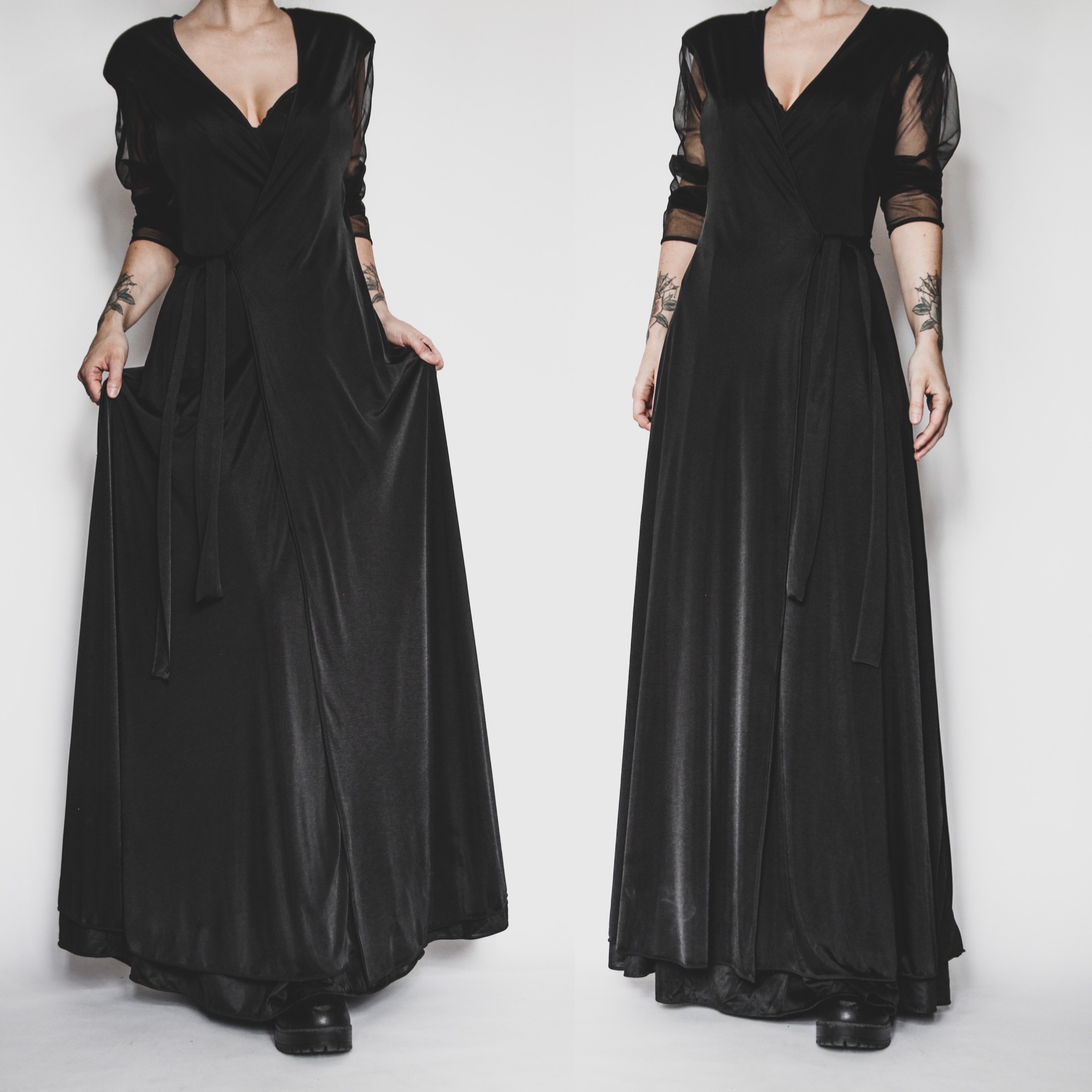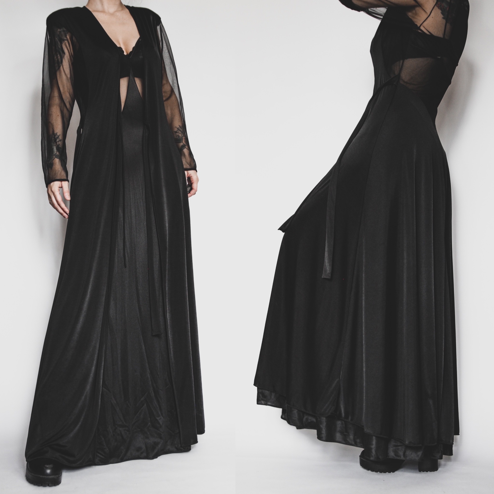 Vintage nylon satin dressing gown. Tag is gone but likely 80s/90s. So witchy and classic! Fully sheer mesh back with a basque waist, sheer loose sleeves and opaque front and skirt. Inner ties at the side of the hip and attached outer ties for closure. Original shoulder pads intact but can be easily removed if you prefer a little less drama up top! Gorgeous full skirt and beautiful movement. Mesh areas have a few teeny fabric snags due to age, but no noticeable imperfections.
