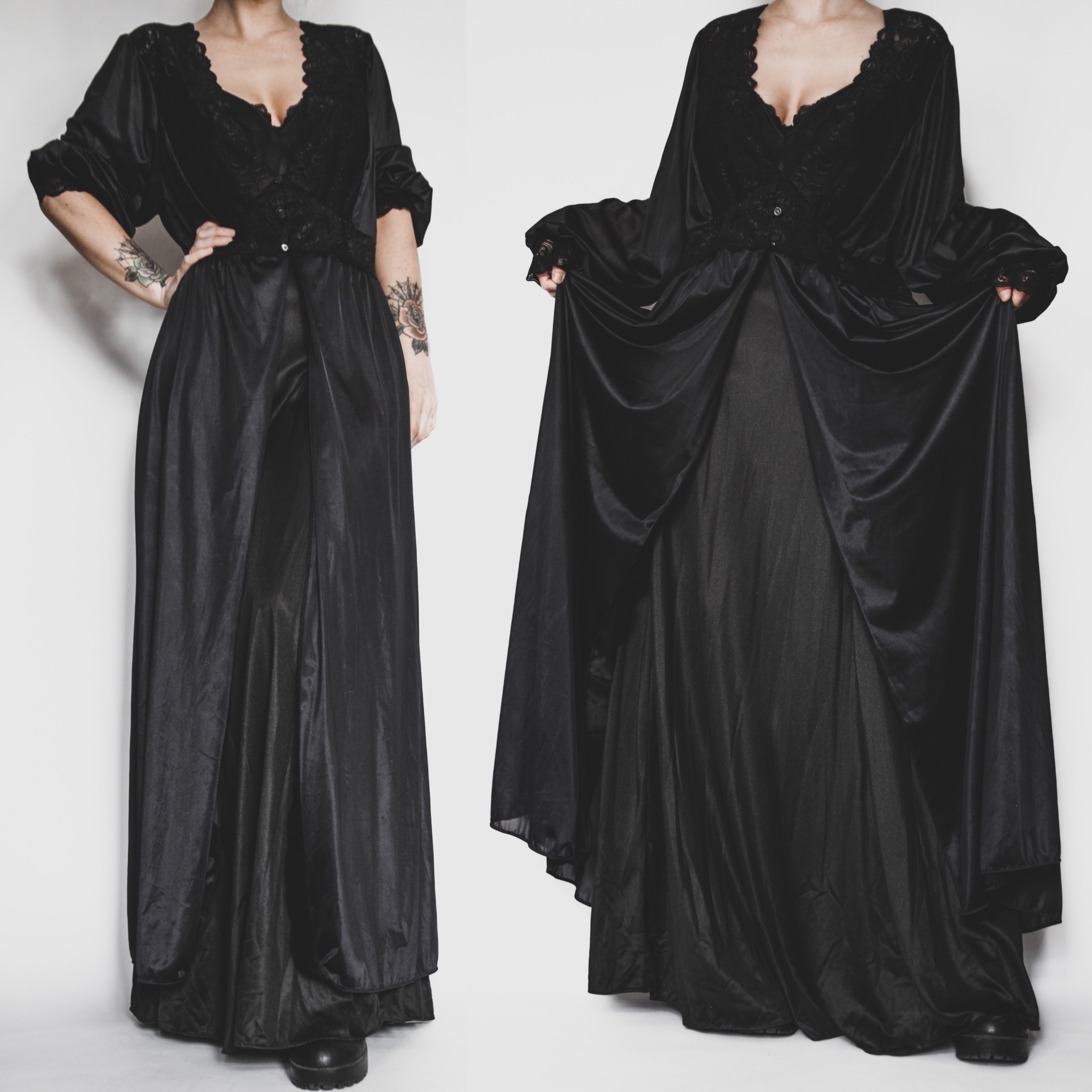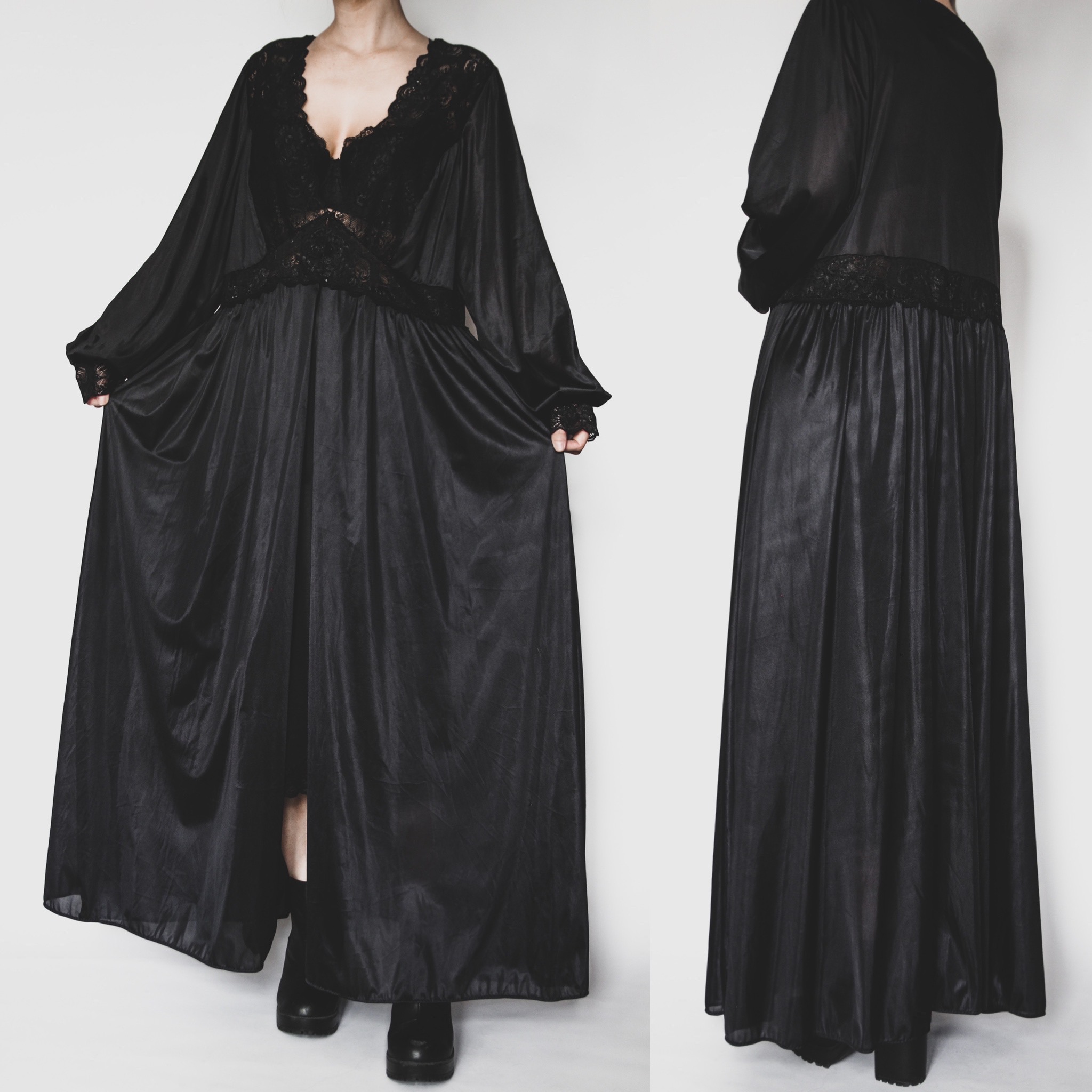 Modern vintage-style nylon satin dressing gown. V-neck, balloon sleeves with fitted lace trim at the cuffs, waist and bodice. 3 button closure at the bust and am empire waist. Comfortable and glamorous, perfect for a cozy night in watching vampire movies!
