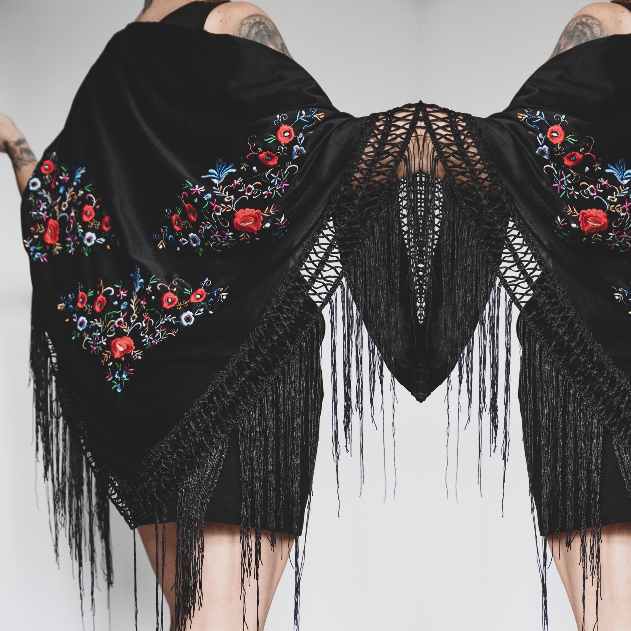 Floral embroidered fringed shawl. All Last Rites signature shawls are one of a kind with unique colors, patterns and lace! No two are alike. This one is an opaque, midweight black poly satin with colorful floral embroidery and braided fringe. Most likely vintage but could be convincing modern repro.