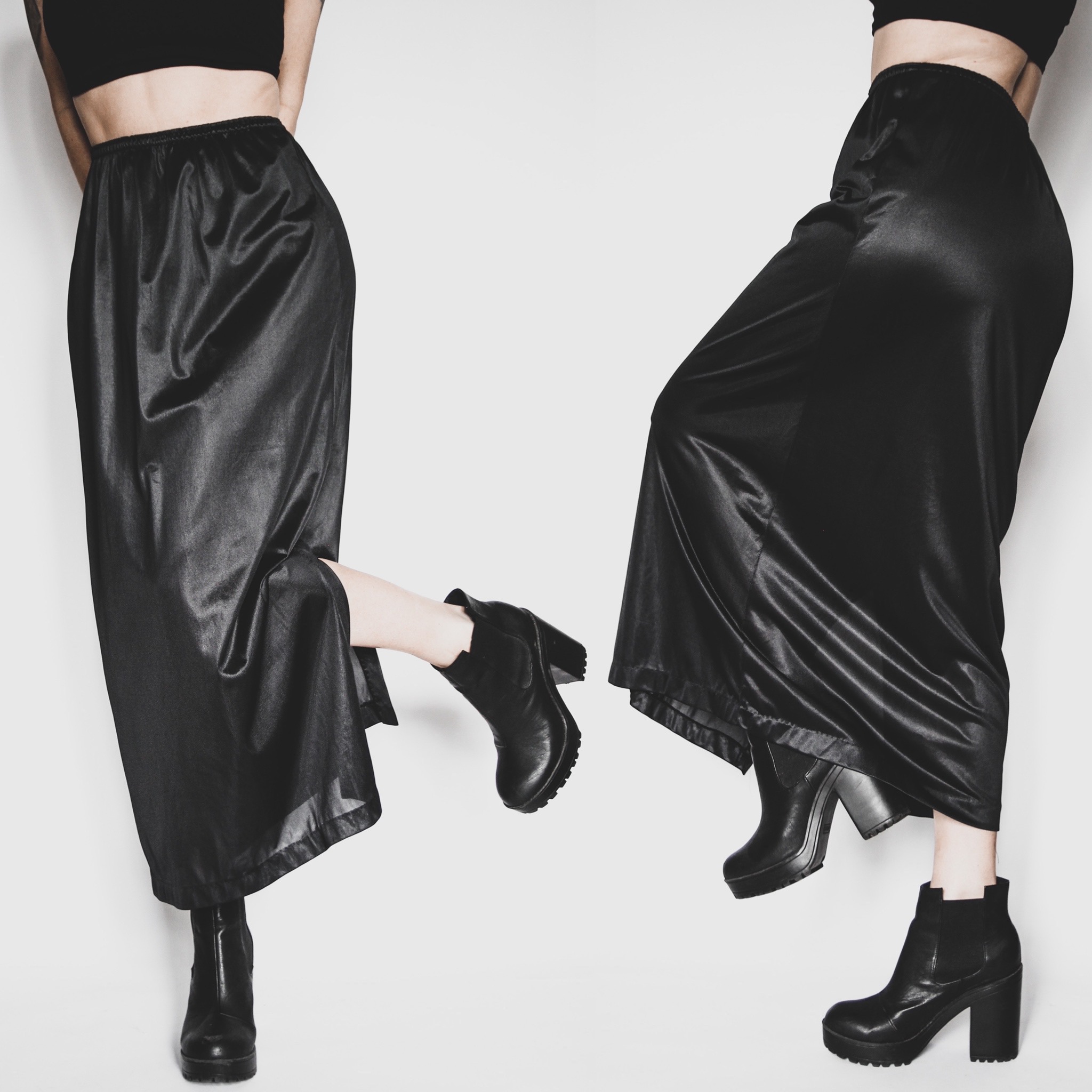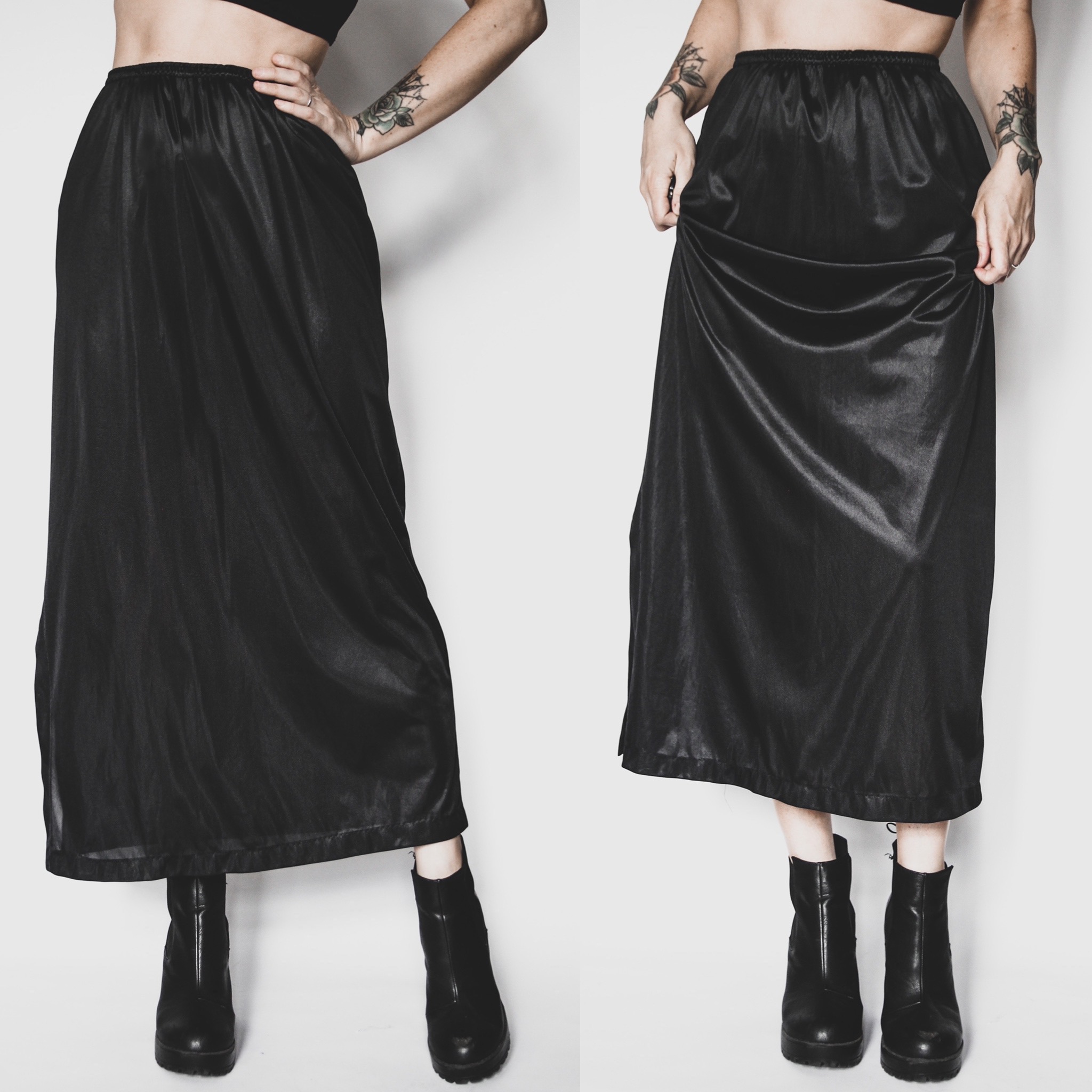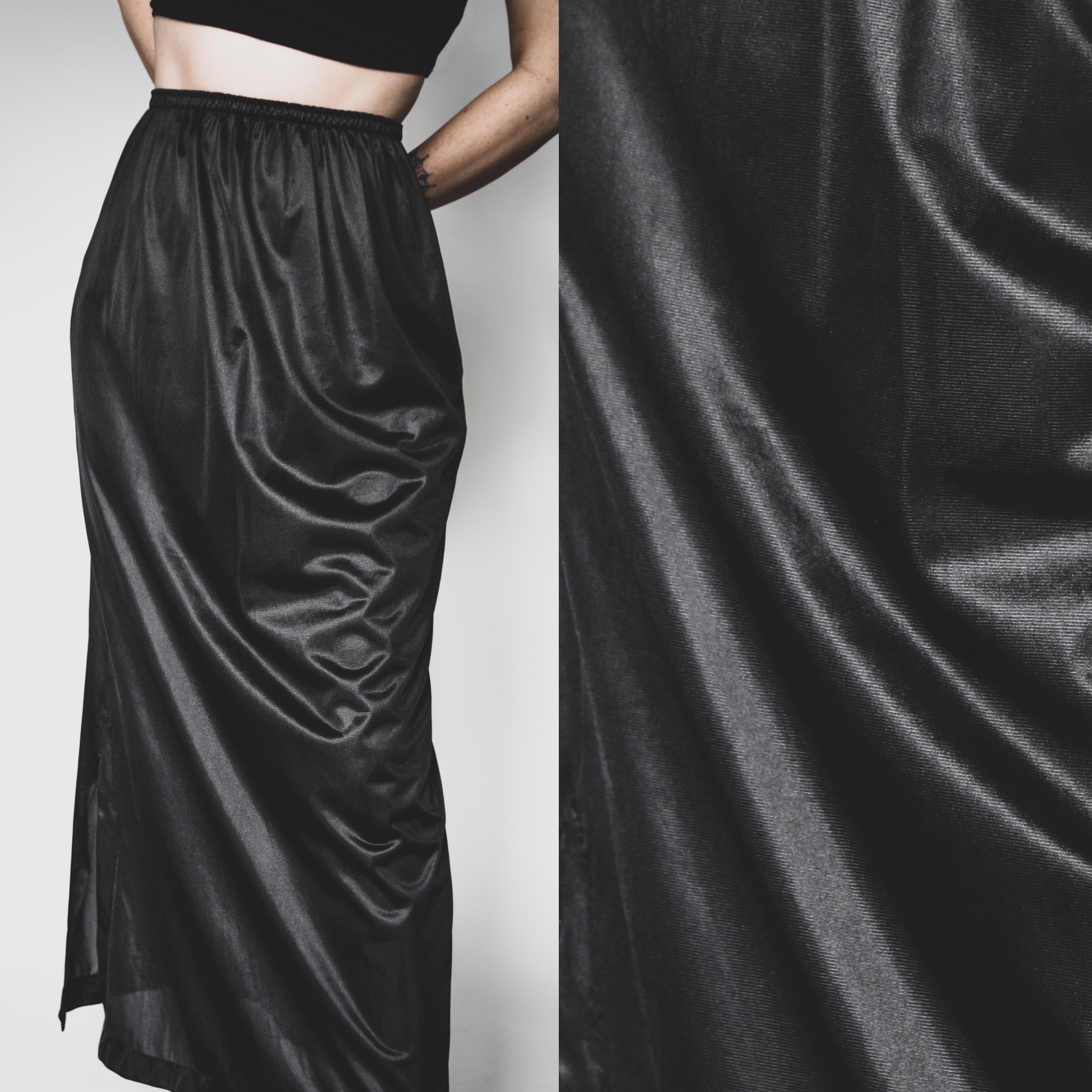 Vintage 70s Molyclaire black satin slip skirt. Maxi length, super simple and versatile! Stretchy elastic waist, pull on style. Perfect for layering under your favorite skirts and dresses. 100% nylon. Very lightweight, may be slightly sheer in direct light. Unlined, no stretch other than the waist.