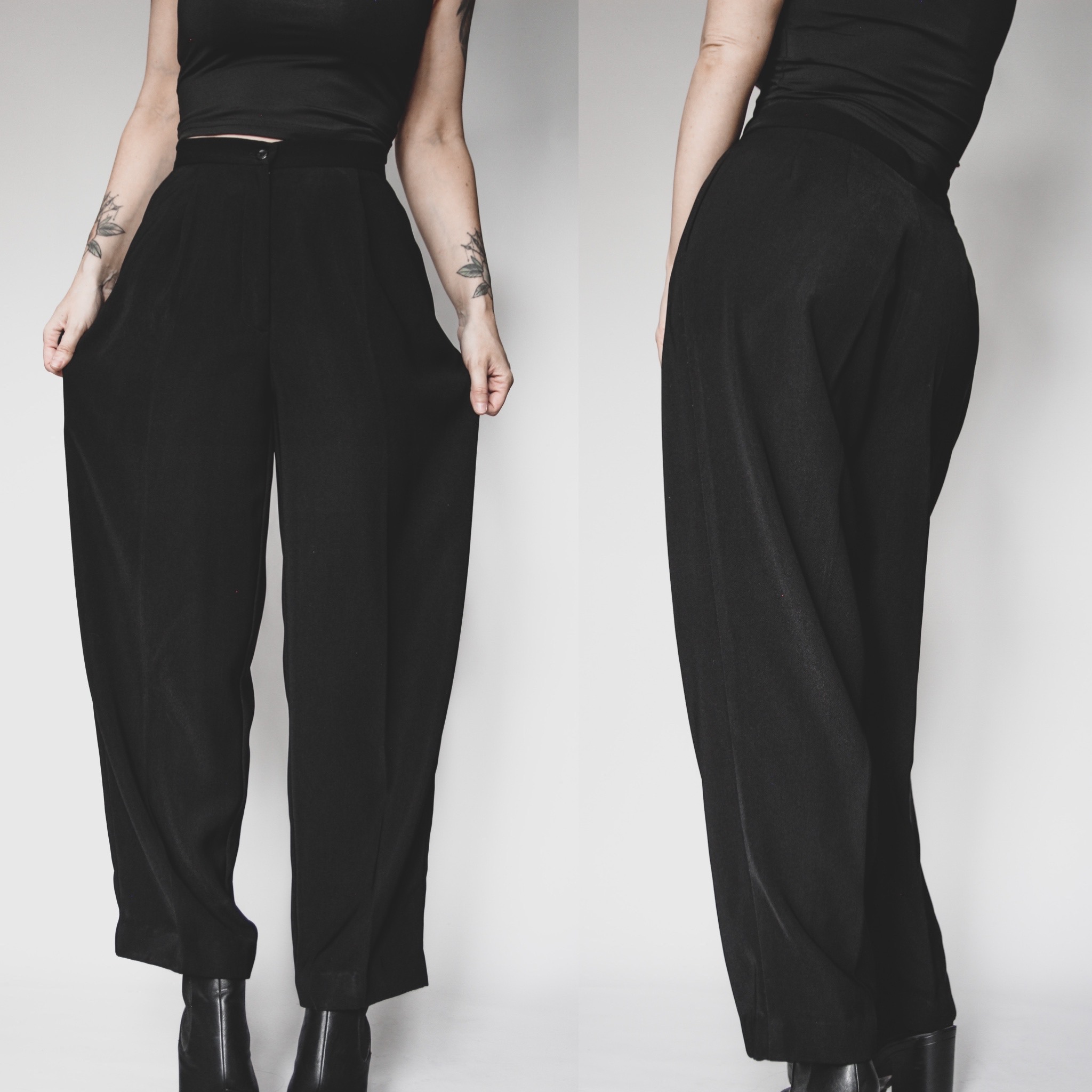 Vintage 90s Villager Petite by Lix Claiborne black trousers. Wide leg, pleated front, high waist with a flattering fit. Zip fly, button closure, and pockets! No stretch, unlined. 100% poly, feels like classic midweight suit pants, but softer, nice and flowy!