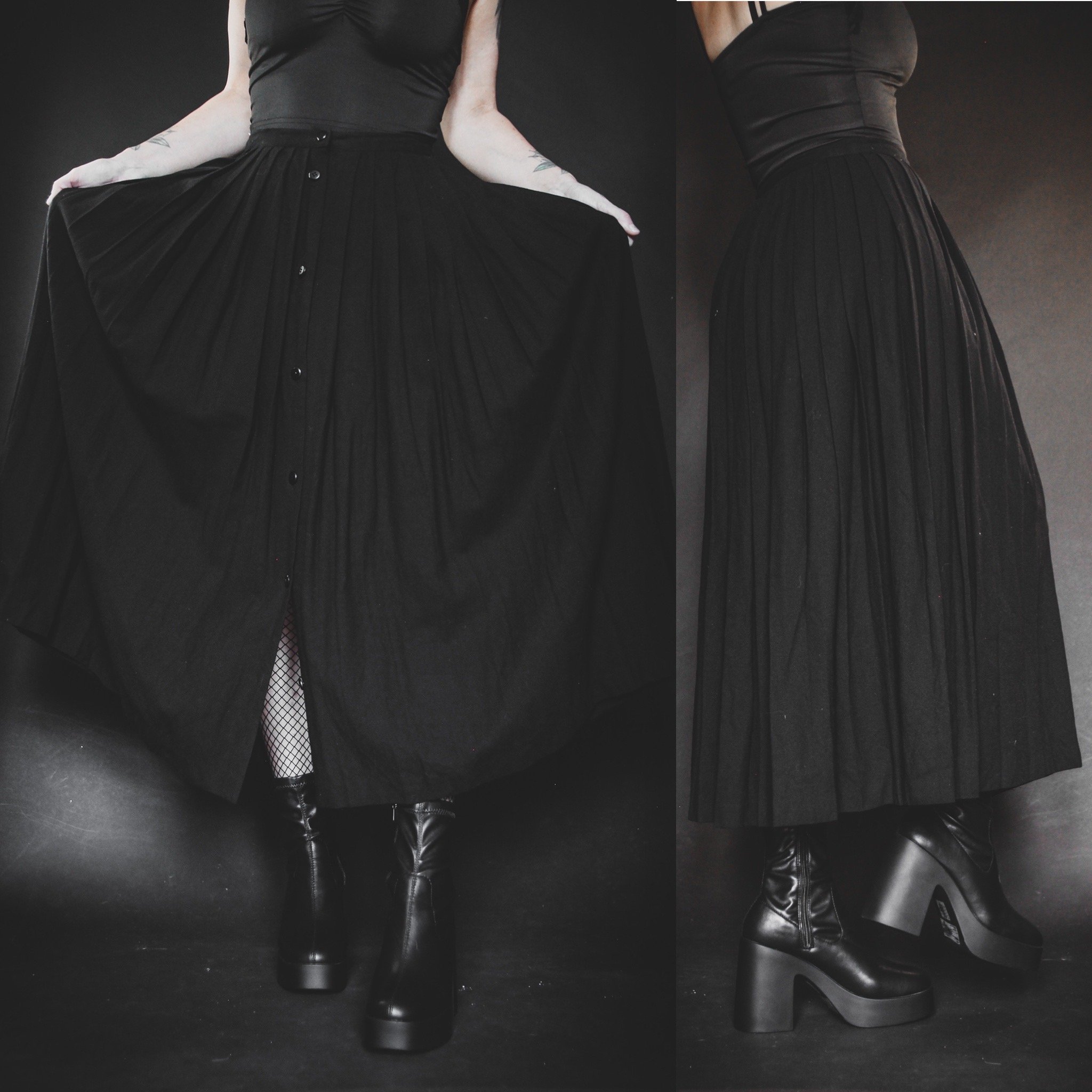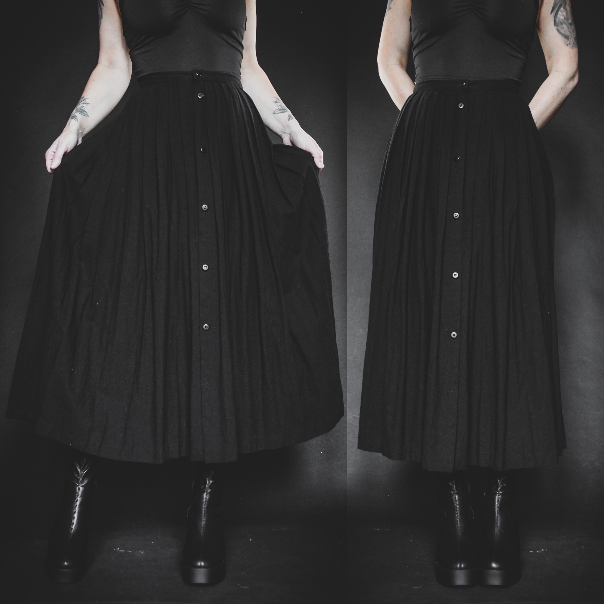 Vintage 70s 100% wool skirt by Quebec designer Michel Robichaud for Irving Samuel. Sturdy pleats with functional buttons down the front. Unlined, no stretch. Thick and warm, perfect for fall and winter. This one will have some itch factor if you're sensitive to wool, but layer it up with tights or leggings for a cozy cold-weather look and you'll be fine! This is a true collector's item and a gorgeous staple piece - so versatile and classic!