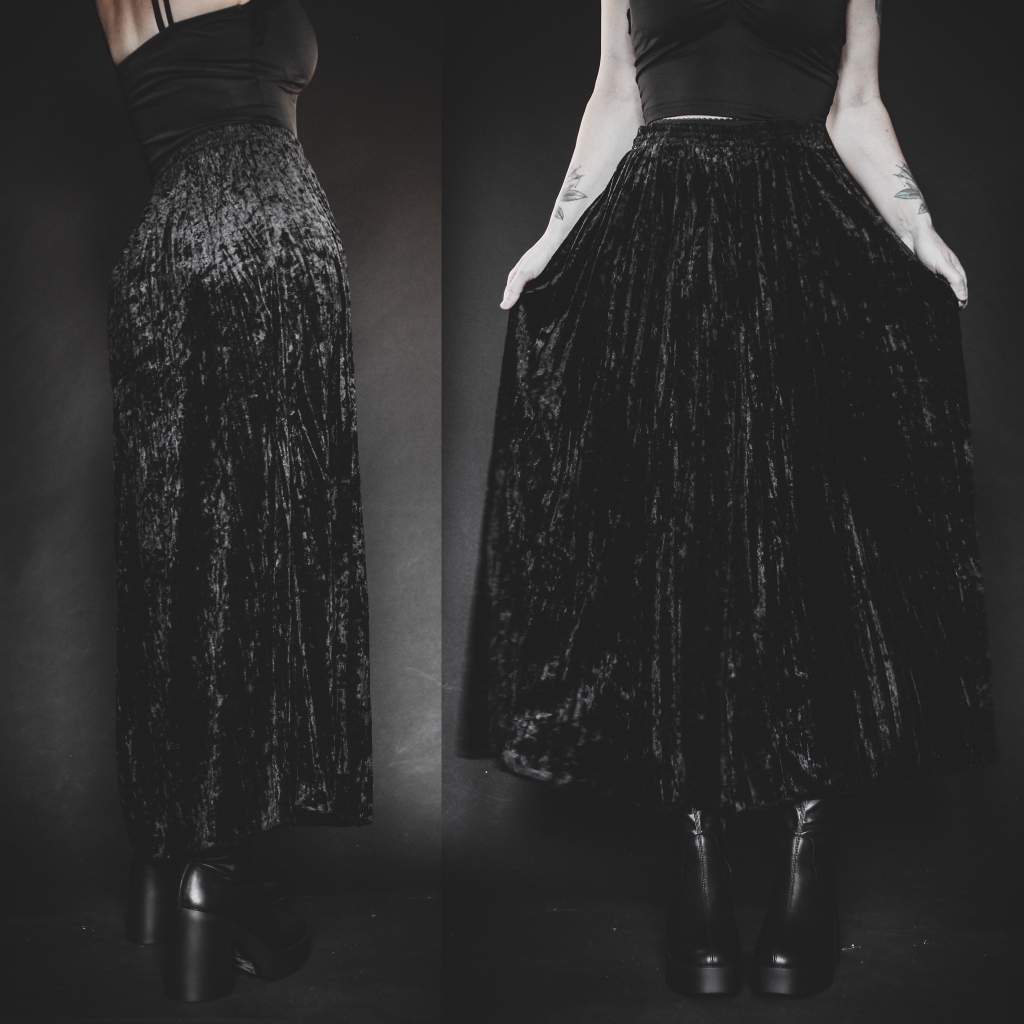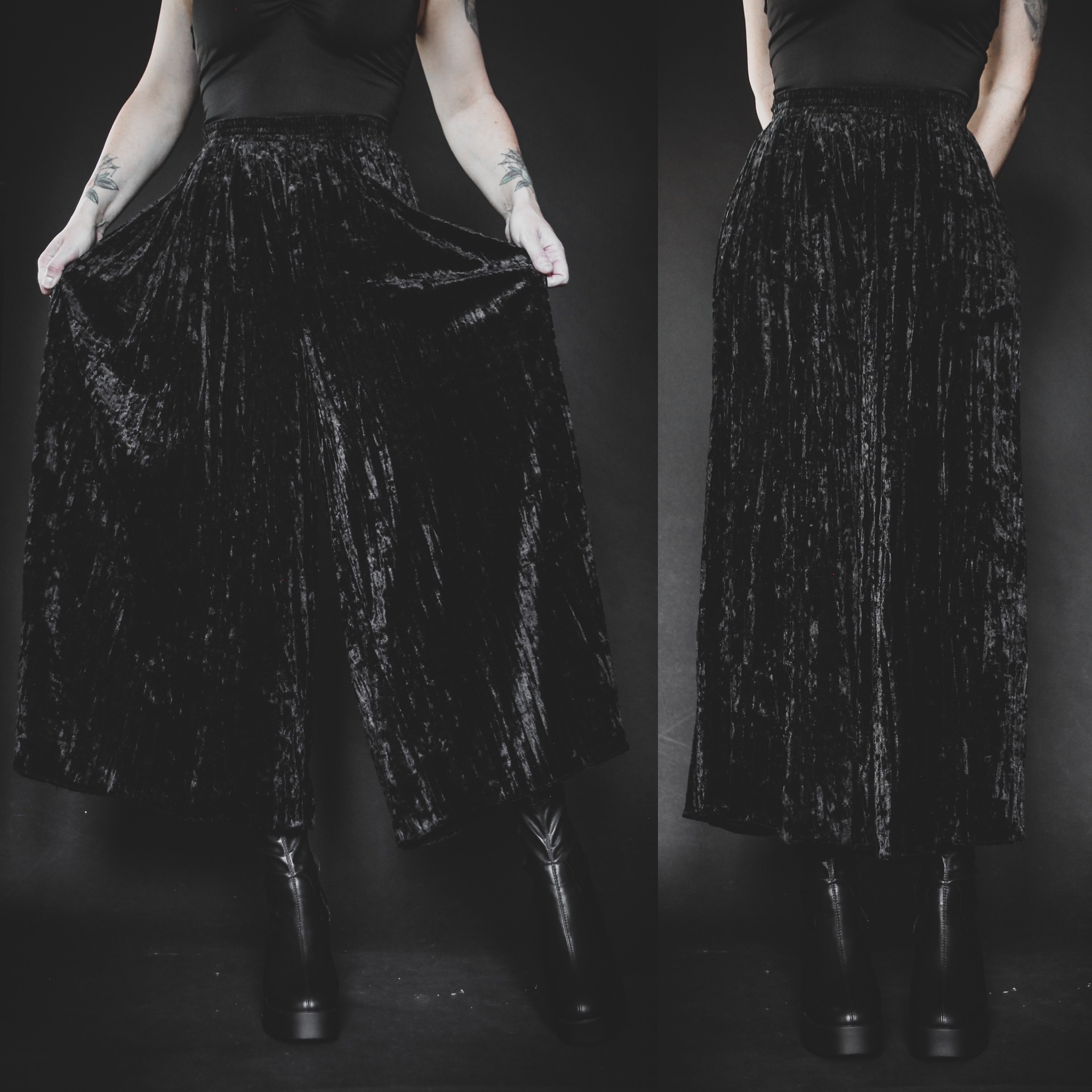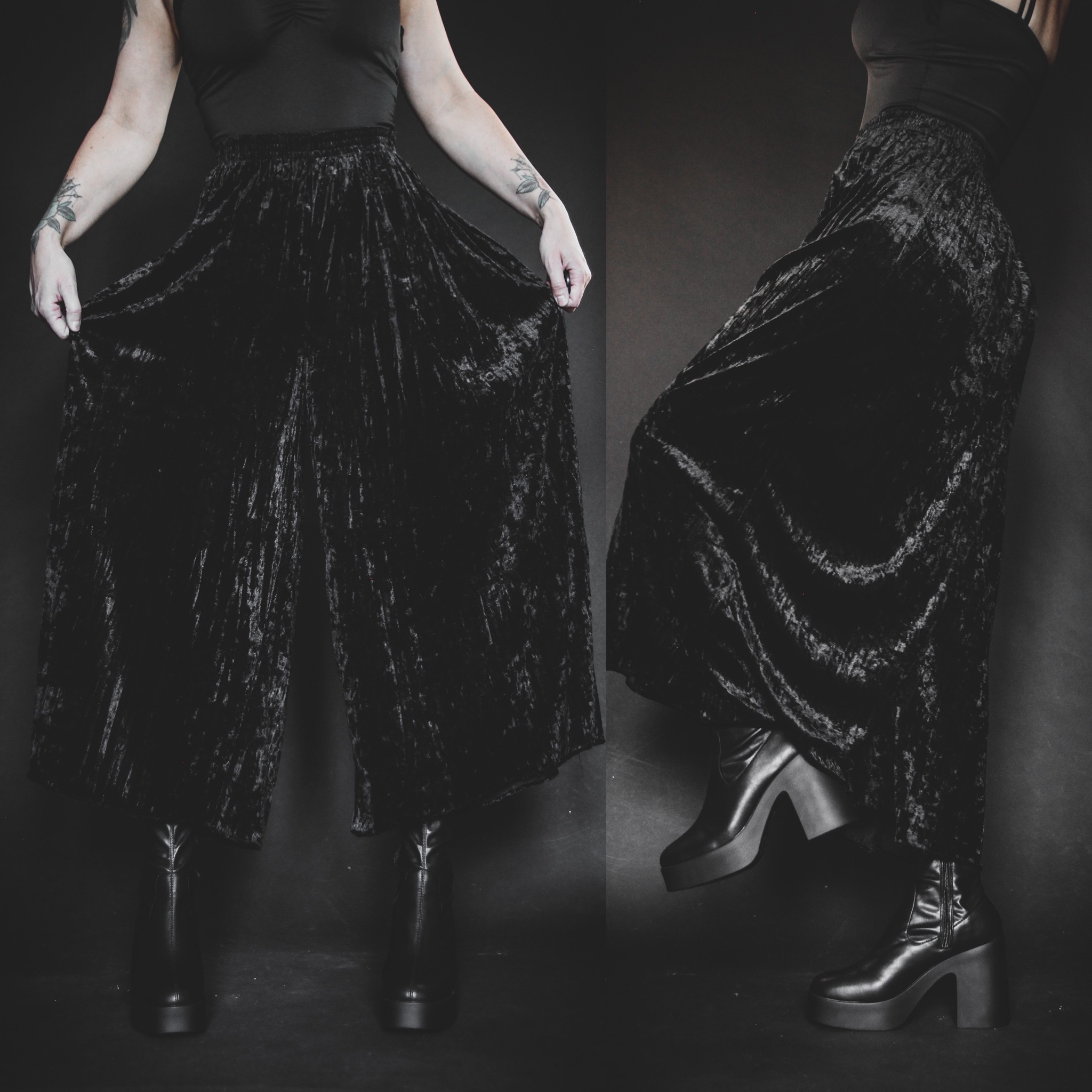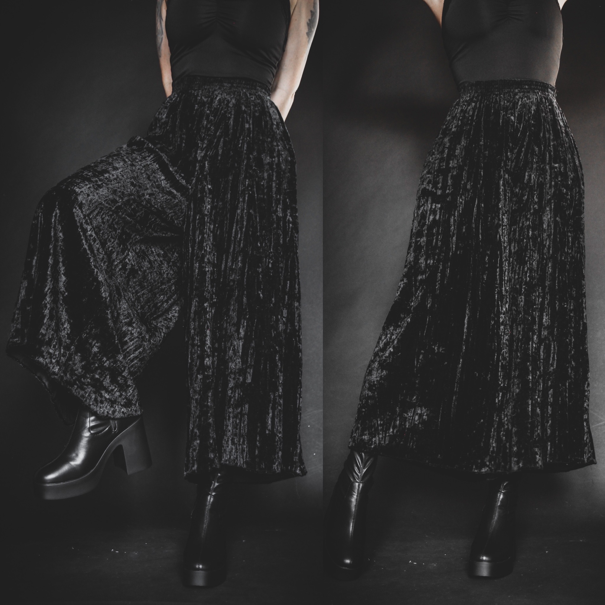 Vintage 90s black crushed velvet wide leg pants. These are so fun and versatile - they look like a midi skirt but are definitely pants! Stretchy all over, pleated poly-spandex. Wide leg, ankle length (slightly cropped), high waist with a flattering fit. Pull-on style with a wide, comfortable ruched elastic waistband. Unlined.