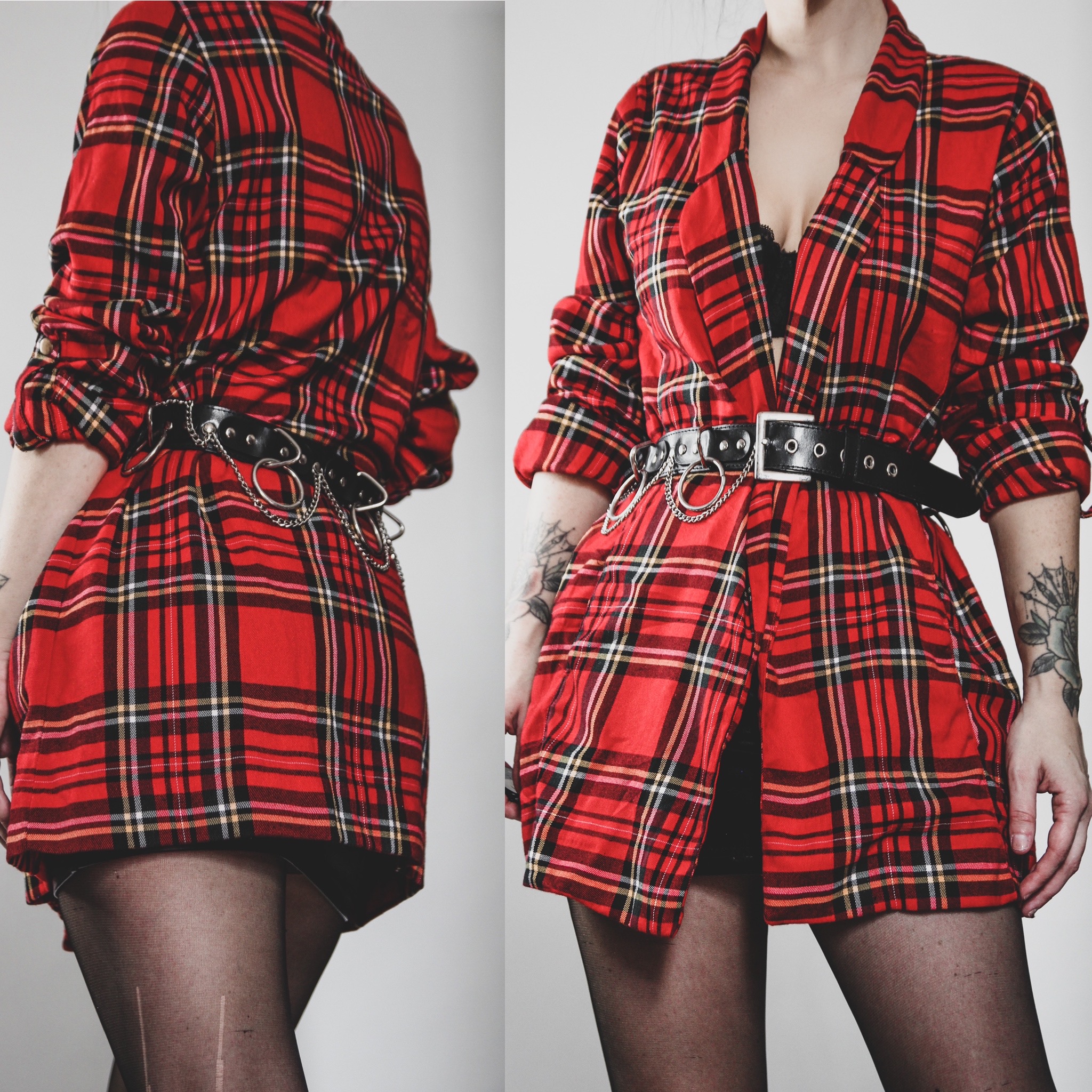 Vintage red plaid longline blazer. It's giving Vivienne Westwood meets Gossip Girl. So classic for fall and holiday looks! Midweight, super soft polyester-viscose blend flannel. Side pockets, open front, foldover lapels. Hidden tabs inside the sleeves so they can be cuffed and buttoned at elbow length. No stretch, unlined. Belt is not included. Style with trousers, a mini skirt, or belt it over your favorite dress!