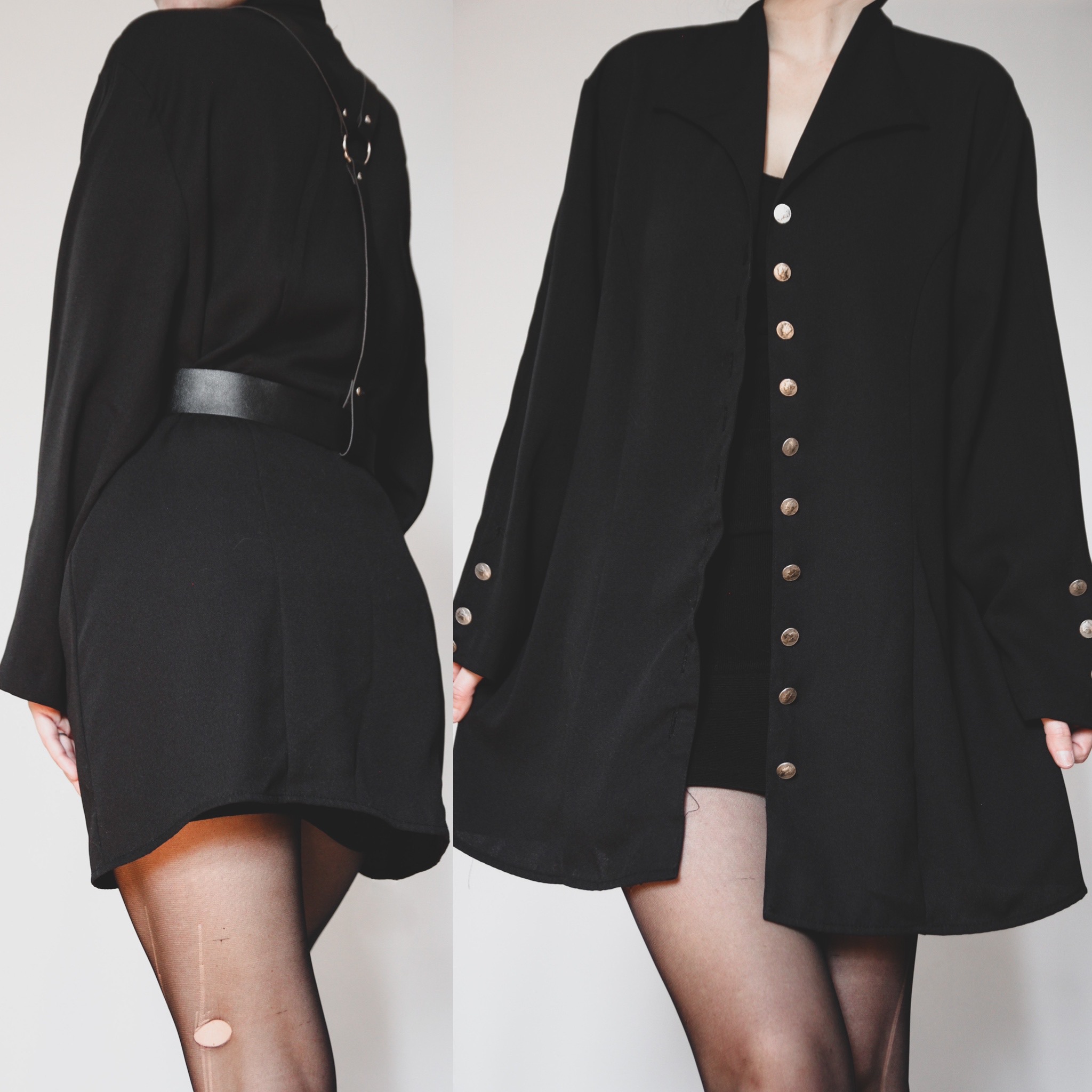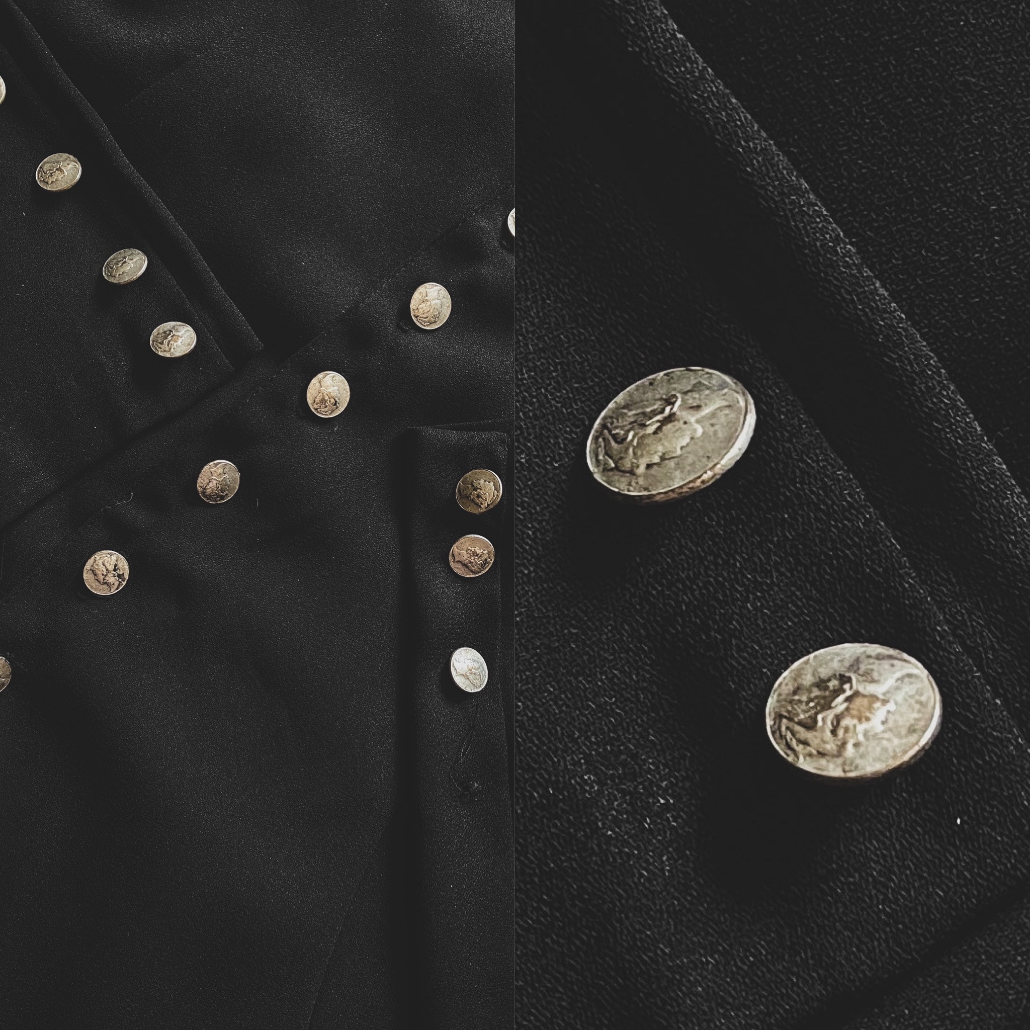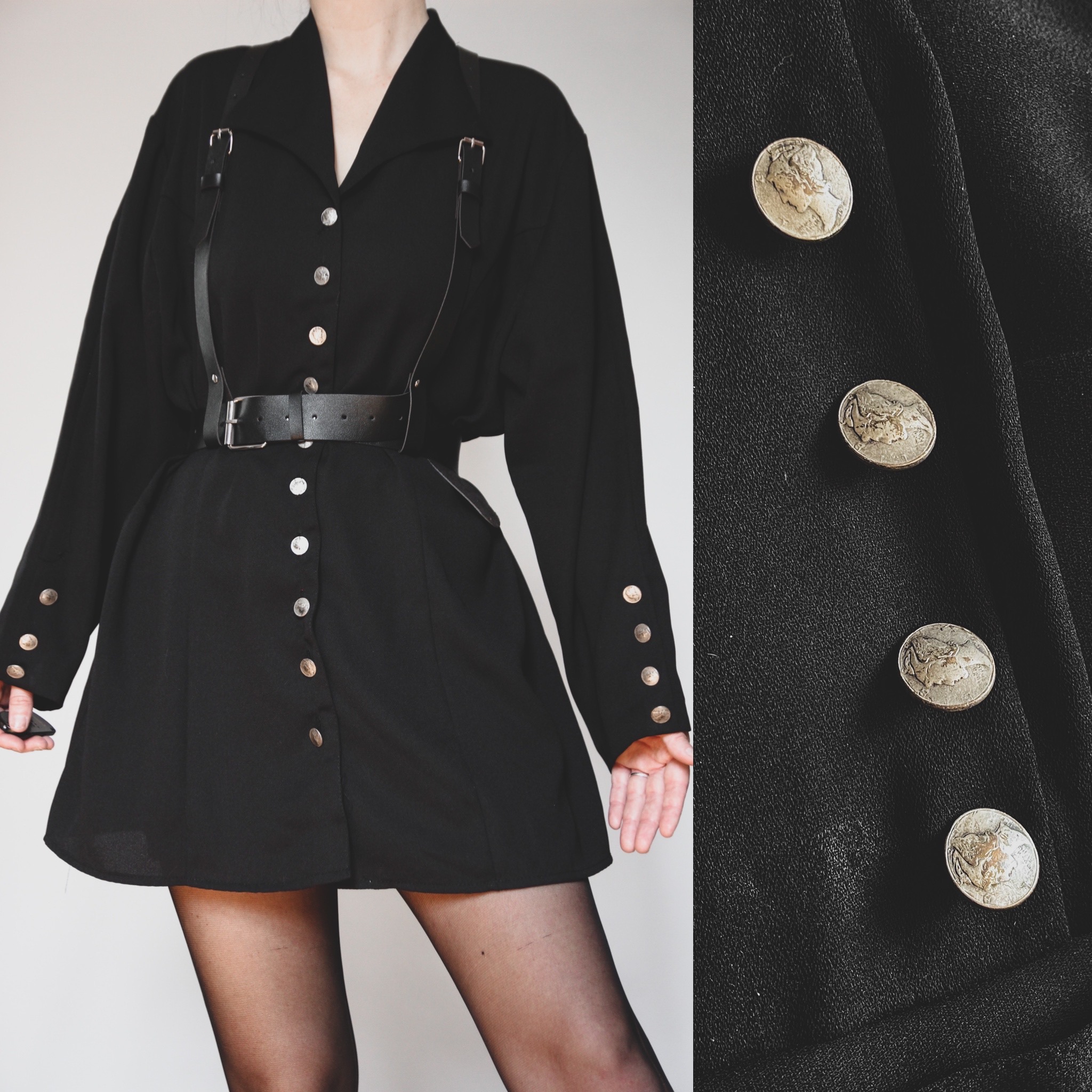 Vintage 80s Mia black polyester blouse. This one is so cool! Longline cut, slightly fitted, with loose 3/4 sleeves. Pointed vampire collar and cameo coin style nickel buttons down the front and up the sleeves. It's giving Black Parade meets Civil War with a bit of Victorian edge?! No stretch, unlined, lightweight fabric. Harness is not included!