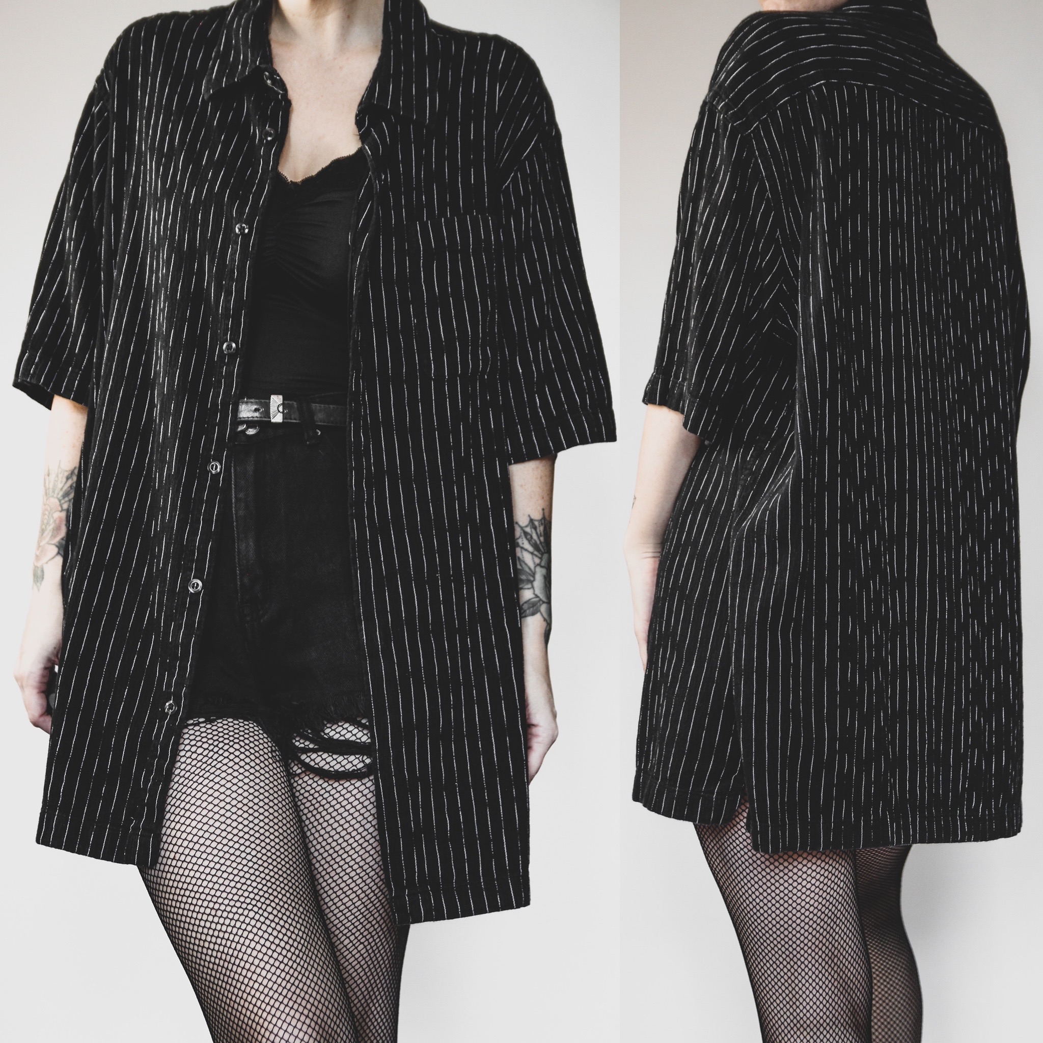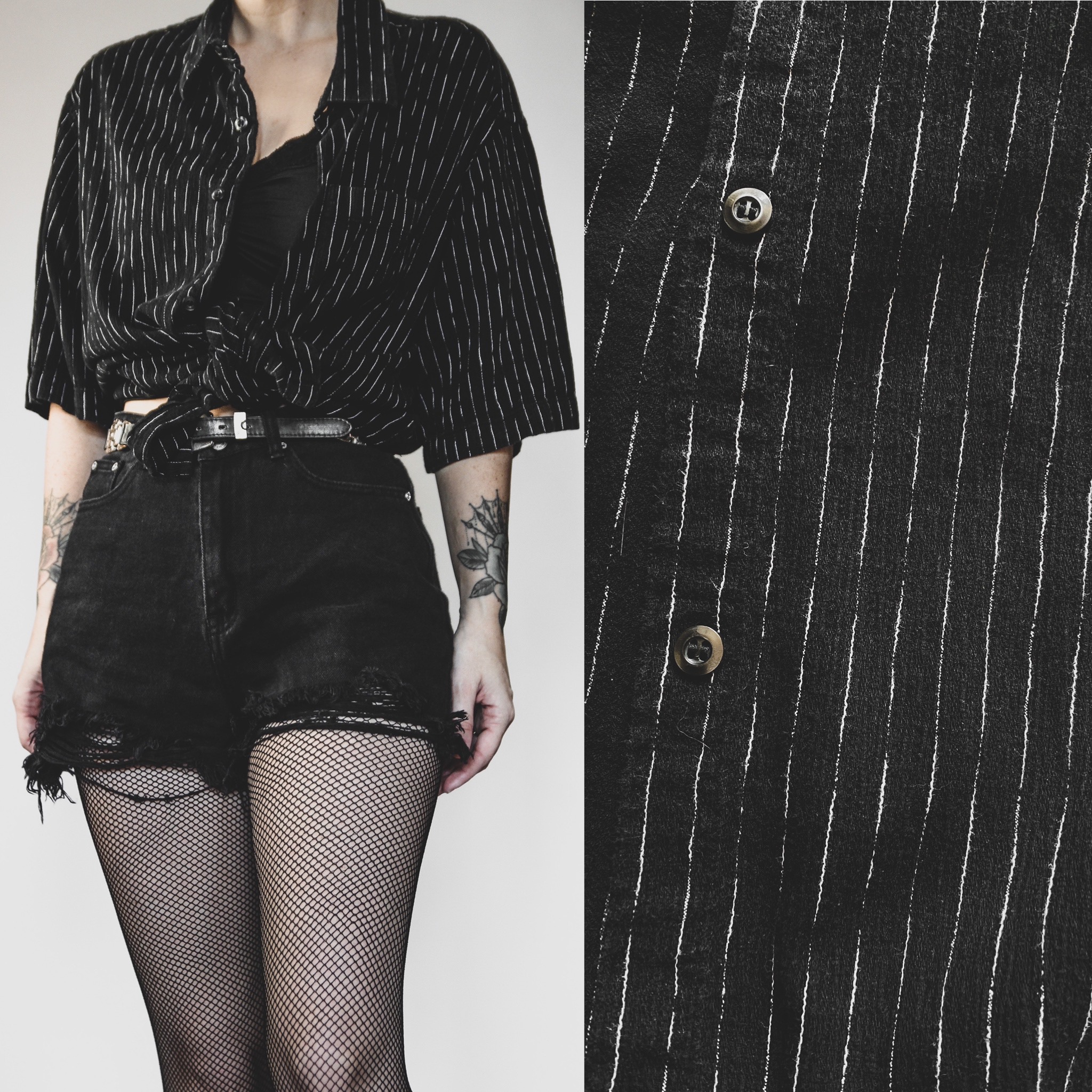 Vintage 90s short-sleeve button down top in black with white pinstripes. The most perfect oversized, slouchy throwover shirt! 57-43 cotton-rayon blend. No stretch, unlined. Lightweight fabric, great for fall mornings and for layering without bulk! Throw it on over all your casual fits for a cozy grunge vibe. Super soft and perfectly broken in.