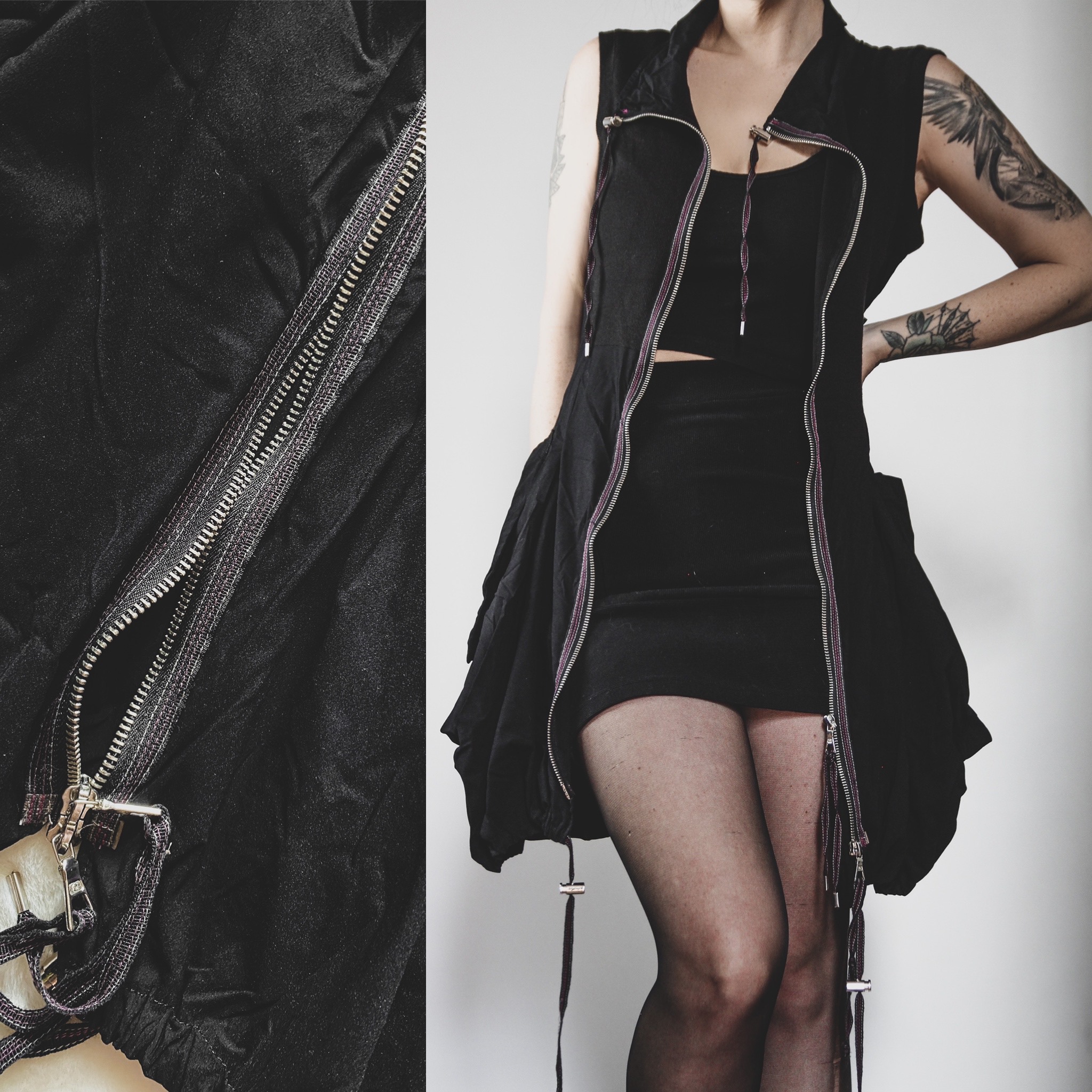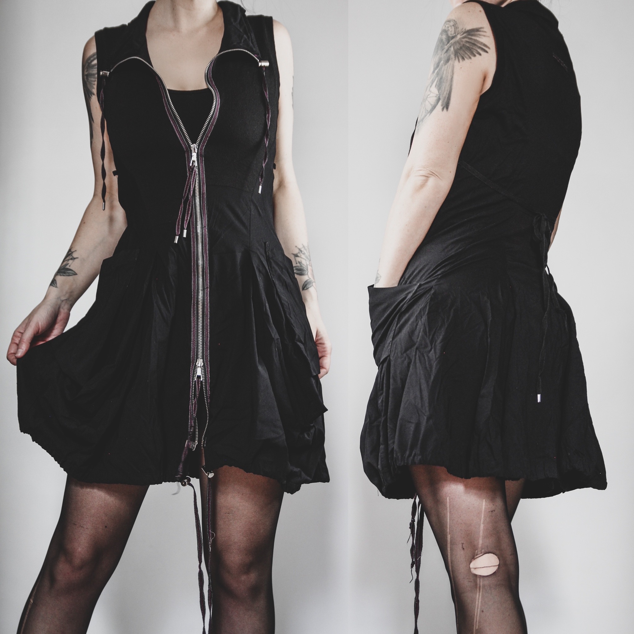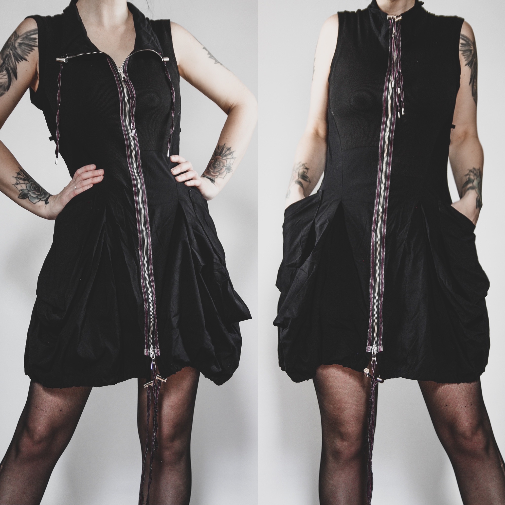 Vintage 90s cargo dress. This one has so many awesome details! Fitted sleeveless cut with a rib knit top. Two-way front zipper so you can leave it open at the top, bottom or both! Roomy outside hip pockets. Draped parachute skirt with a cinchable drawstring tie around the hem. High neck that can fold over into a collar. Purple accent thread trim near the zippers. Poly, spandex and lycra blend. Very comfortable and so on-trend right now! Unlined, stretchy from the waist up.