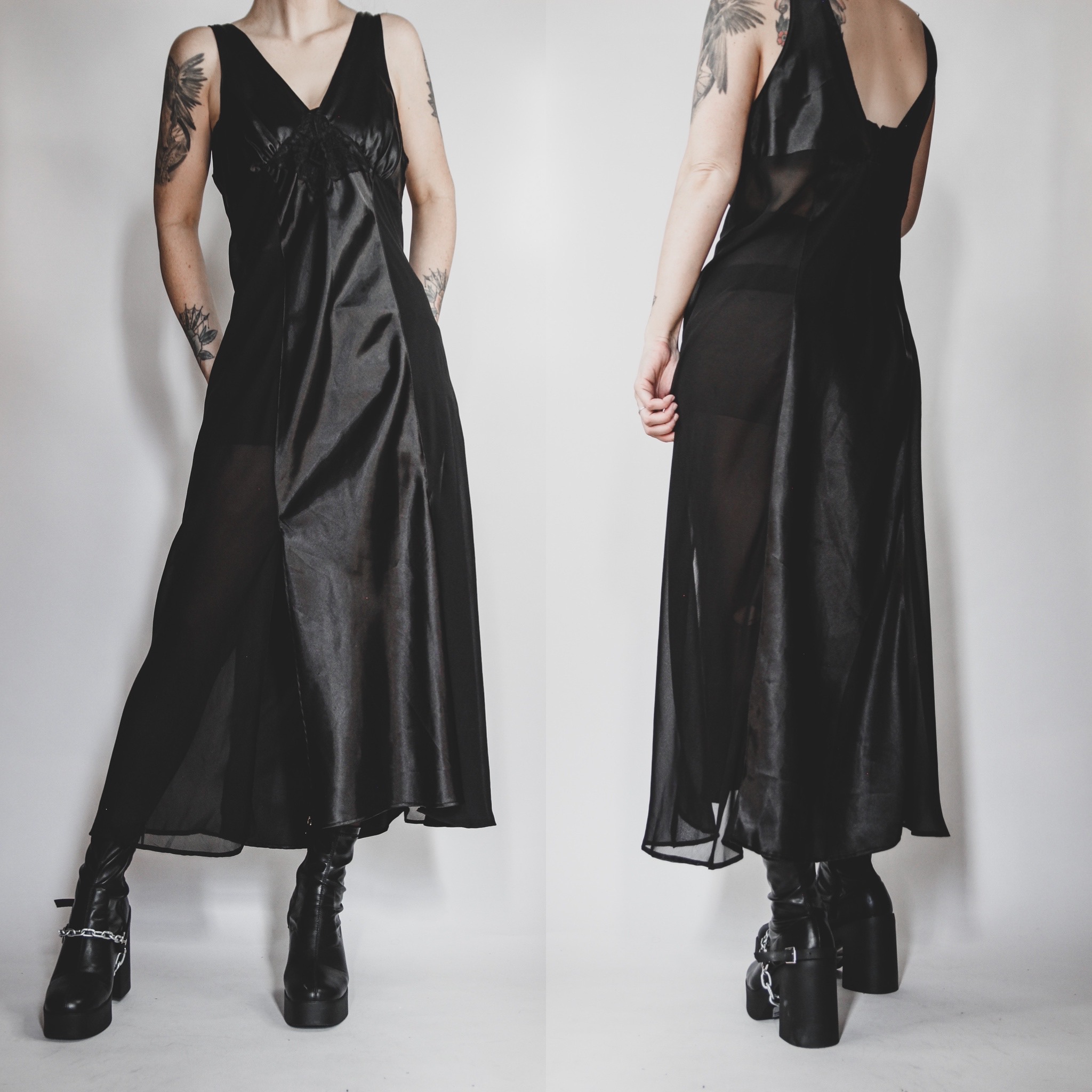 Y2K 80s-style black satin nightie. Poly fabric with no stretch. Sleeveless cut with a plunging v-neck and back, ruched contoured bust, sheer lace applique cutout at the front, and an empire waist. Sheer side panels with double front slit. Fully unlined, can be worn as loungewear/sleepwear or layered up for daytime. Belt and liner pieces are not included.